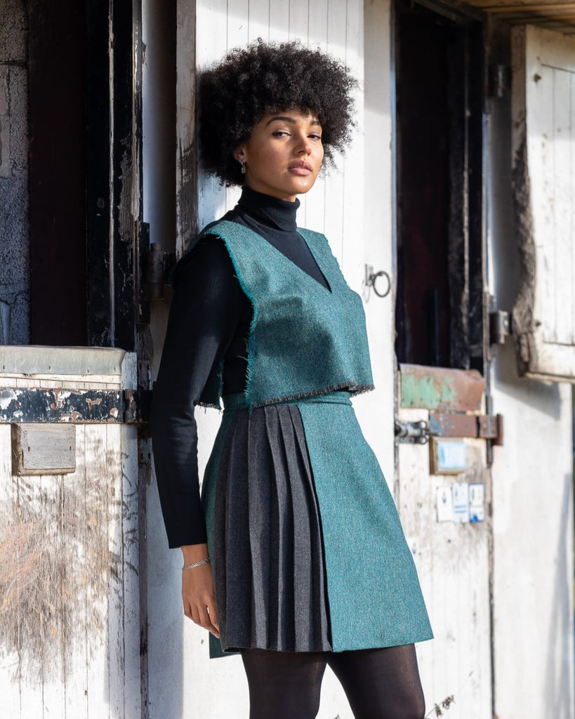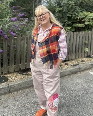 Like Vivienne Westwood we are passionate about salvaging and repurposing fabric waste. Our fabric expert Dawn is also an expert at finding the use in everything! Dawn has transformed a stunning Donegal Tweed scarf into a waistcoat here, on many a garment she likes to embroider and patchwork fabrics together to create unique pieces inspired by the Yorkshire countryside.
