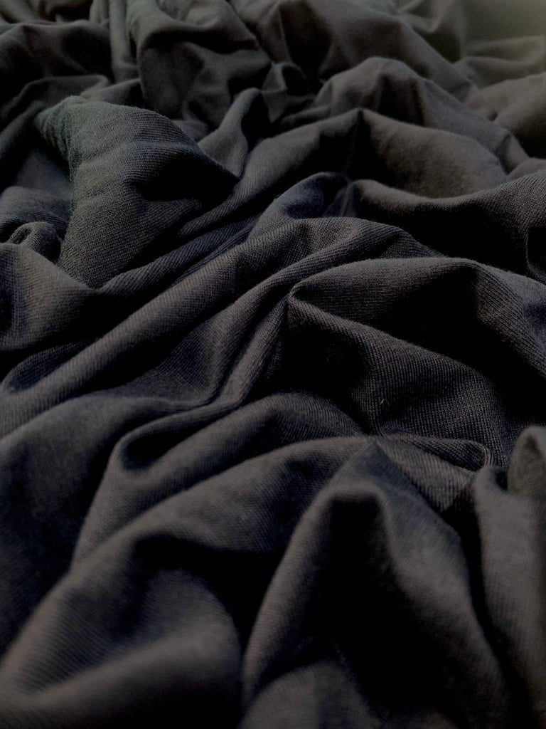 A soft black cotton-elastane single jersey fabric twisted to highlight its fluid drape and stretch. This lightweight yet opaque fabric has a smooth, matte finish, making it perfect for T-shirts, dresses, and stylish gathered designs.