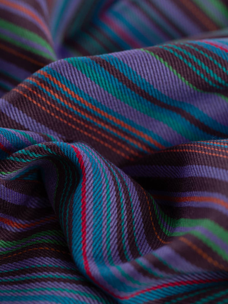 Angled view of wool blend fabric in the Hypnotic Stripe design, showcasing a captivating palette of deep purple-lilac, turquoise, teal, and contrasting pops of orange, ruby pink, emerald green, and aubergine. The repeating vertical stripes create a mesmerizing and artistic effect, perfect for creating bold statement upholstery or standout furnishings.