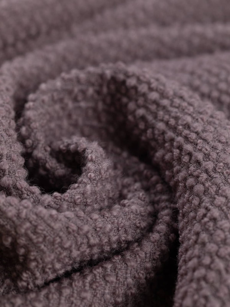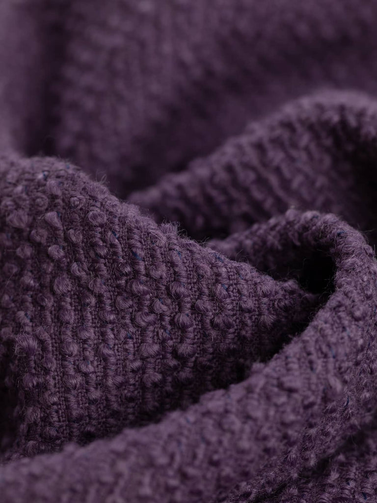 Angled view of Regal Amethyst bouclé wool mohair blend fabric, showcasing its rich jewel-tone purple with subtle grey undertones. The fabric’s intricate horizontal stripes, created by chunky bouclé yarns, form a rhythmic pattern, with raised bobbles catching the light and adding a soft lustre to the rich hue.