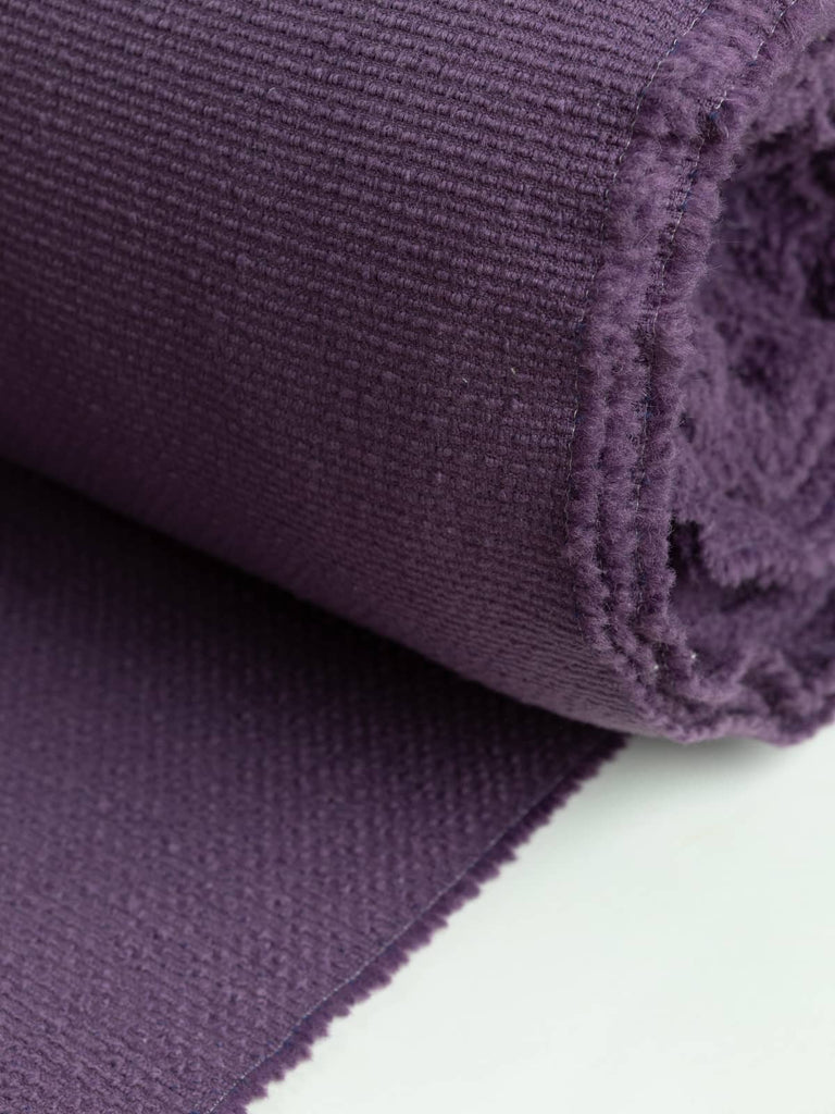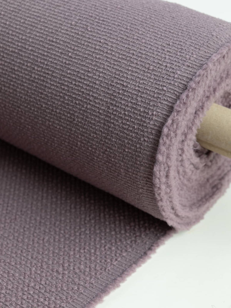 An angled roll of Nightshade hopsack fabric, showcasing its deep, rich purple hue. The solid, dark colour is intensified by the fabric’s tight, durable weave, with the lightly brushed surface giving it a luxurious, dramatic appearance.