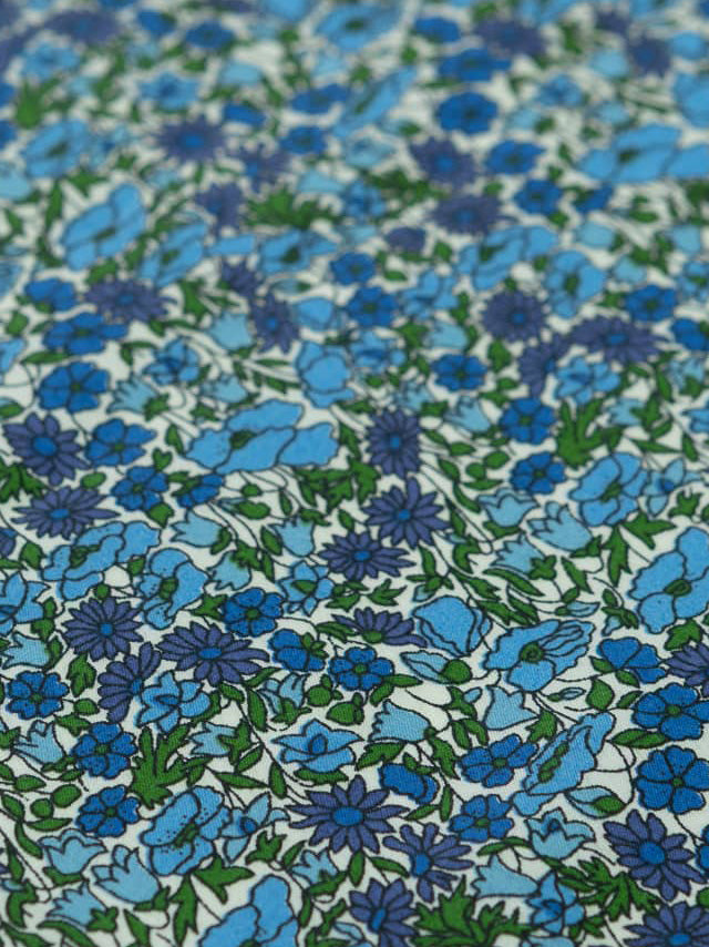Shades: This delightful Liberty-style lawn aptly named "Poppy & Daisy" is printed with a riot of pretty flowers; summer sky blue- poppies, ink-blue aster daisies, royal blue primulas and delicate blue-harebells. Rich fern green foliage adds the final flourish to this ditsy floral classic.