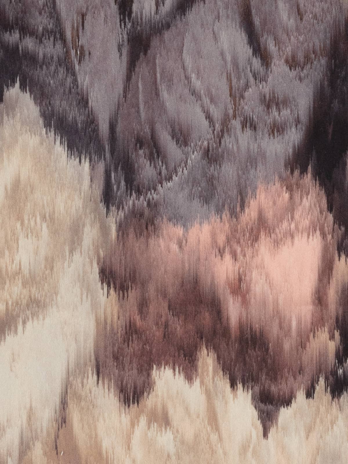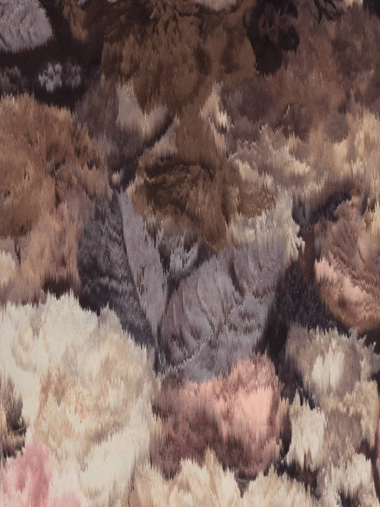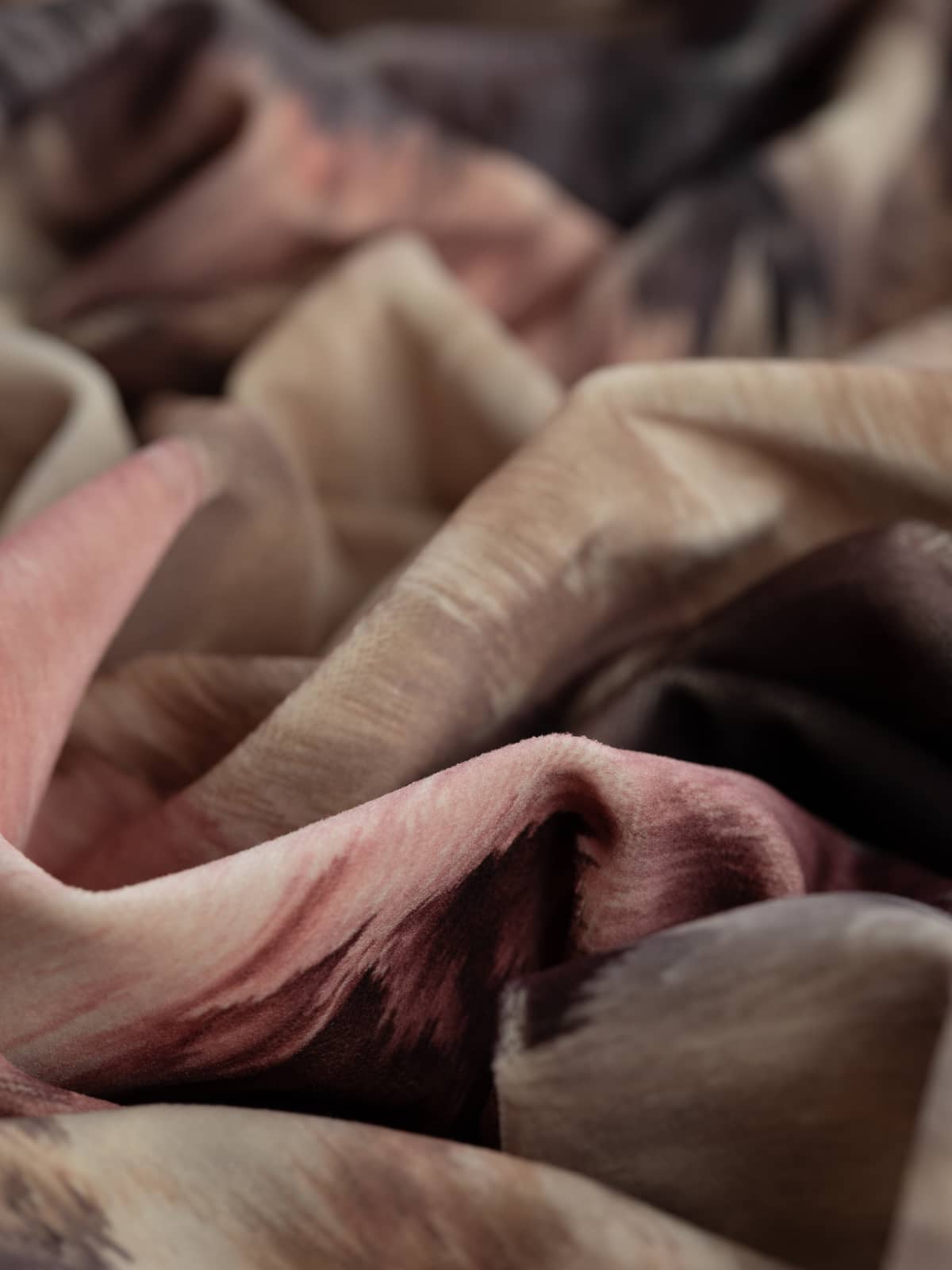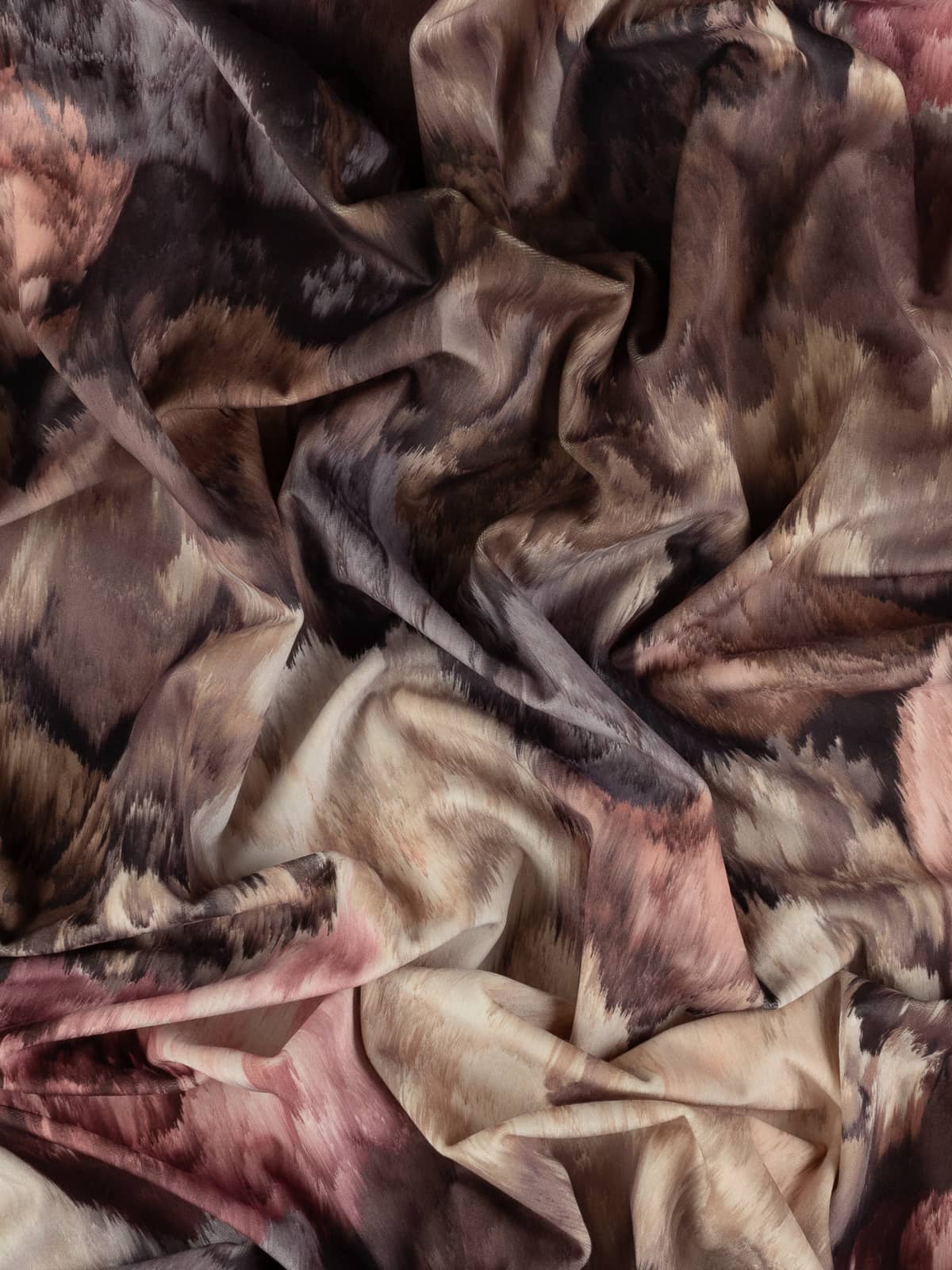 A decadent dark chocolate background adds moody drama to a palette of rumpled, antique silk boudoir - hues of vintage shell pink, antique pewter, warm lilac-taupe, tobacco leaf brown, bisque and parchment. Team this Vintage Boudoir creation with similarly hued solid velvets for an indulgent coordinated style.