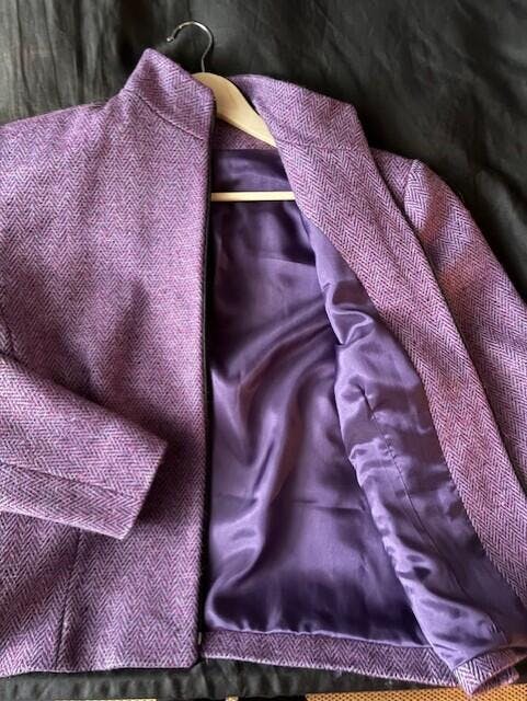 Heavier gauge yarns of alternating rich plum (flecked with Donegal neps) and grape pink are woven on the weft, throughout a melange yarn warp of violet-blue - redolent of the juice from foraged bilberries.