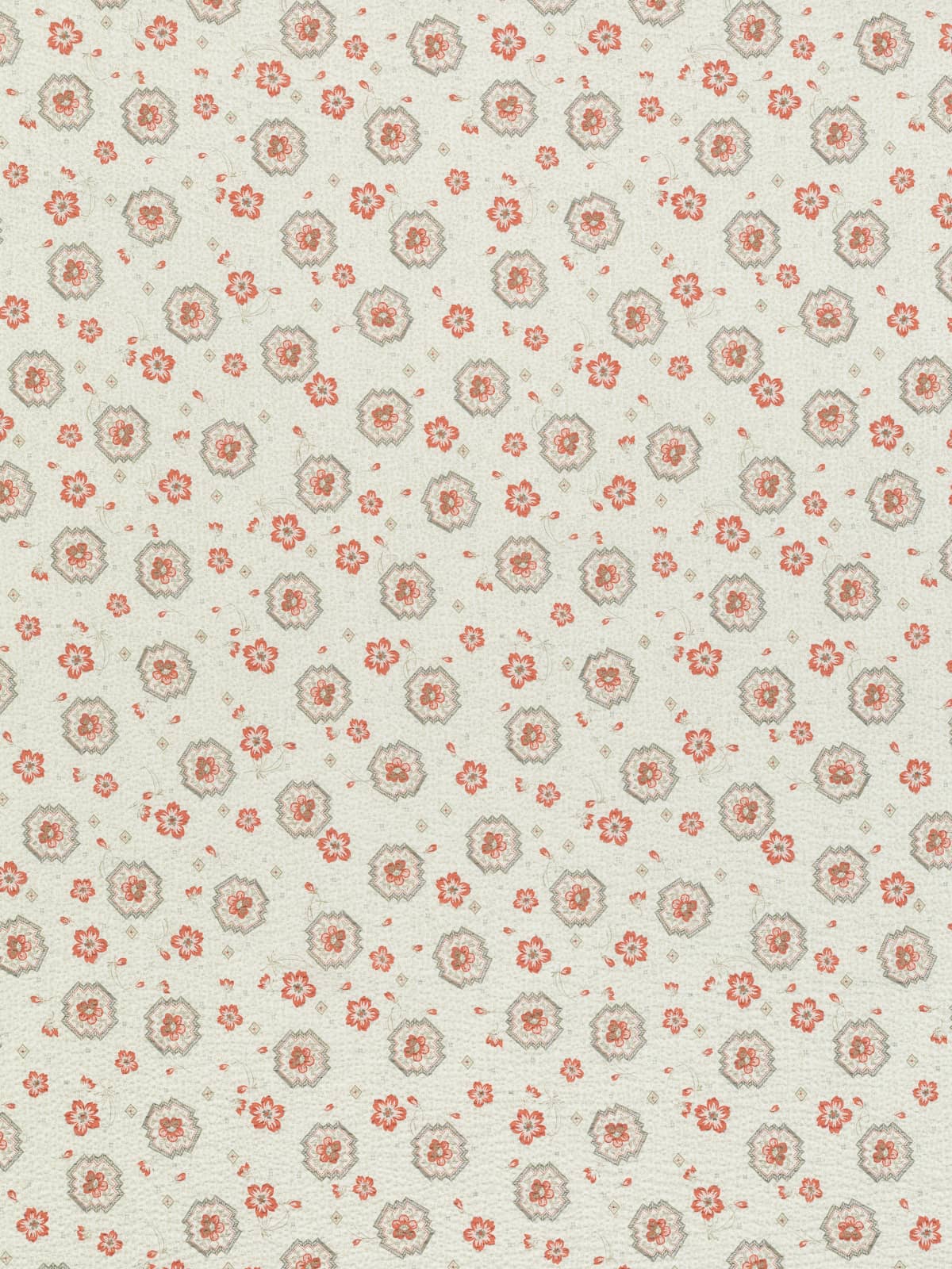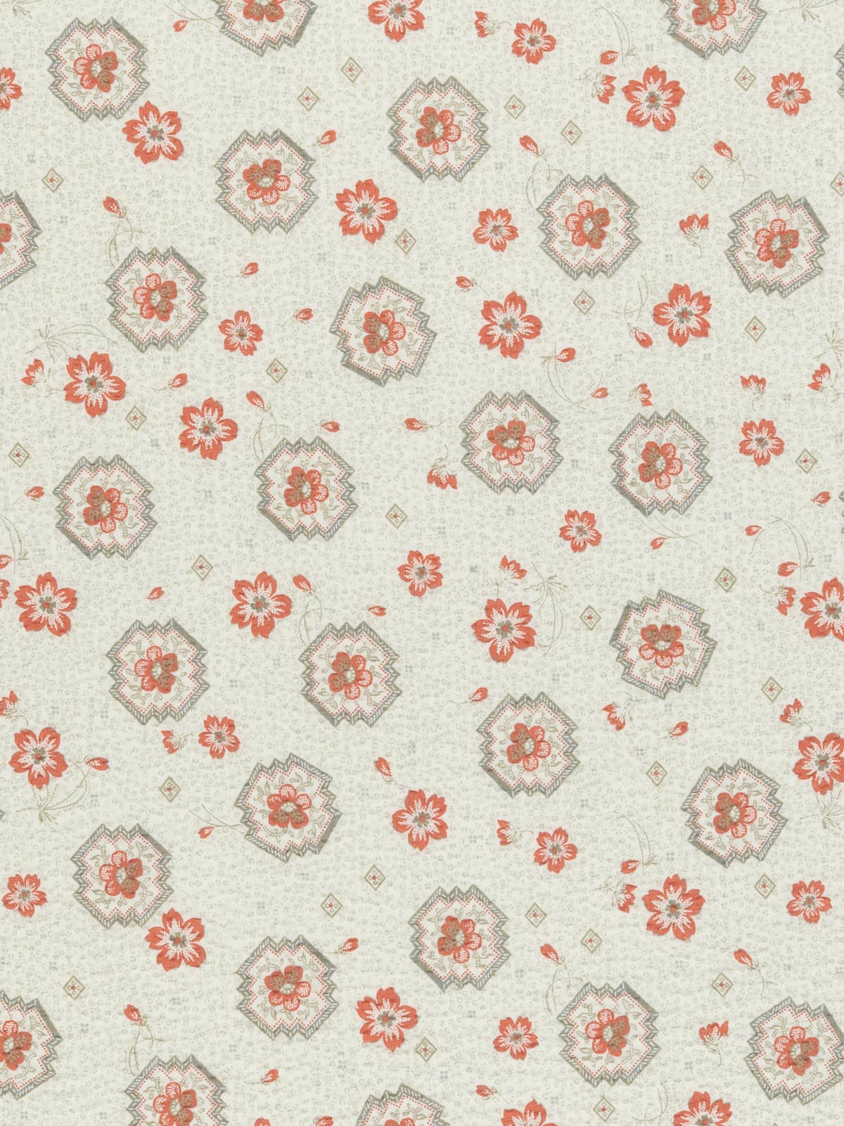 Shades: A natural white base plays host to a muted, vintage-style palette, where grey-taupe forms the mottled background and framed tile motifs, while the primrose flowers are printed in a soft, muted terracotta hue.
