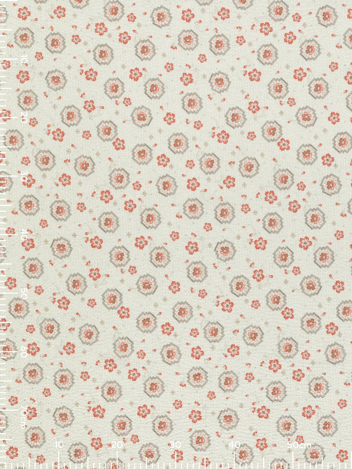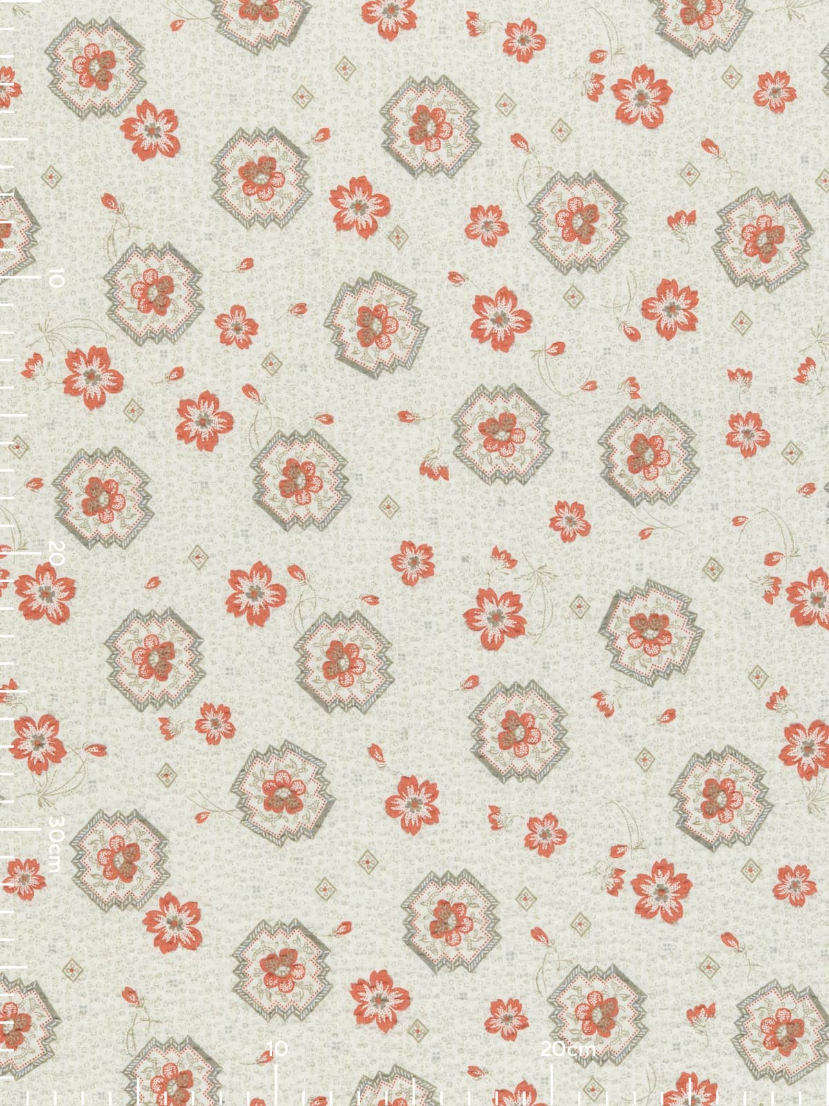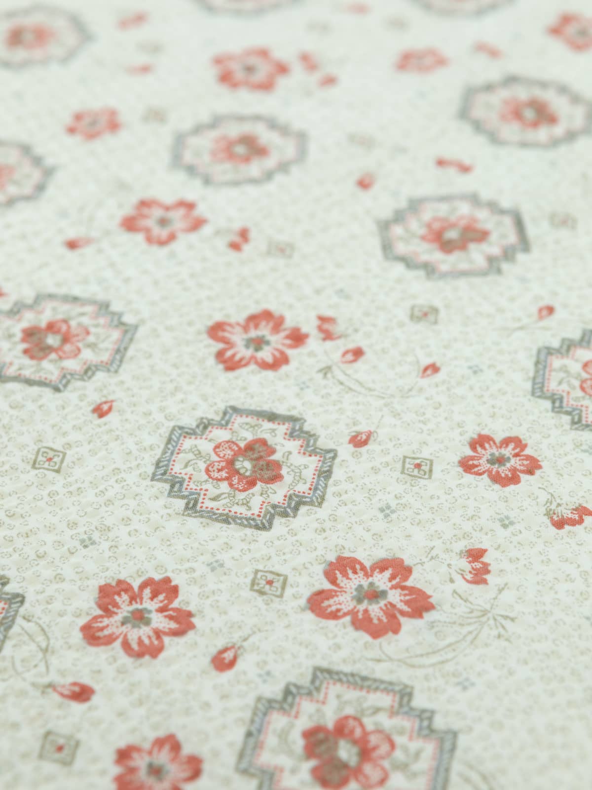 Design: This pretty cotton seersucker fabric is printed with a vintage-style design of sweet primrose-like flowers, placed between motifs reminiscent of vintage ceramic tiles. A mottled background adds a ditsy feel, further emphasising the nostalgic charm of the design. The palette remains intentionally simple, celebrating a faded, time-worn elegance.