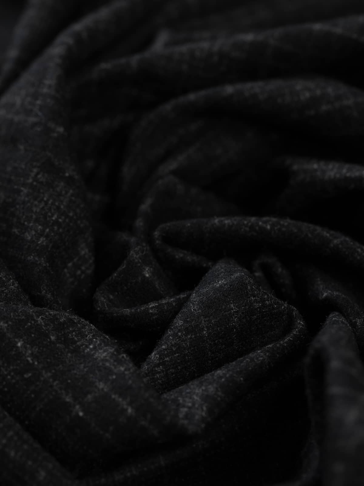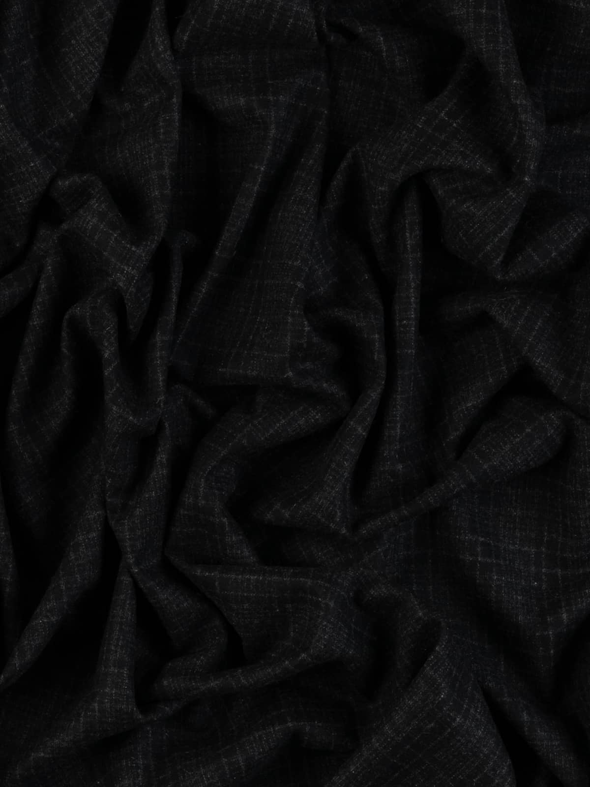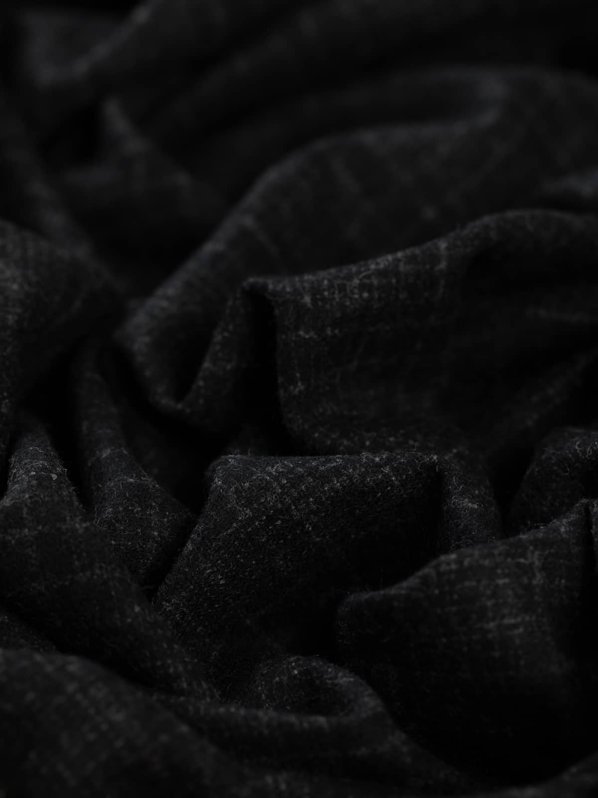 Shades: Classic black and silver grey carefully woven in the finest woollen yarns to produce an elevated wool flannel with a dark and almost sketchy check, with all the mystery of Moonbeams and midnight.