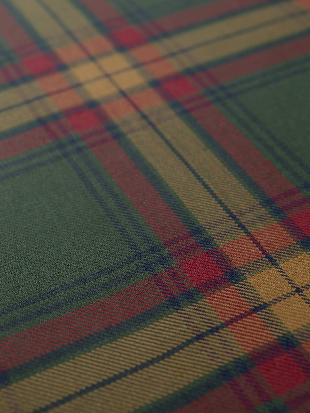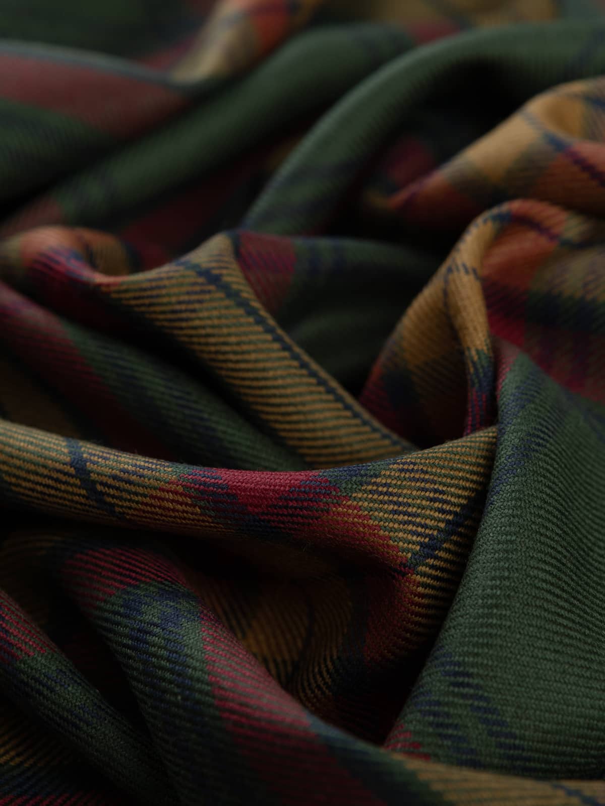 Shades: A warm, traditional palette built around deep forest green, rich claret red, and muted golden tan. These earthy tones are balanced by slim navy accents that darken the intersections and refine the overall depth of colour. The combination produces a grounded, autumnal look with a classic Highland feel.