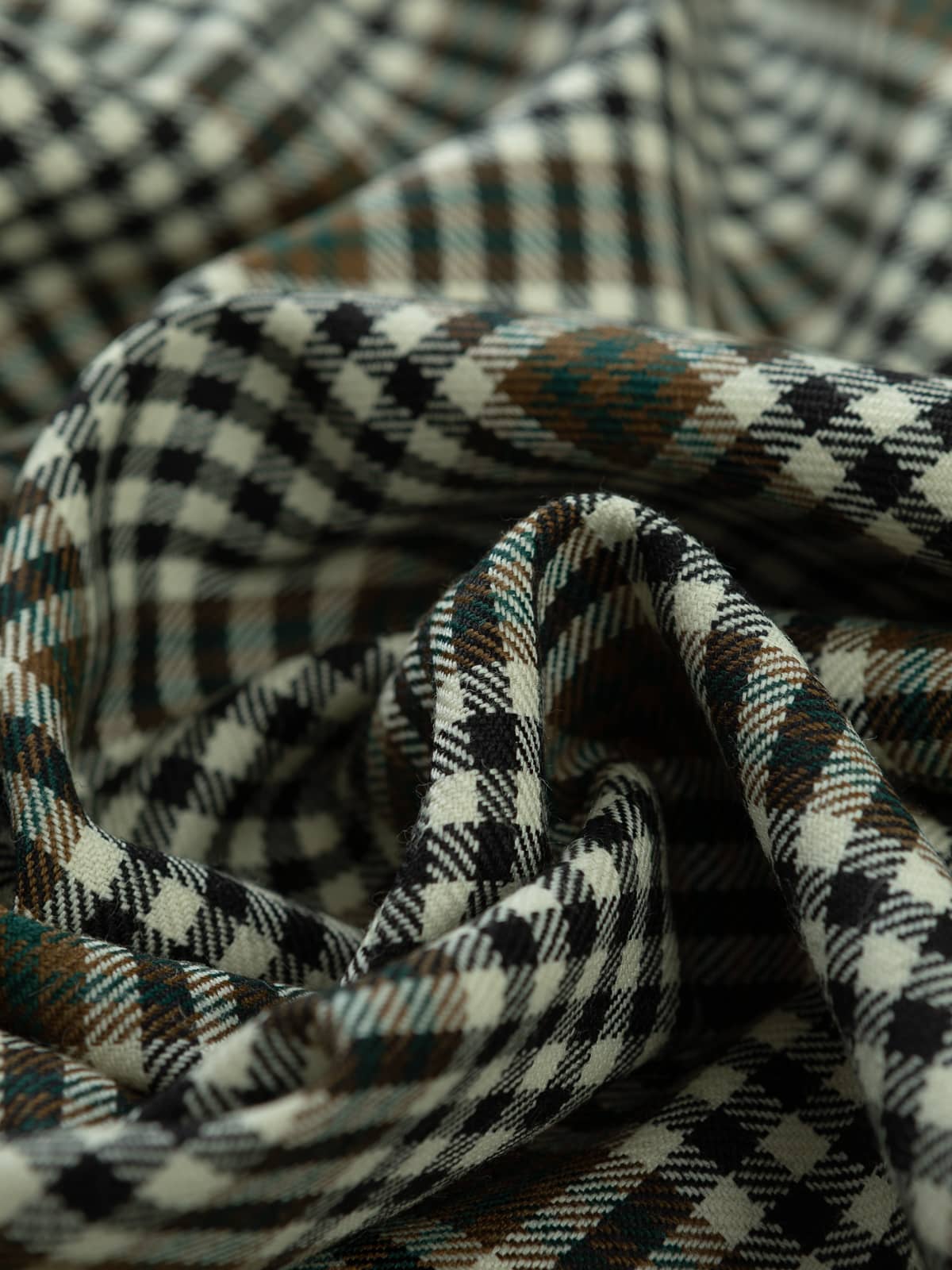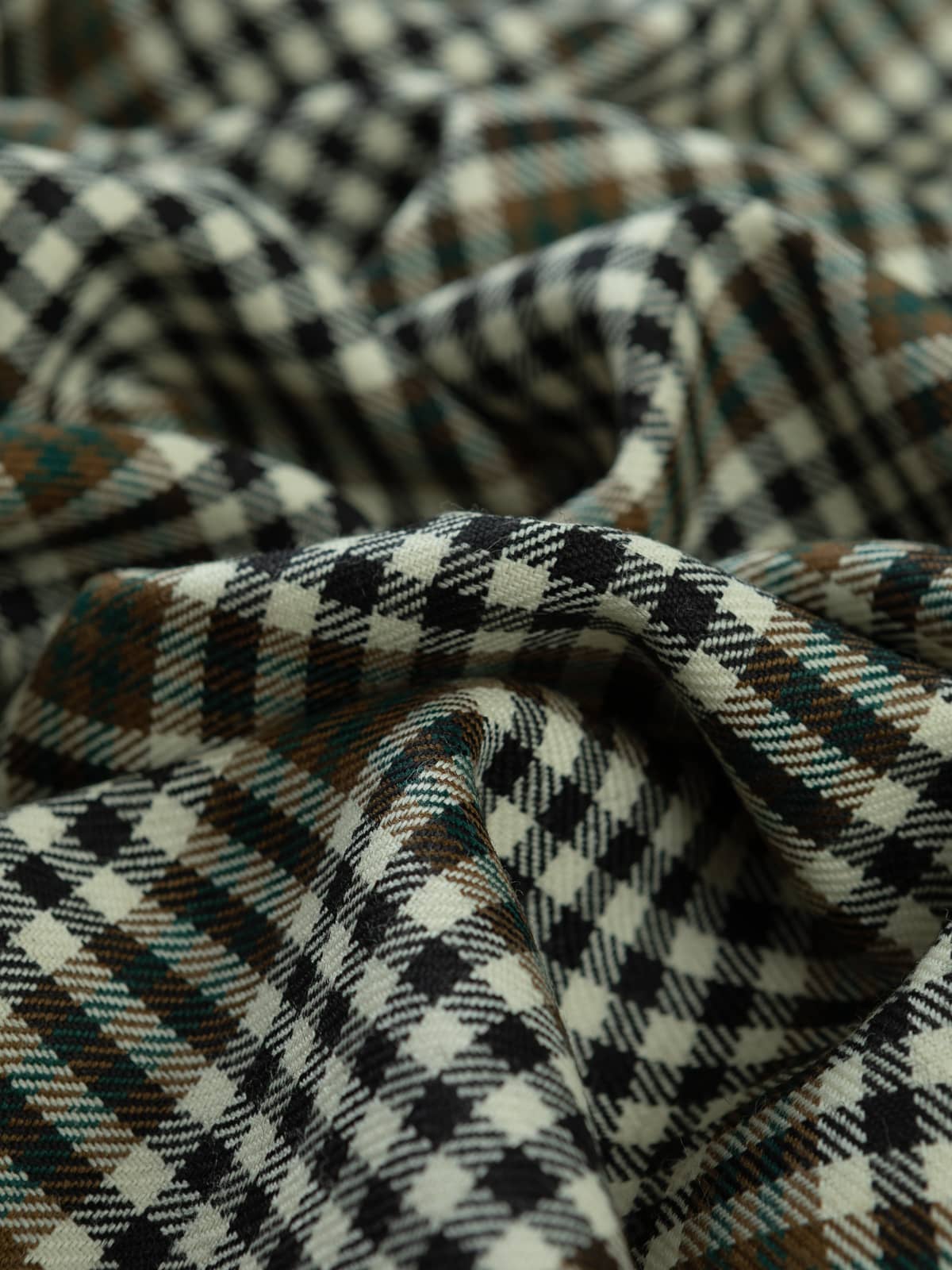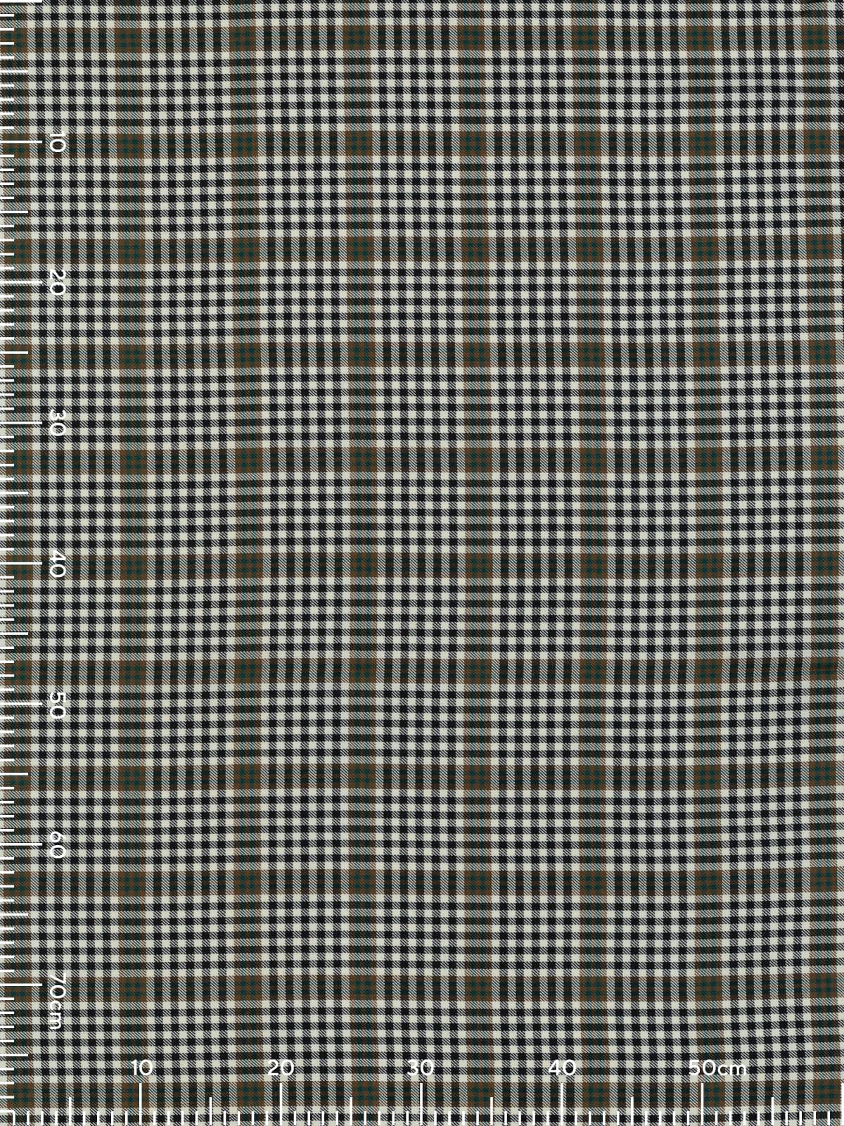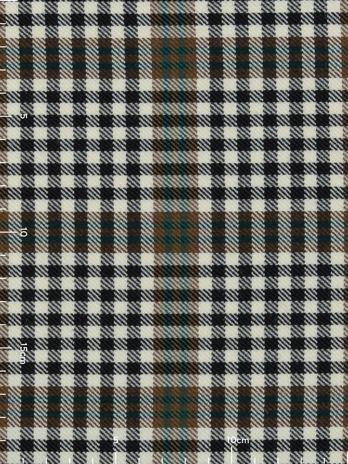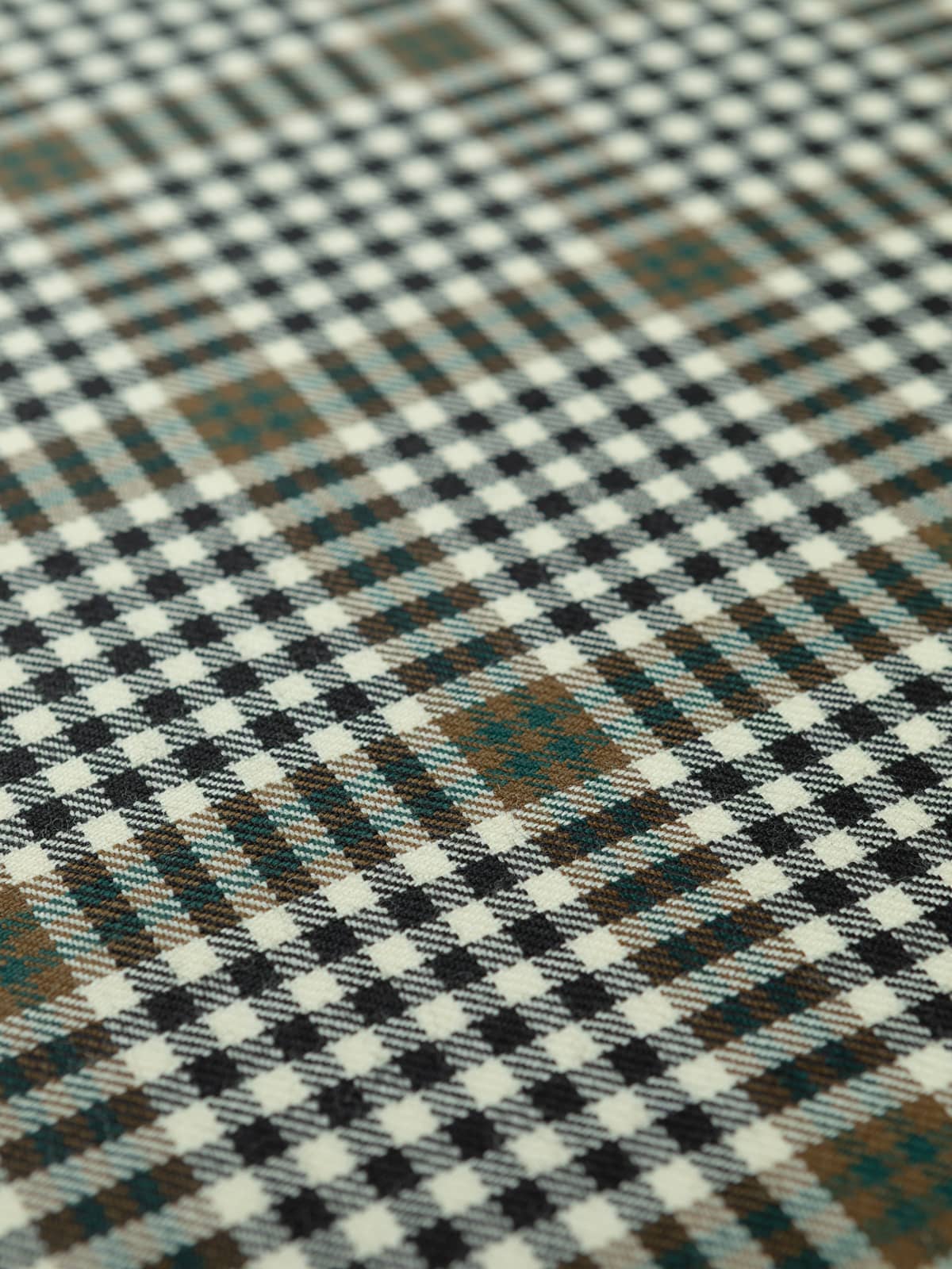 Design: A finely gridded sett built on repeated cream and black checks, producing a tight, even texture across the cloth. Broader bands of brown and teal‑green pass through the pattern at regular intervals, creating larger square formations that break up the smaller check and add structure to the design. The intersecting lines are clean and consistent, forming a balanced plaid that remains visually calm despite its detailed patterning.