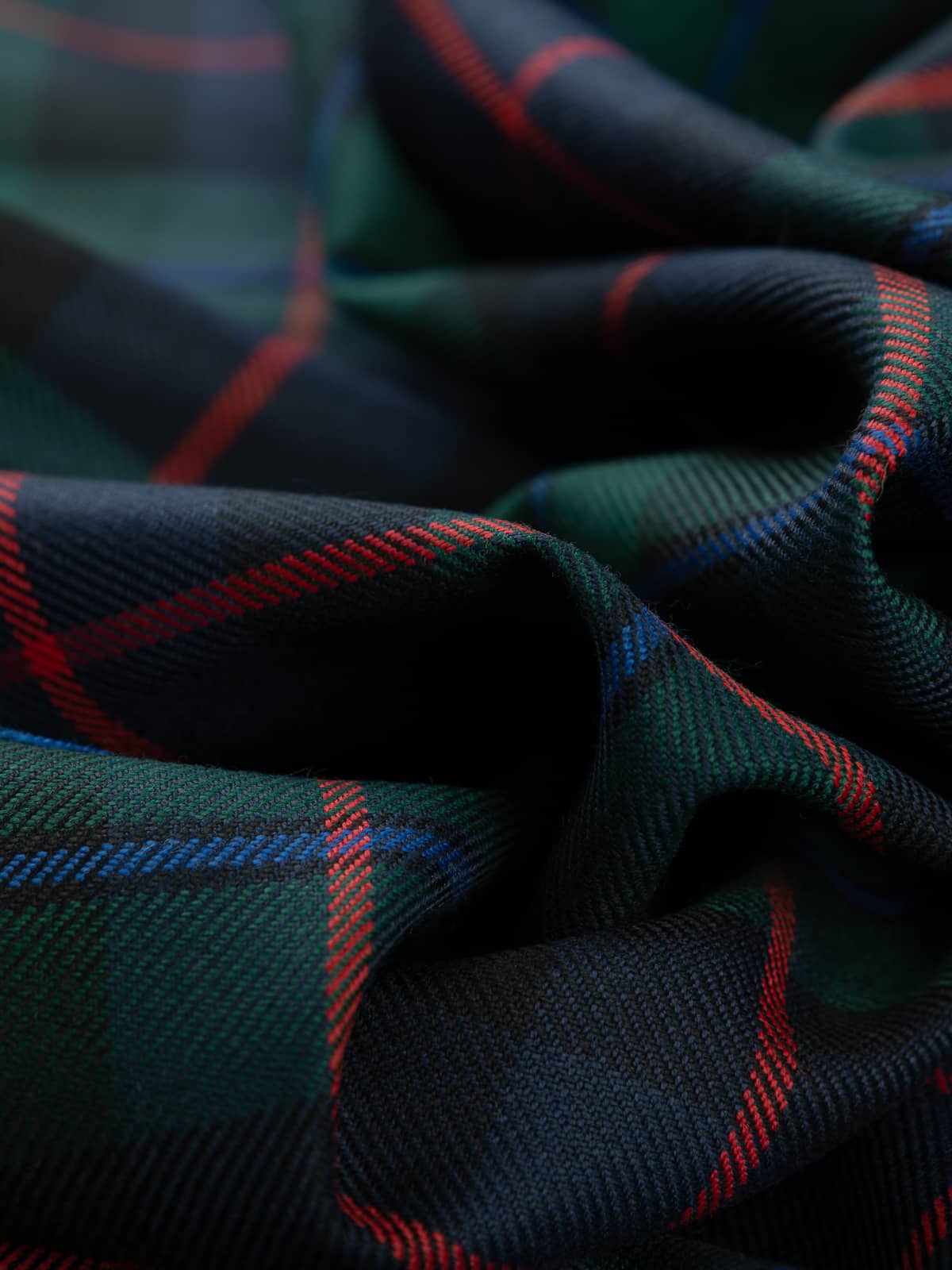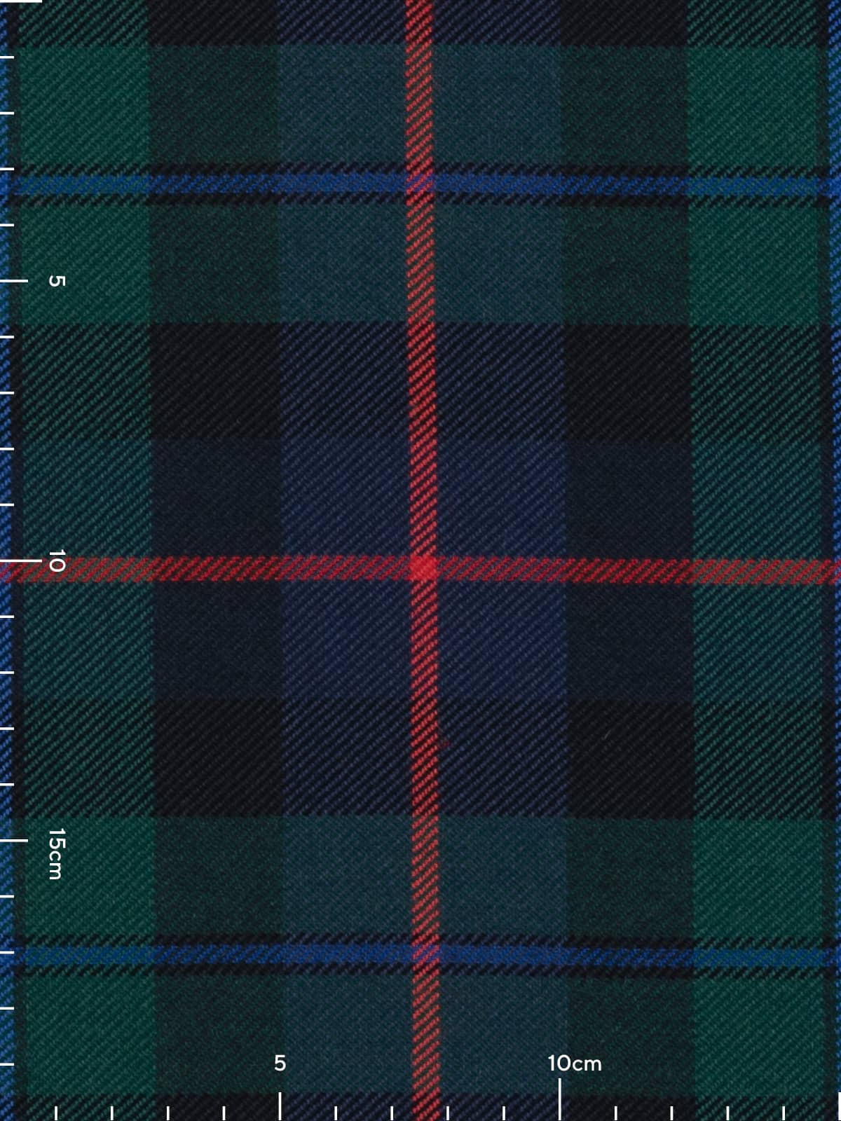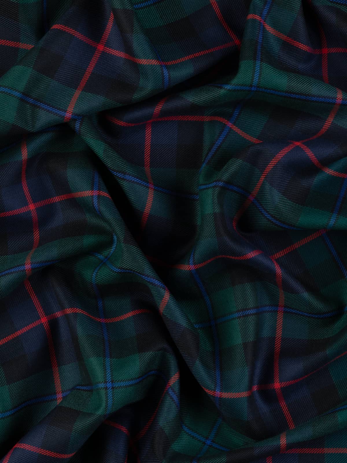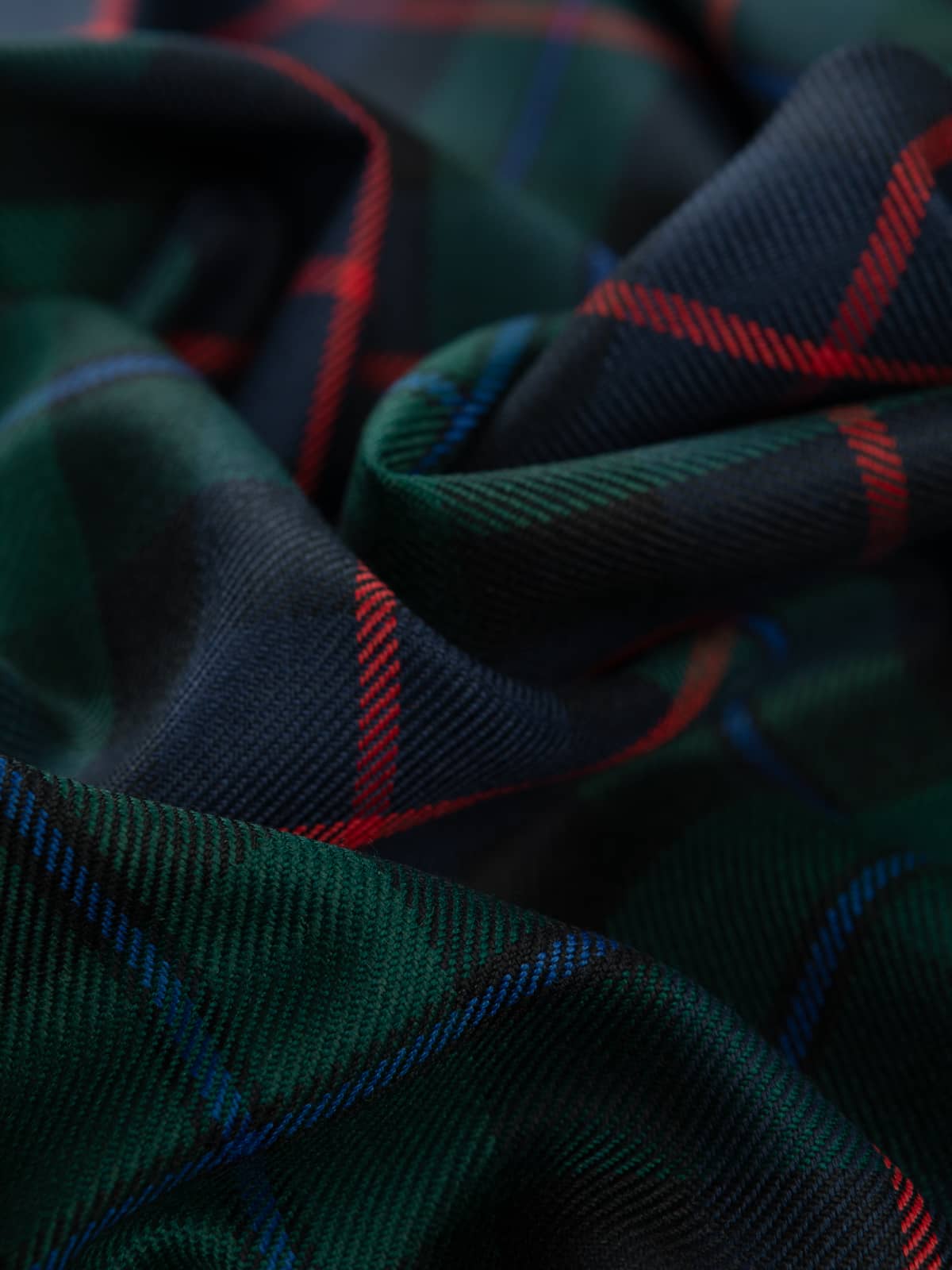 Design: A modern interpretation of the historic Campbell of Cawdor sett, structured around alternating green and navy blocks framed by darker bands. The defining red central stripe gives the pattern a distinctive rhythm, while the blue overline softens transitions within the dark fields. This layout reflects the established Cawdor version, known for its clearer contrast and more colourful accents than the darker Campbell of Argyll patterns.