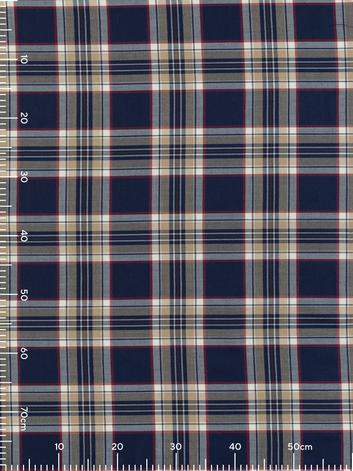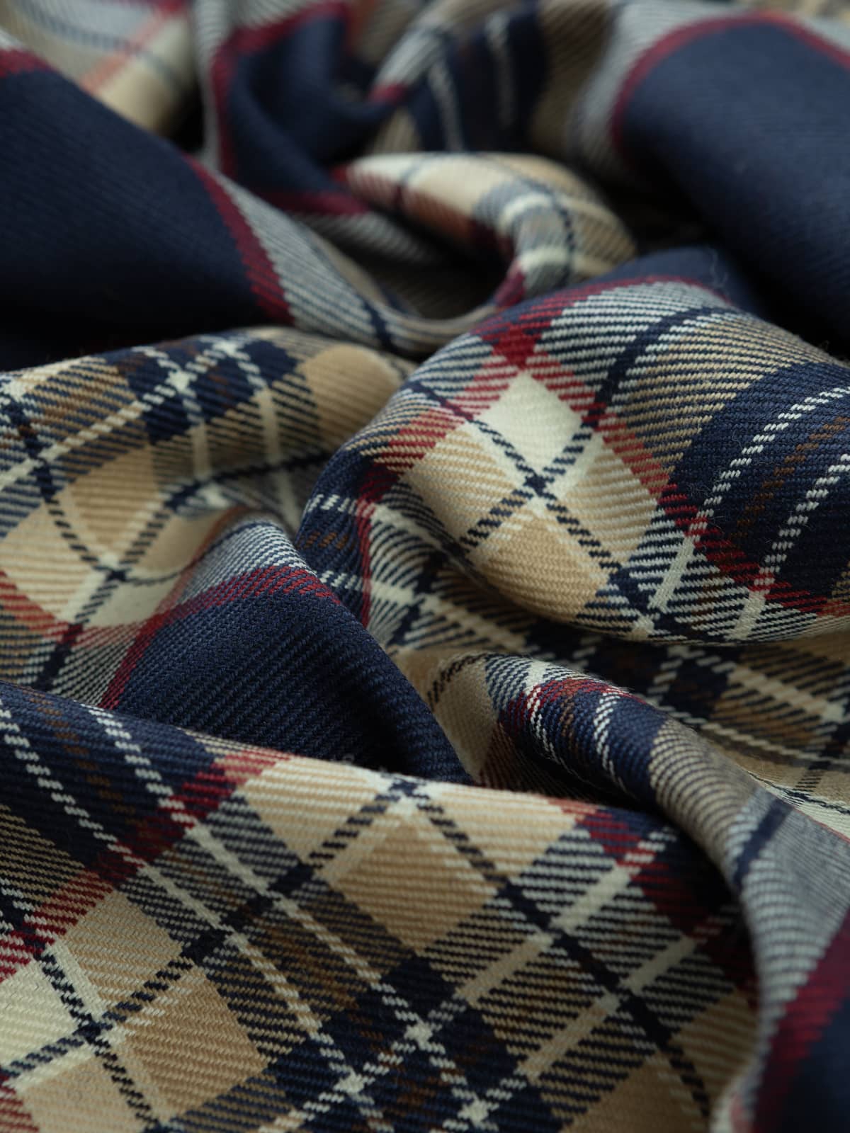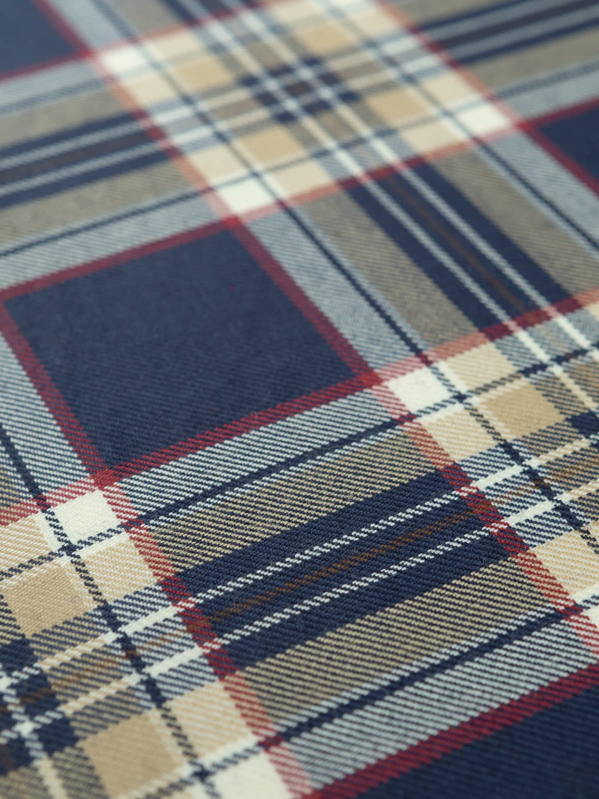 Design: A modern reinterpretation of the Stewart sett, replacing the traditional scarlet ground with navy to create a more neutral, versatile pattern. The layout retains the Stewart hallmarks, balanced overchecks, clear striping and a structured grid, here expressed through tan, ivory and red. Navy‑ground Stewart variations emerged as fashionable alternatives while still echoing the historic Stewart framework.