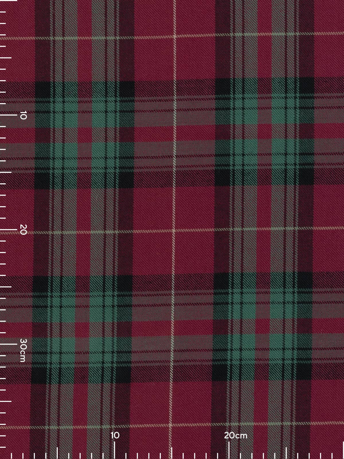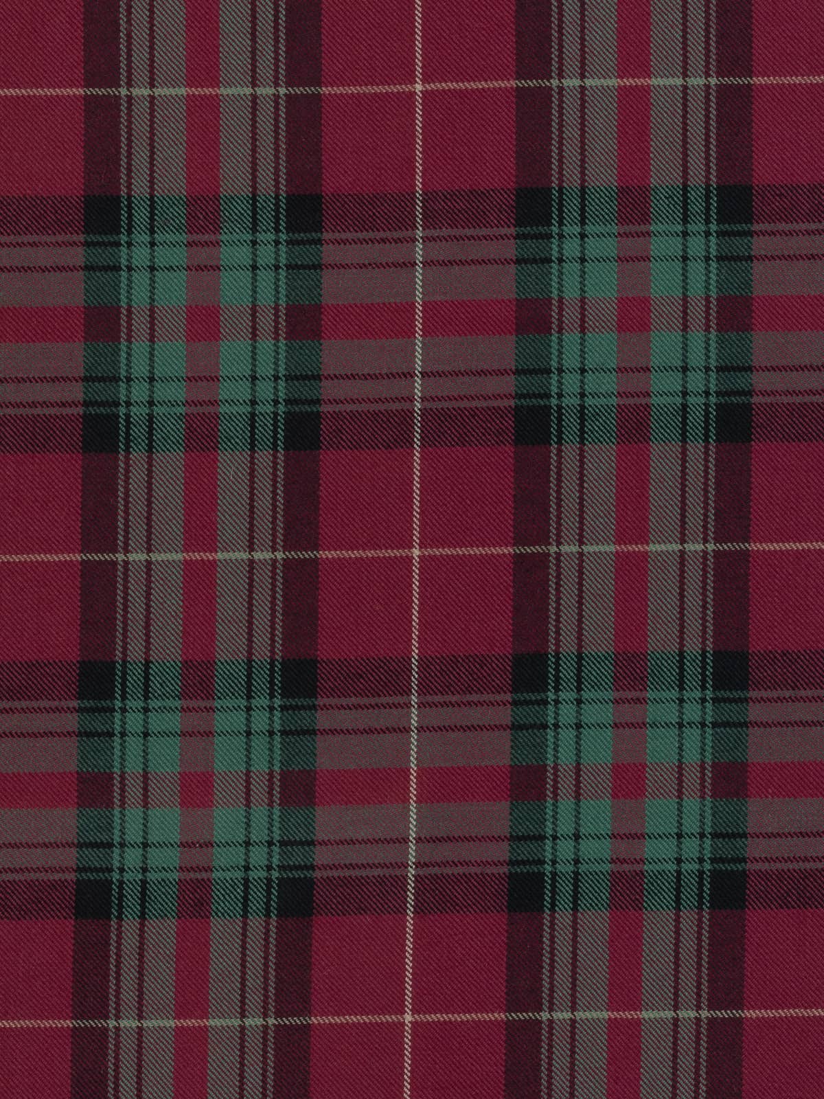 Design: A traditional Stuart of Bute Hunting sett constructed from broad crimson panels intersected with green and charcoal checks, overlaid with fine white stripes. The layout mirrors the standard Stuart of Bute structure noted historically, with the muted palette giving the pattern a softer, more contemporary aesthetic while keeping the original geometry intact.