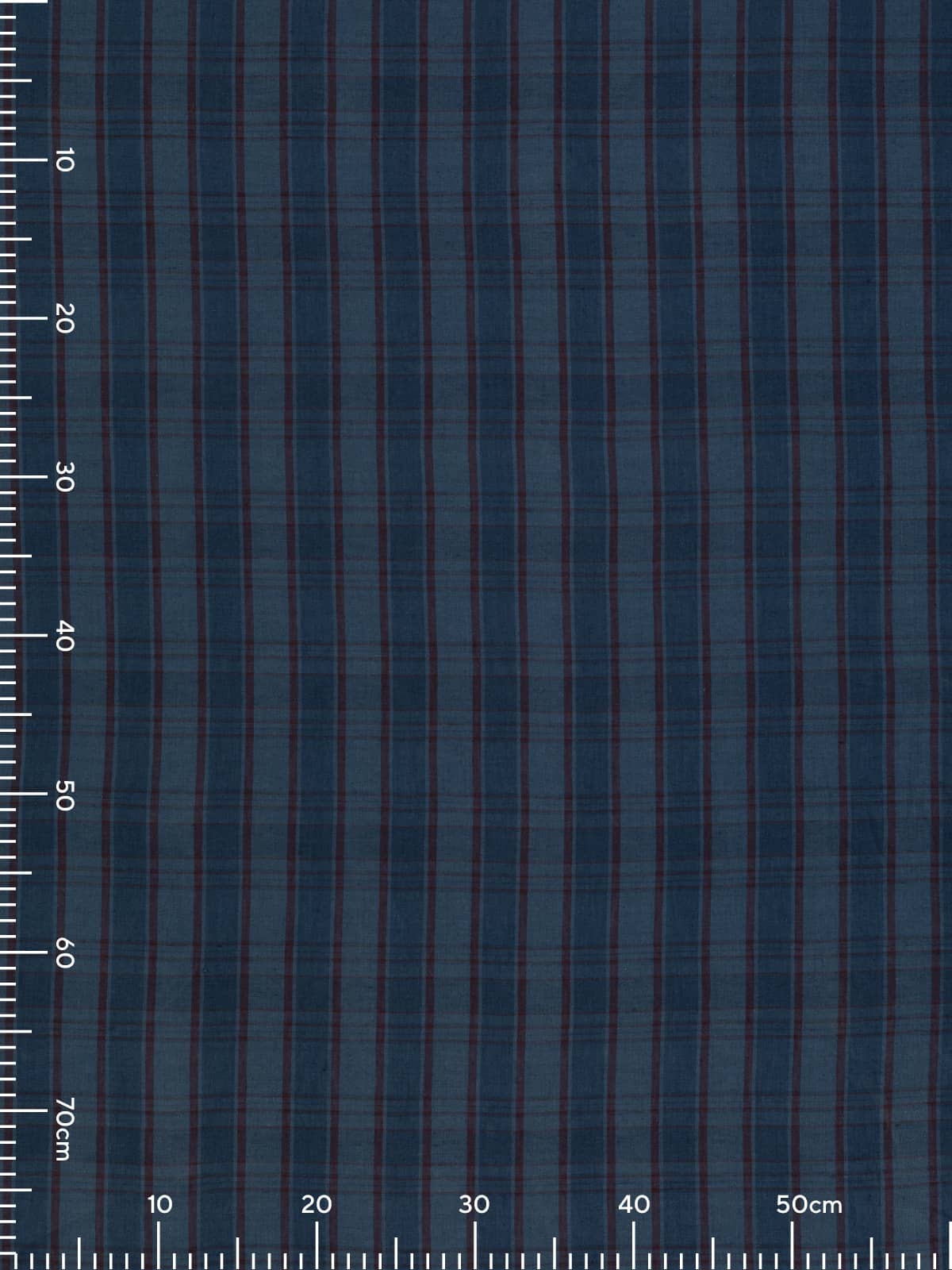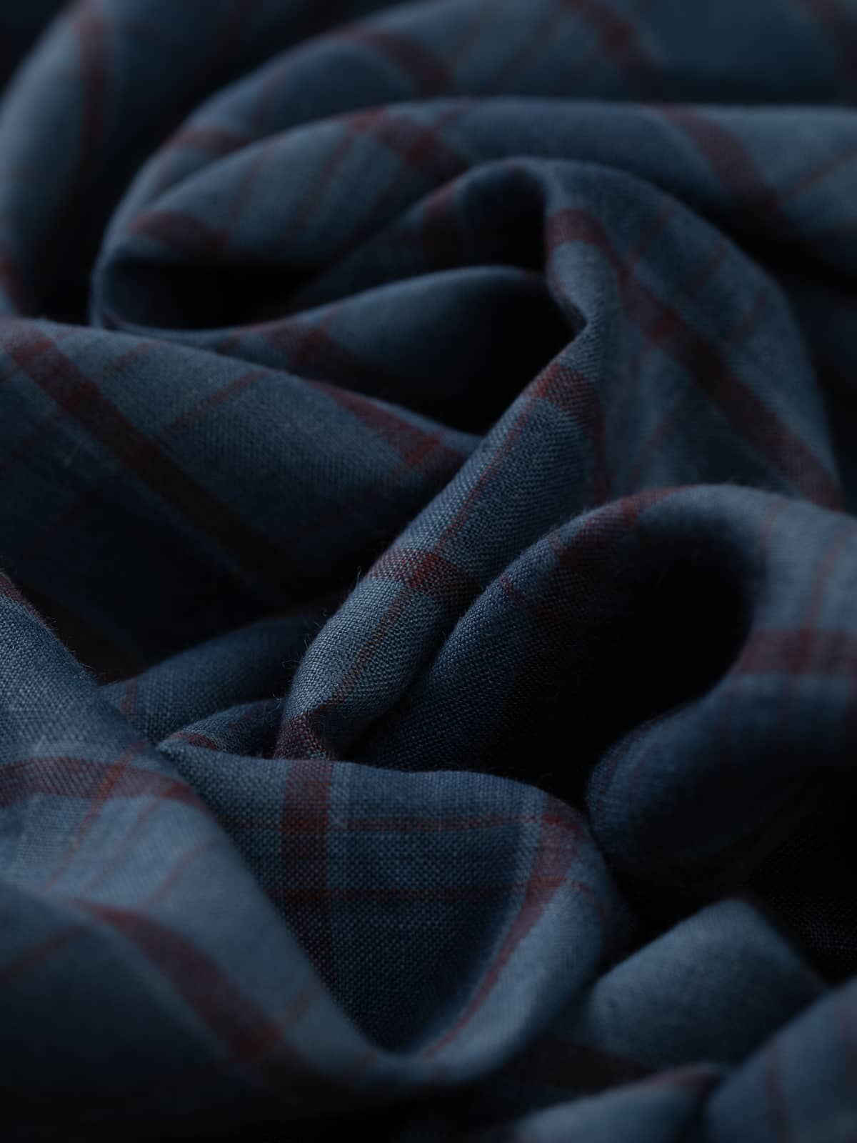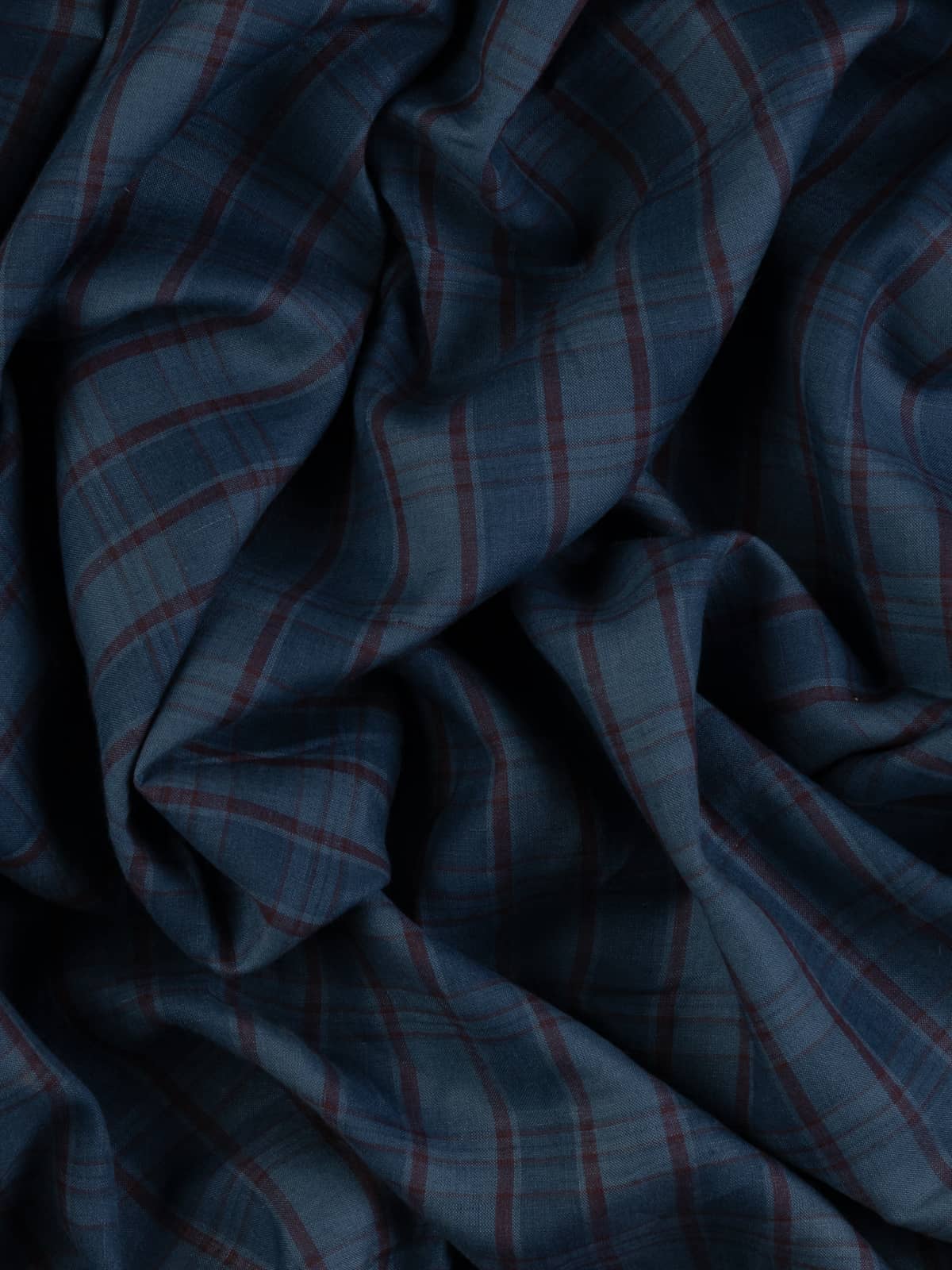 Overall: The mid-to-dark denim blues evoke calm, classic sophistication, while the deep merlot overcheck adds a subtle note of intensity, like a bold brushstroke against a serene backdrop. Effortlessly versatile, this linen is easy to dress up or down, making it a wardrobe staple for warmer seasons.