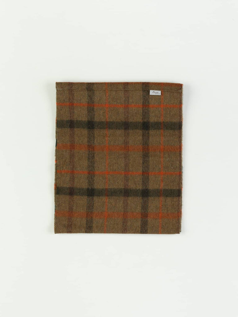 This infinity scarf evokes the warmth of an autumn forest canopy, with a mossy green beige base enriched by overchecks of deep forest green, wine red, burnt orange, and fire orange that glow like campfire embers. Brushed Merino wool is stitched into a soft tweedy loop with a neat Bronte tag, making it easy to slip on, twist, and wrap into secure layers of cosy, nature-inspired comfort.