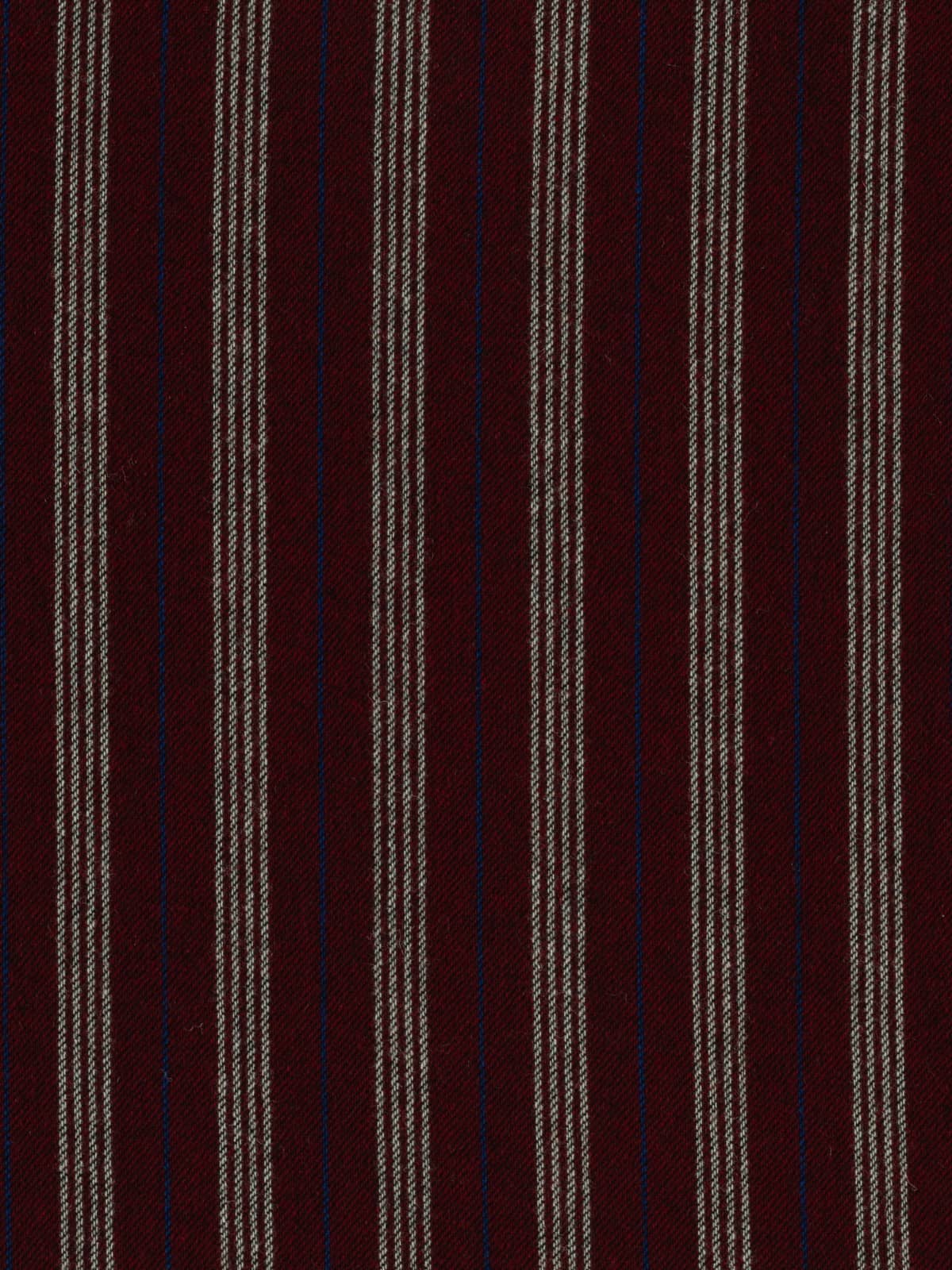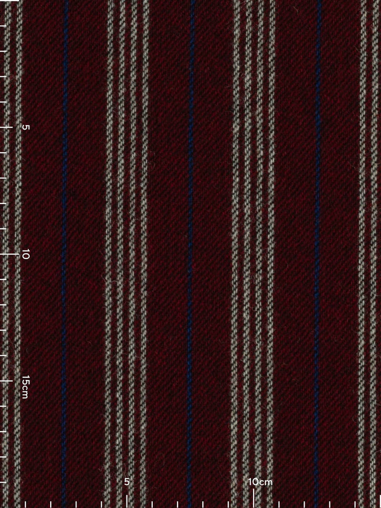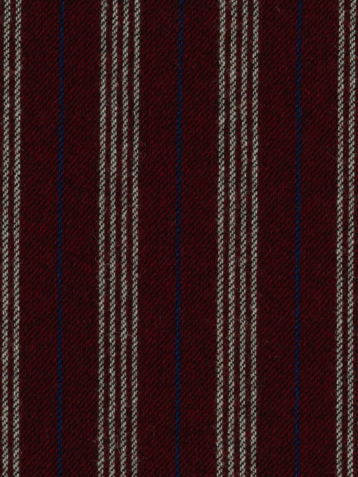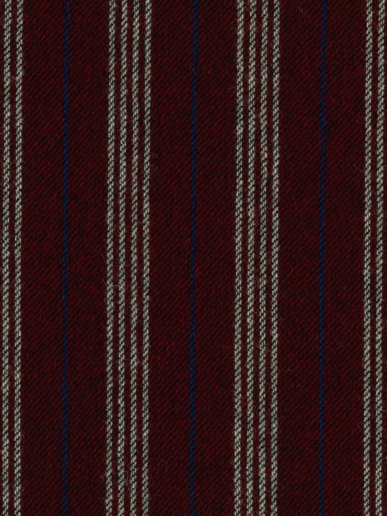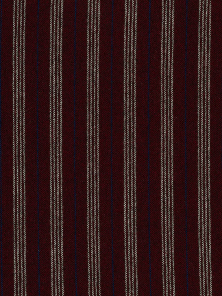 A seriously smart and warming palette of yarns forms this wool Boating Club Stripe. A base of dark cherry red is complemented by contrasting quad stripes of white, with alternating royal blue pinstripes in between. The opulent palette exudes a rich, fruity warmth, reminiscent of mulled wine or rum punch enjoyed after a frosty winter stroll. Black weft yarns emphasise the subtle twill weave, enhancing the timeless style of this elegant wool tweed.