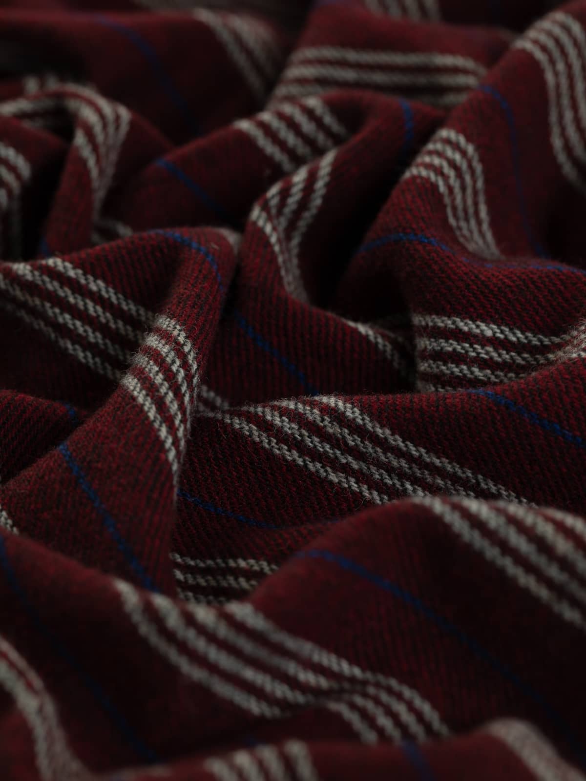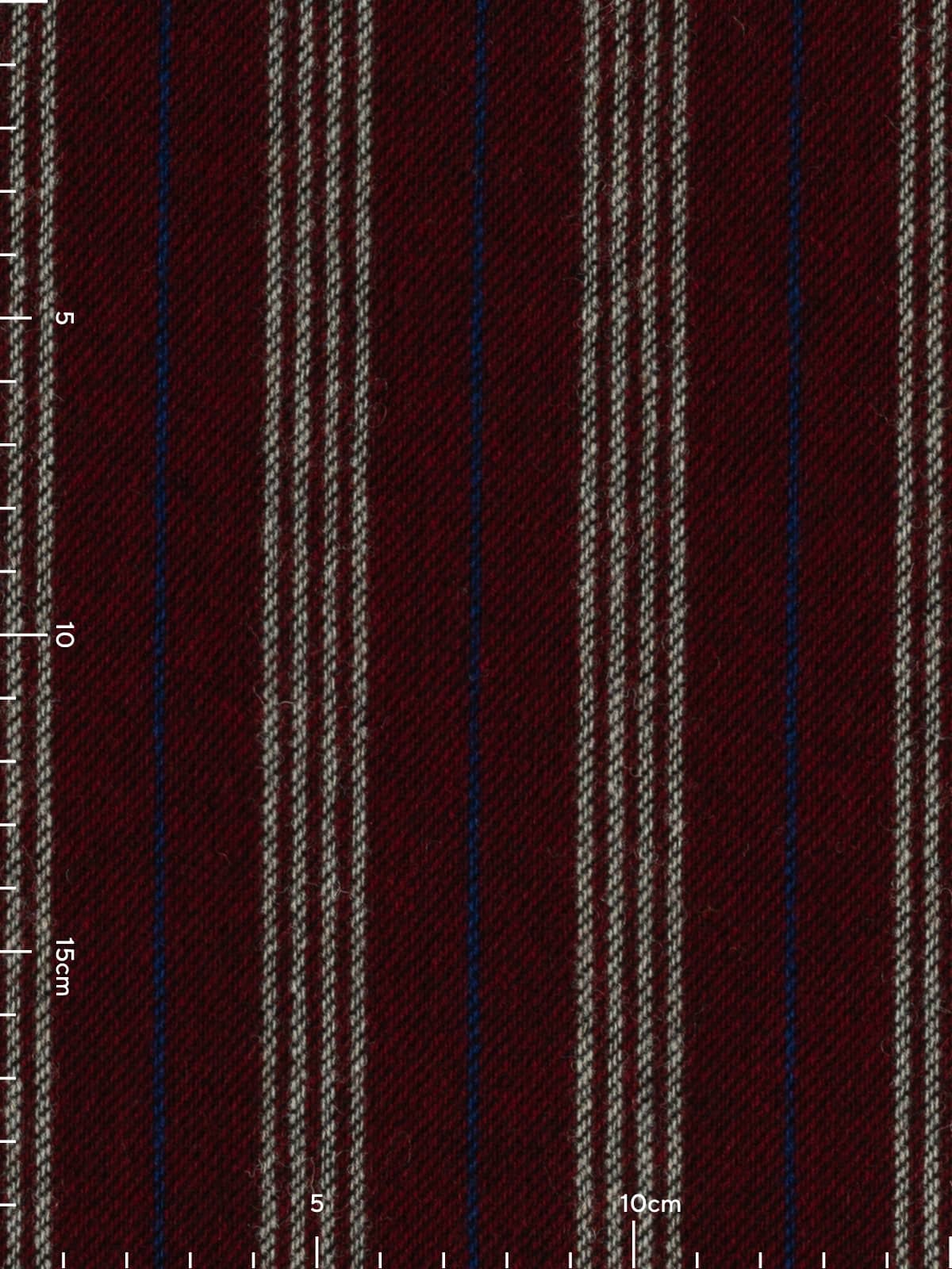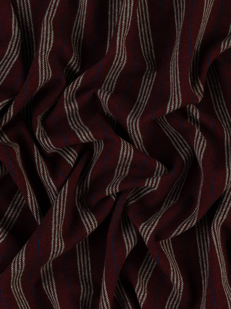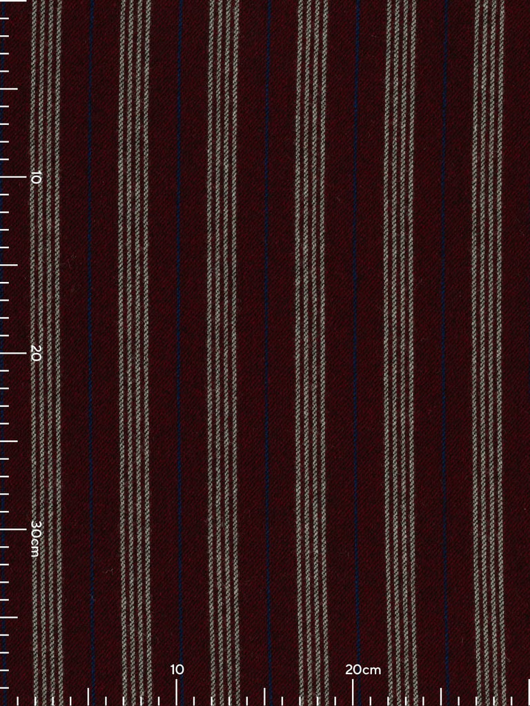 A seriously smart and warming palette of yarns forms this wool Boating Club Stripe. A base of dark cherry red is complemented by contrasting quad stripes of white, with alternating royal blue pinstripes in between. The opulent palette exudes a rich, fruity warmth, reminiscent of mulled wine or rum punch enjoyed after a frosty winter stroll. Black weft yarns emphasise the subtle twill weave, enhancing the timeless style of this elegant wool tweed.