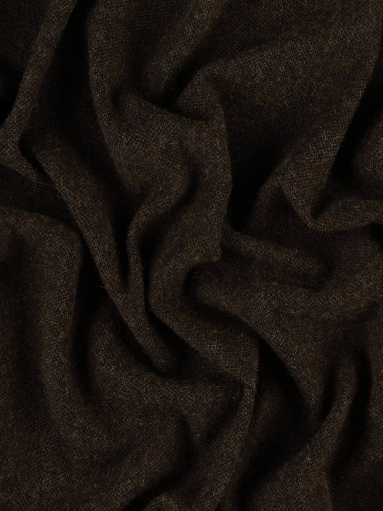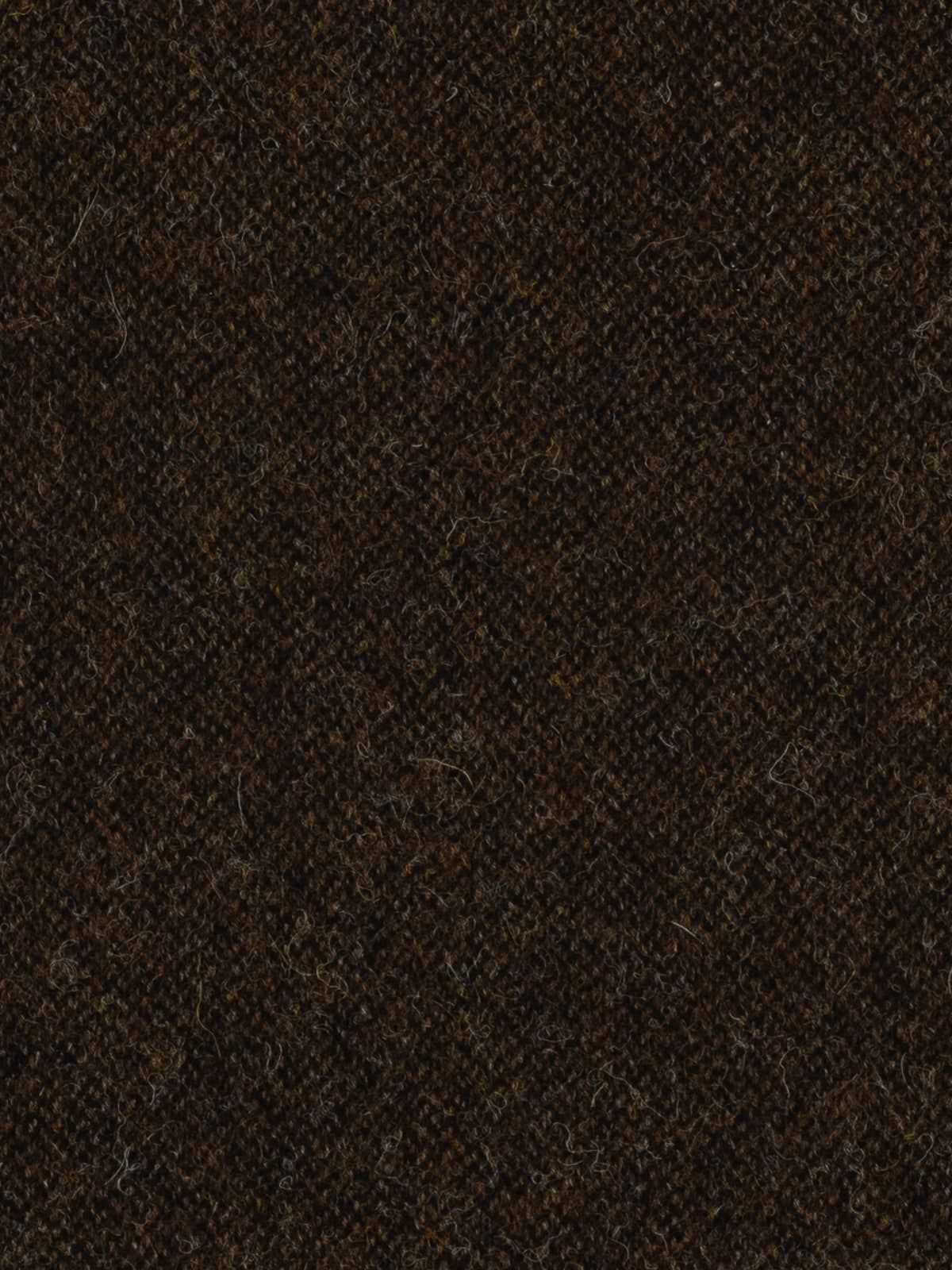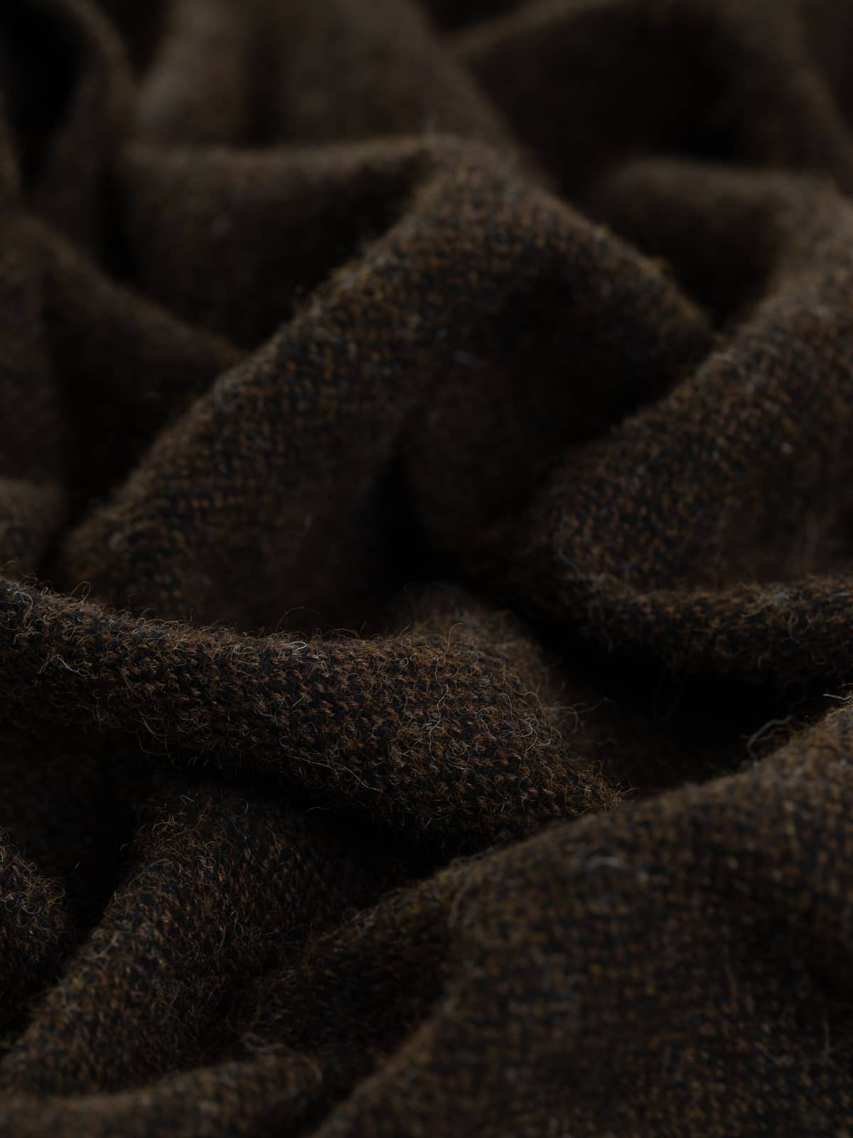 A classic country melange of rich brown and black-toned yarns forms this cosy, feathered herringbone woven tweed. These earthy, natural tones evoke rustic country life, wild heathlands where ponies roam and dark, peaty soil underfoot. This dark brown and black melange is versatile, easy to style, and a timeless addition to any wardrobe,  town or country.