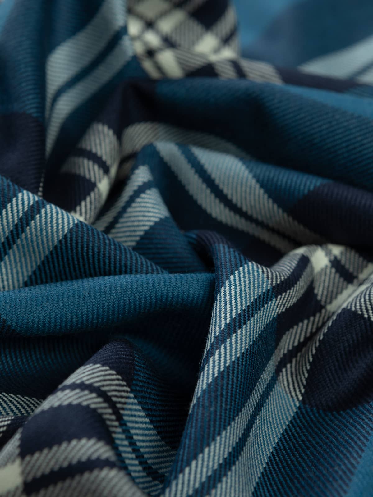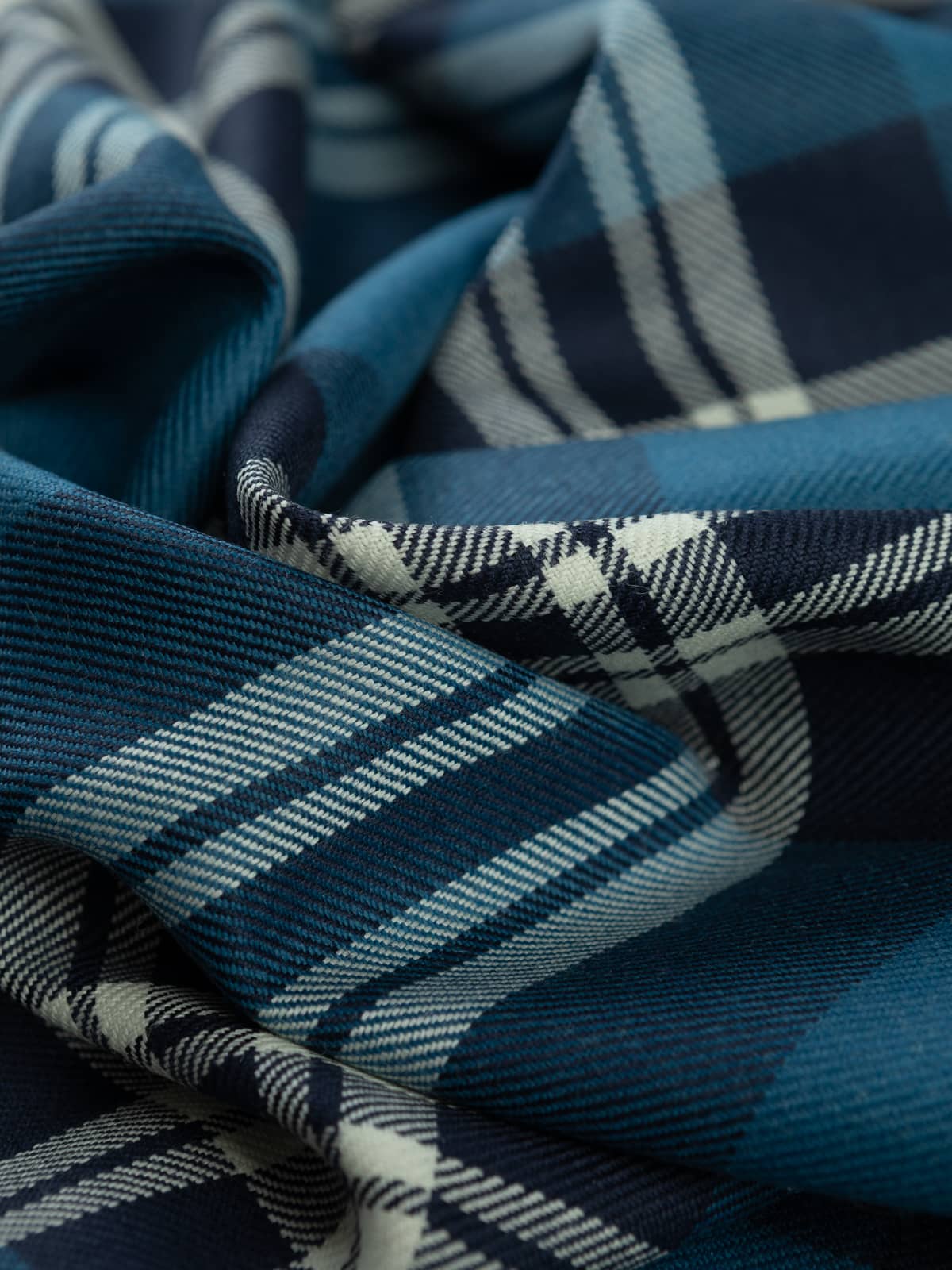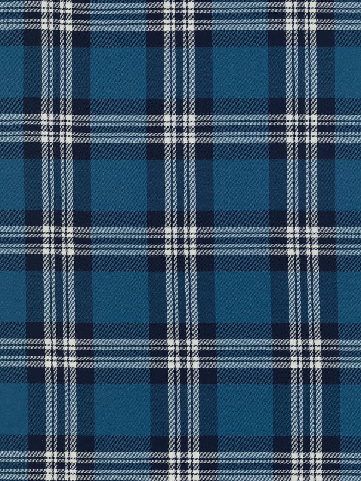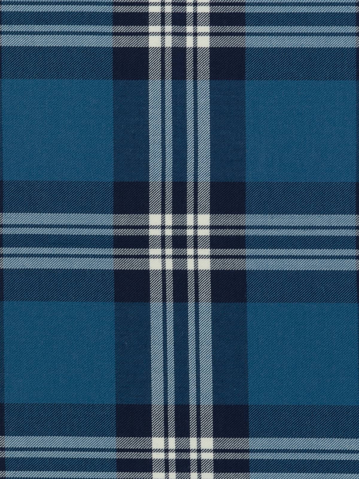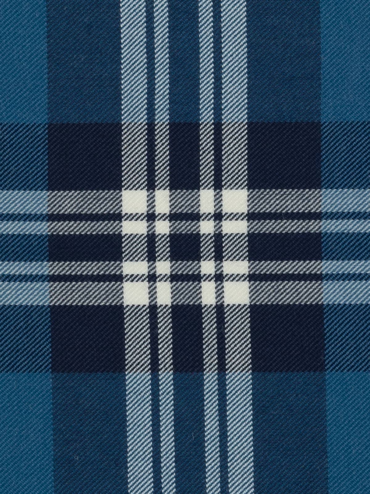 Shades: A refined blue‑based palette featuring deep navy and mid‑toned ocean blue panels. These blues are paired with clean white and soft grey stripes, creating a crisp contrast that gives the tartan its distinctive clarity. The restrained combination of dark and light tones produces a cool, composed appearance.
