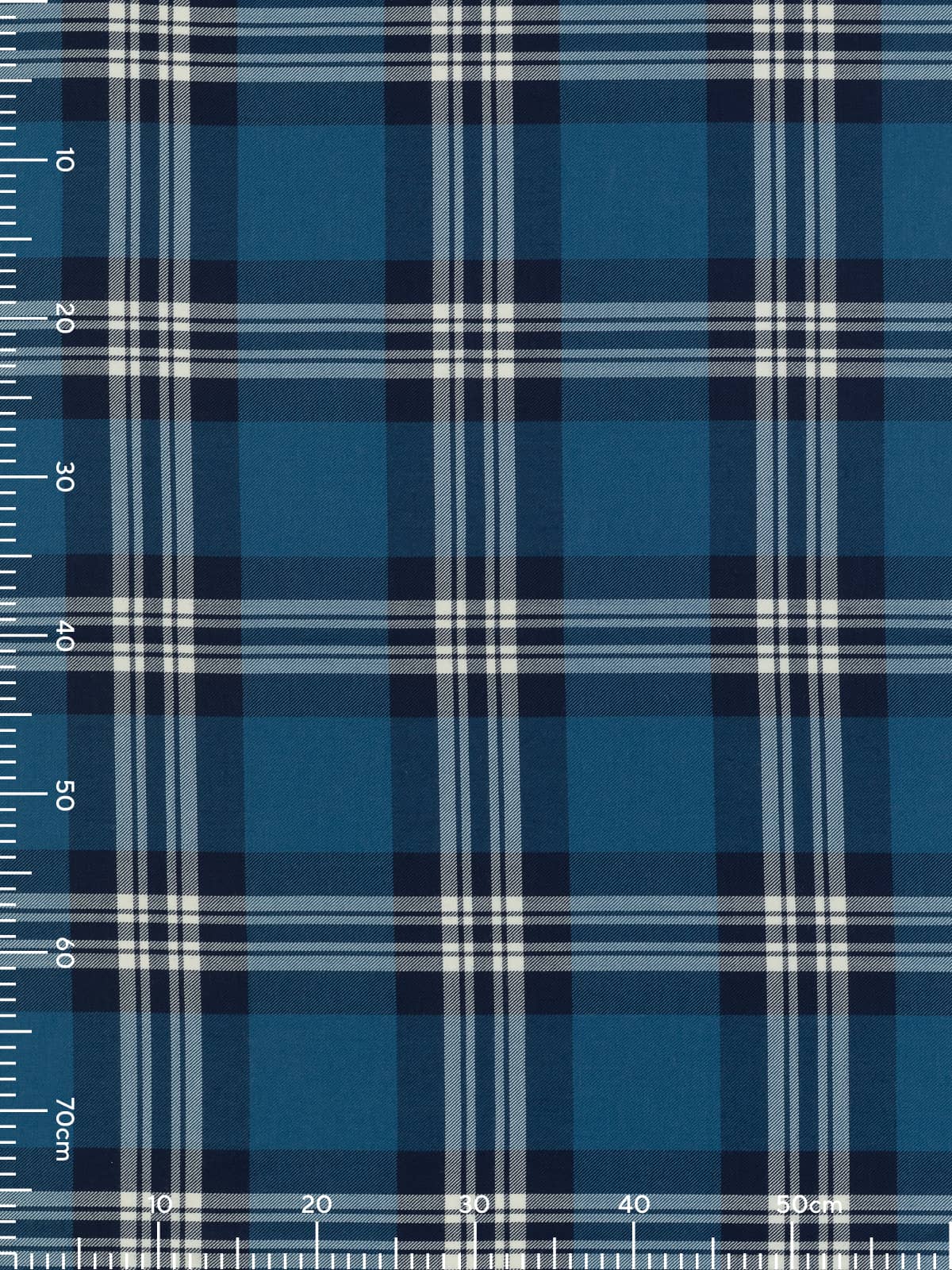 Design: A structured sett built around large blue blocks intersected by pairs of navy bars. These are overlaid with repeated white and grey lines that sit prominently across the pattern, forming sharply defined squares and delivering a balanced rhythm throughout the cloth. The overall layout is orderly and symmetrical, with the lighter stripes standing out clearly against the layered blues.
