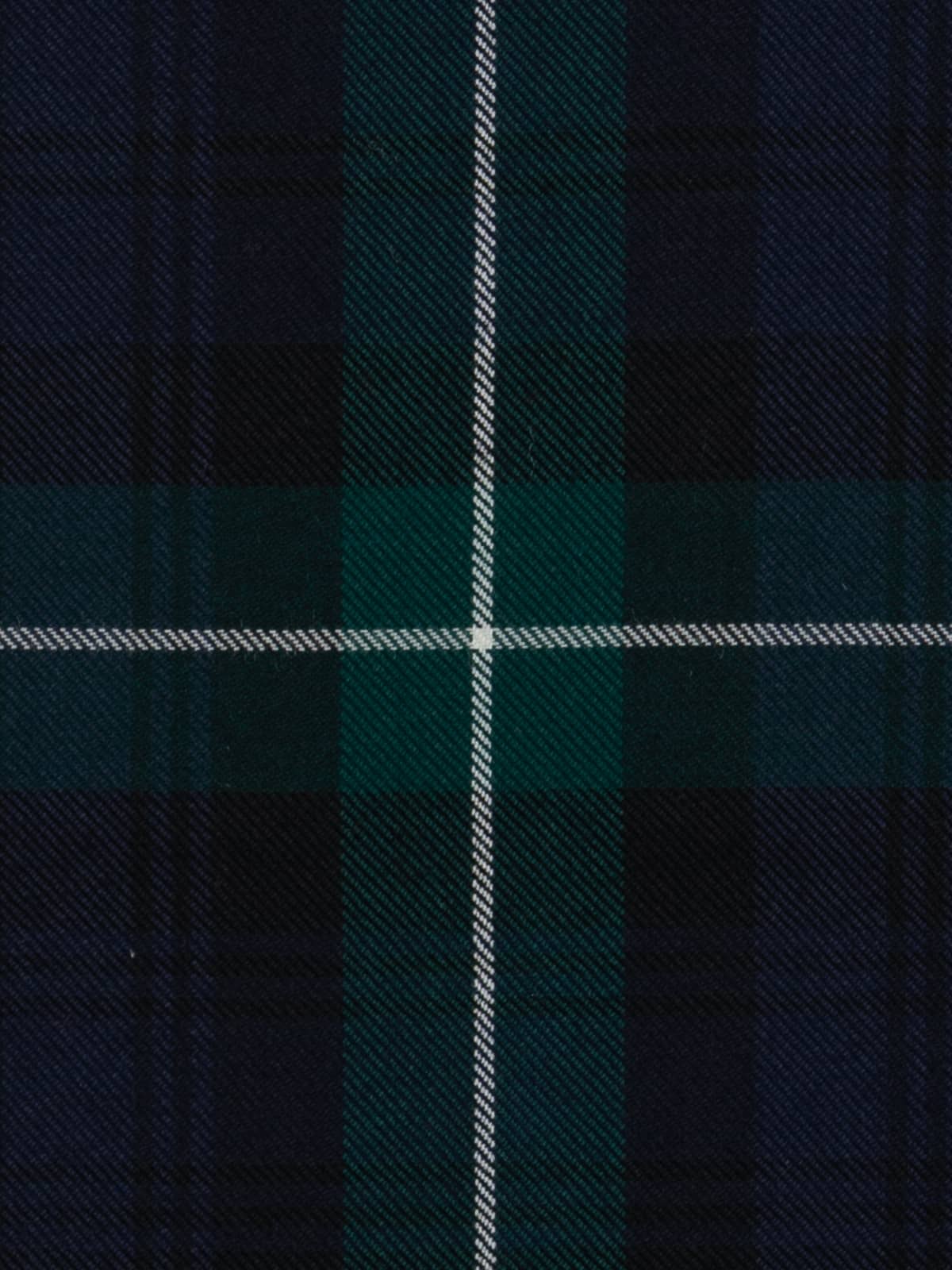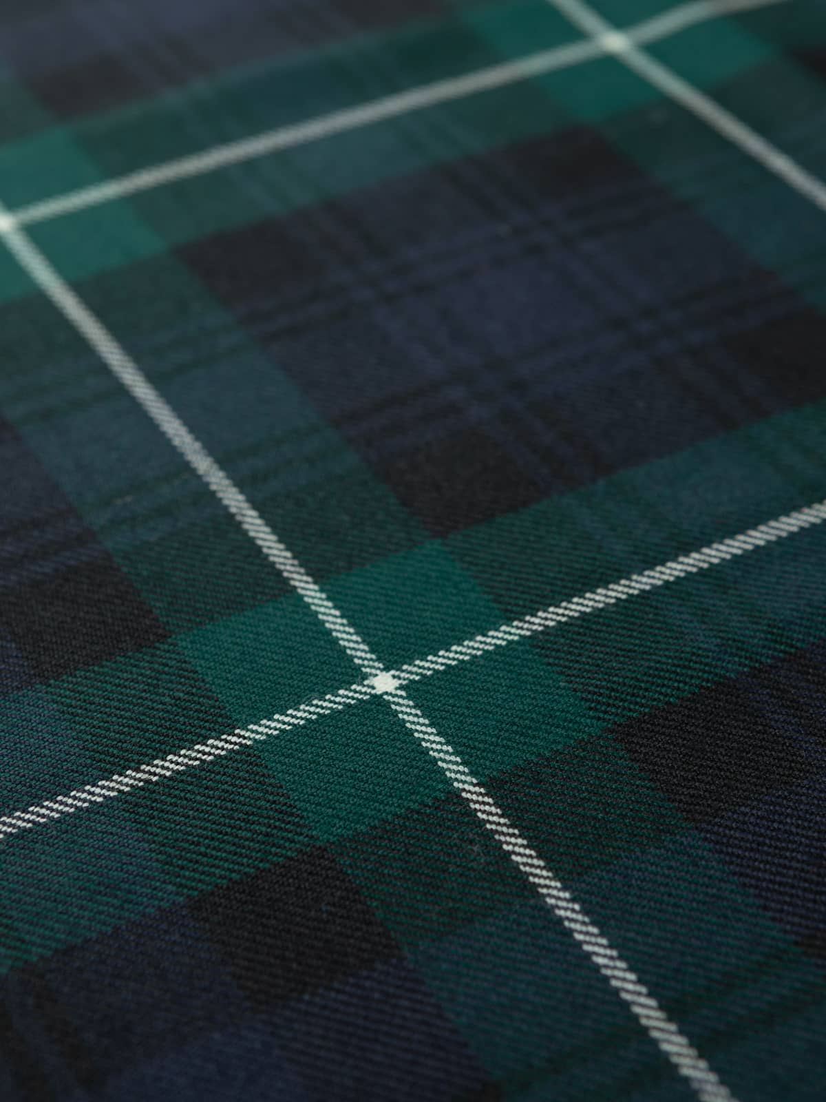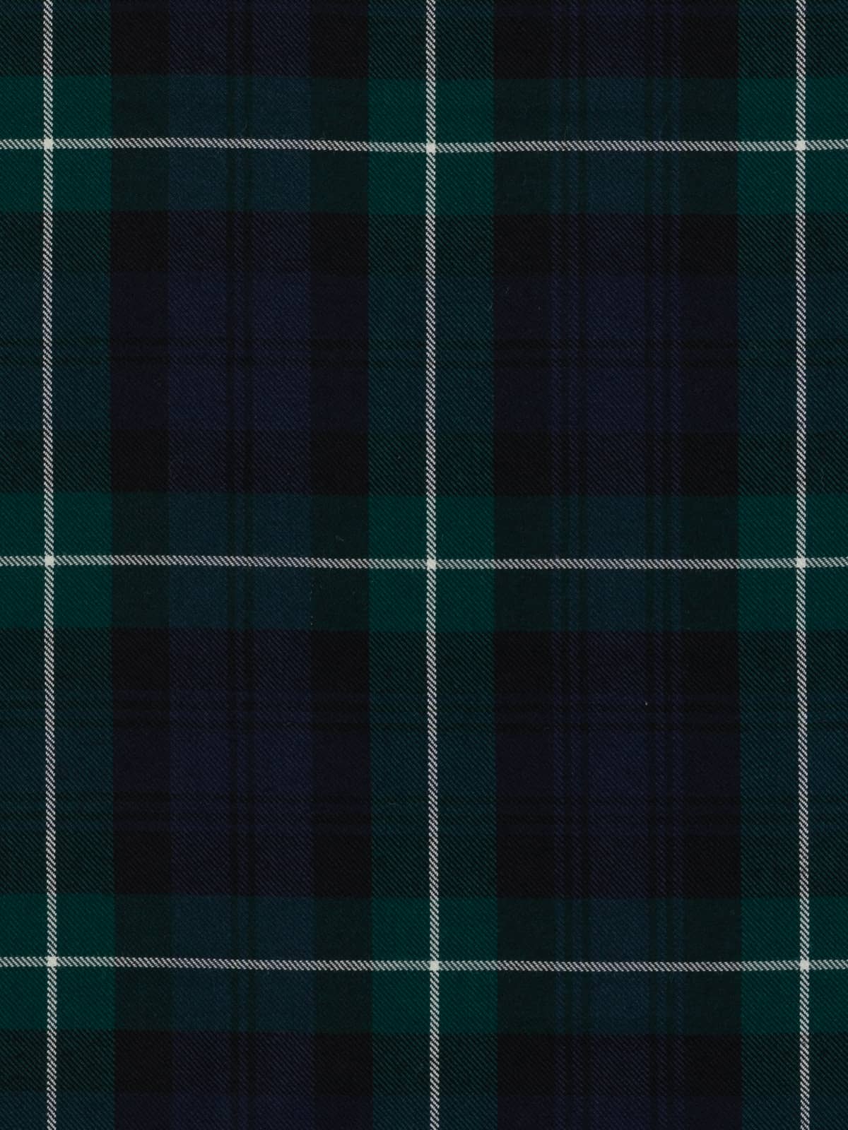 Design: A classic Lamont sett featuring broad squares of navy and green, arranged in a steady alternating rhythm. Fine black lines reinforce the borders of each colour block, while the prominent white stripes form a clear, rectilinear grid that sits boldly over the darker background. The pattern is precise, symmetrical and highly legible, giving the tartan a confident, modern character.