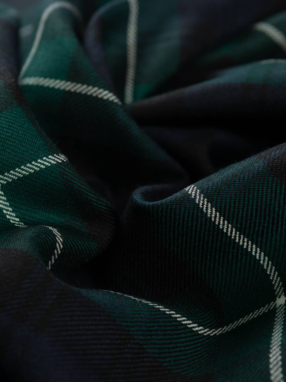 Drape: In addition to holding crisp details, this fabric drapes with a reassuring weight, ideal for bias cuts, flares, and flounced designs. The tartan sett can be cleverly used to create striking focal points in bespoke garments and creative pieces.
