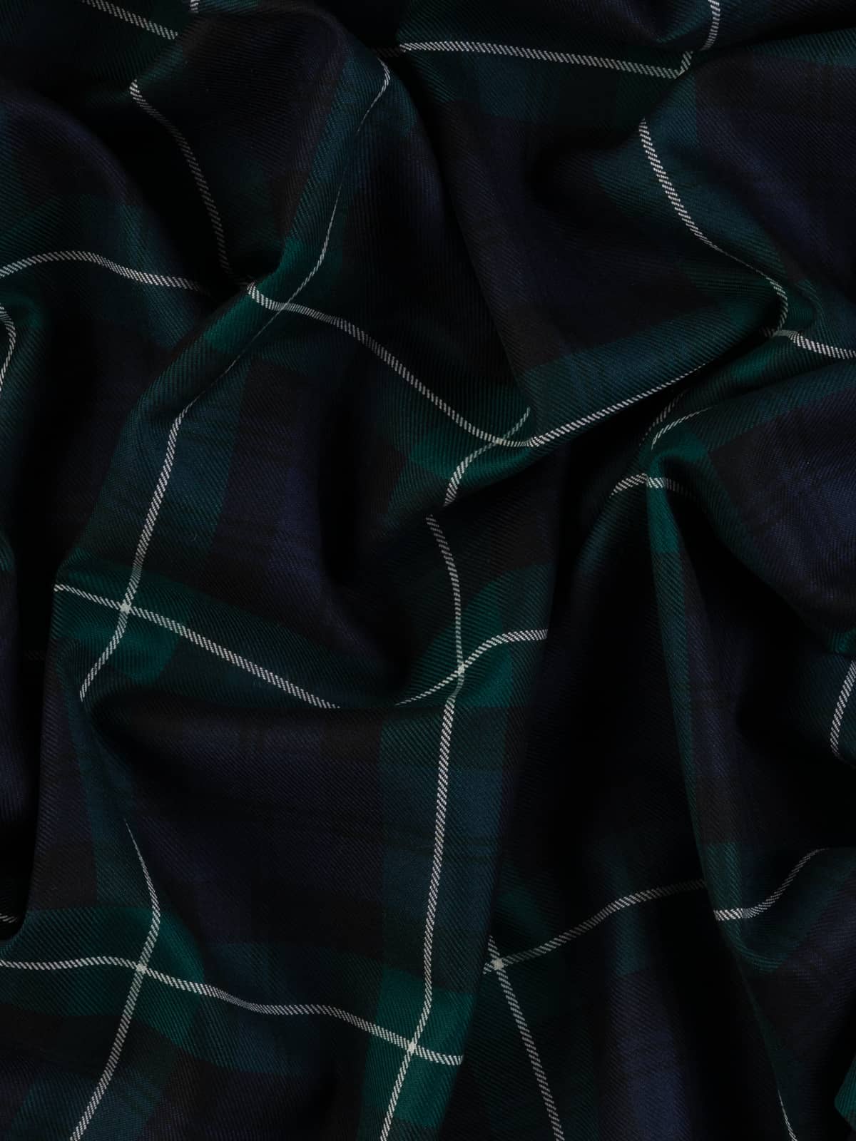Shades: A strong, contemporary palette built around deep navy and dark bottle green, creating a rich and saturated base. These dark tones are brightened with crisp white overchecks, which provide sharp contrast and clean definition across the pattern. Subtle touches of mid‑blue soften the structure and add depth within the darker fields.