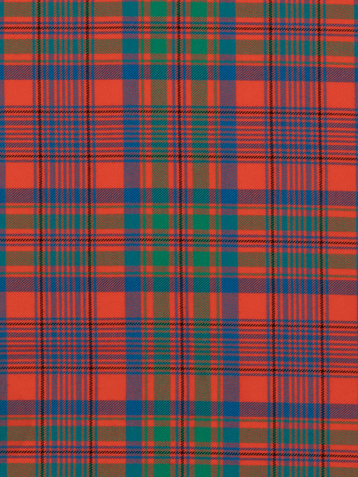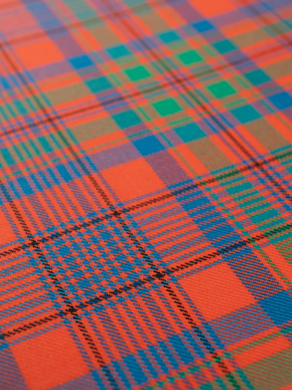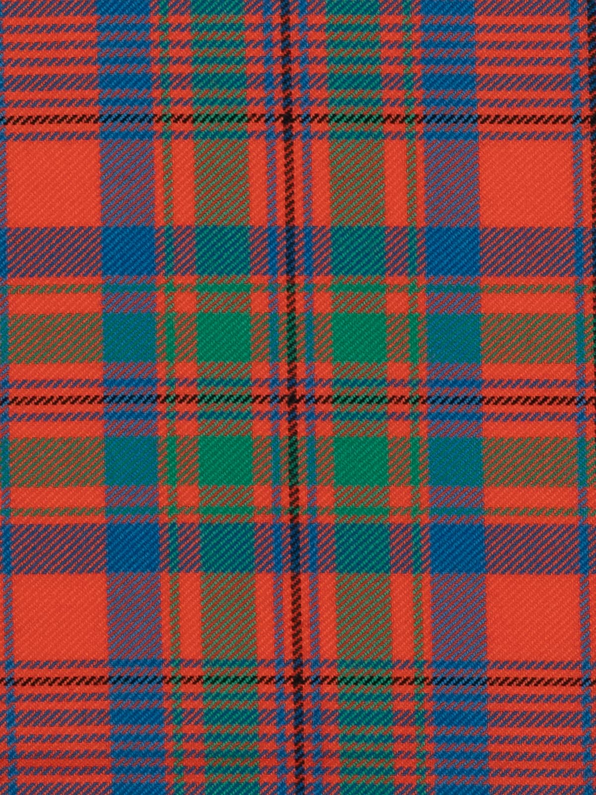 Shades: A vibrant palette dominated by rich orange‑red, complemented by forest green and deep royal blue. Slim accents of mustard yellow and black run throughout the pattern, adding definition and highlighting the intersections. The combination creates a warm, lively appearance rooted in traditional Highland colouration.