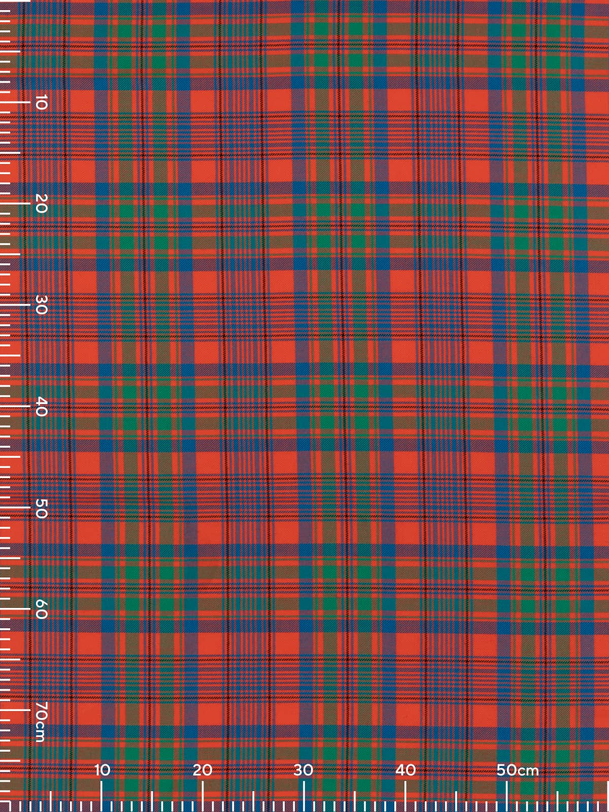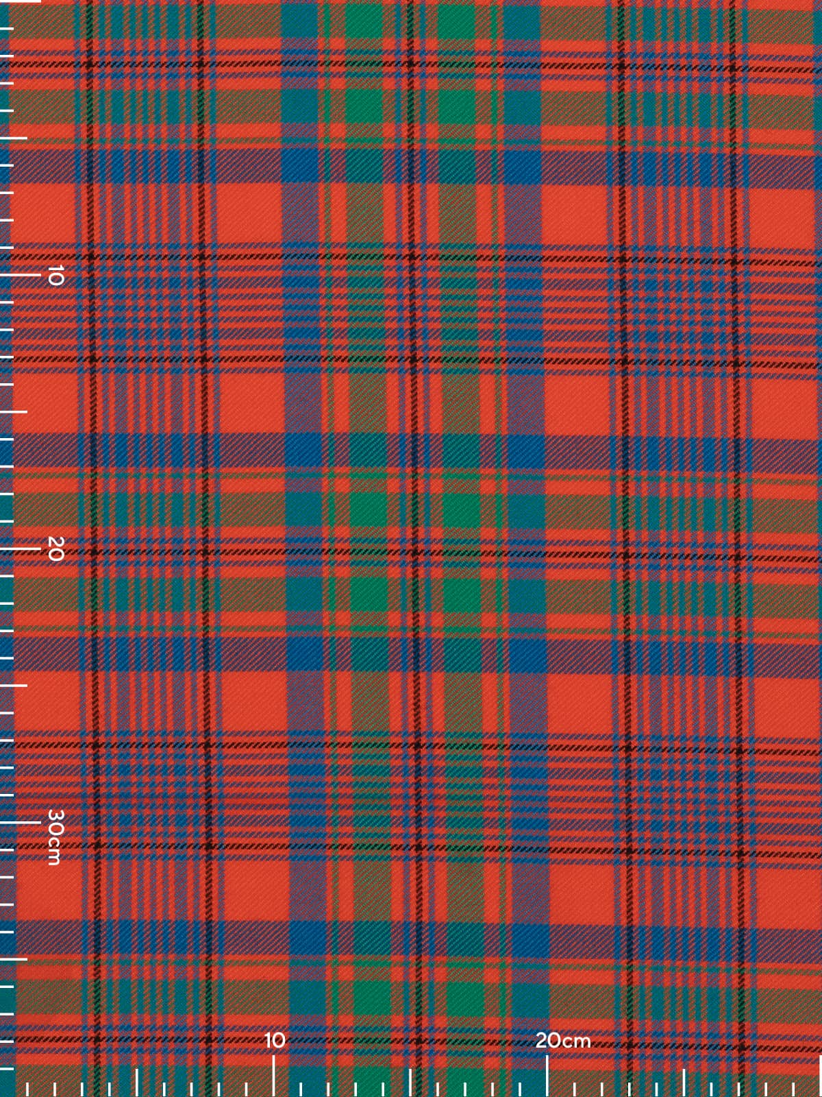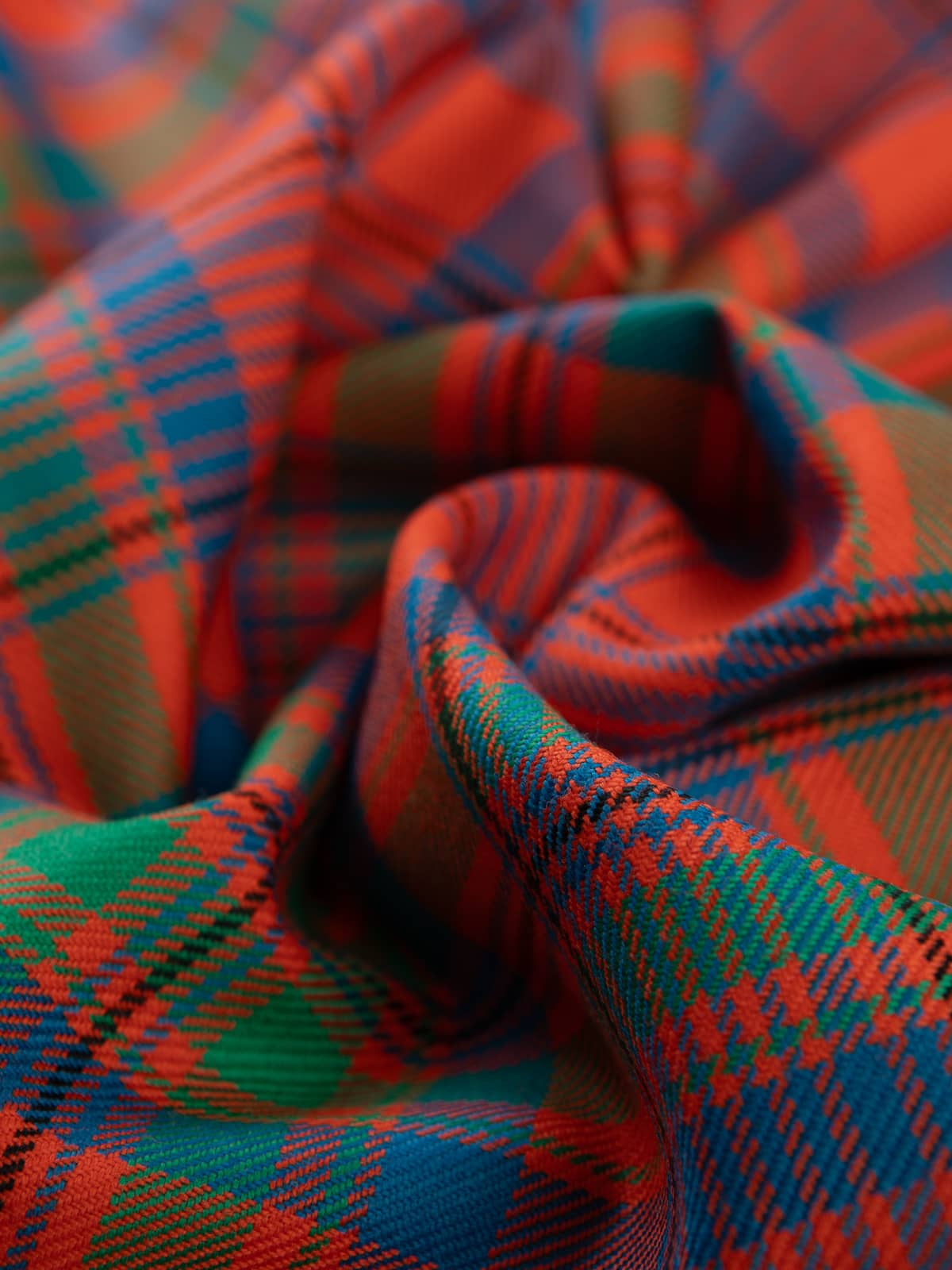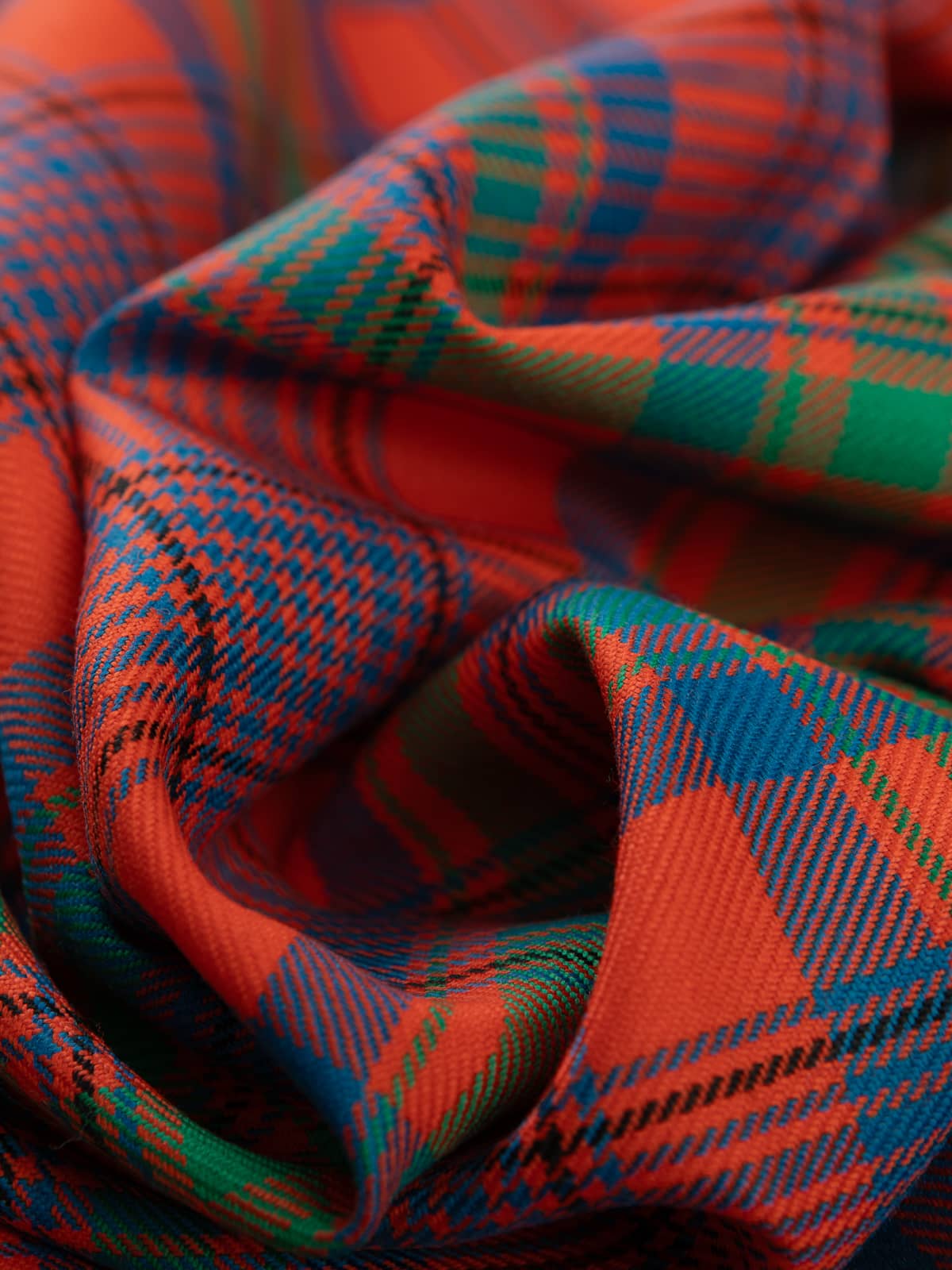 Shades: A vibrant palette dominated by rich orange‑red, complemented by forest green and deep royal blue. Slim accents of mustard yellow and black run throughout the pattern, adding definition and highlighting the intersections. The combination creates a warm, lively appearance rooted in traditional Highland colouration.