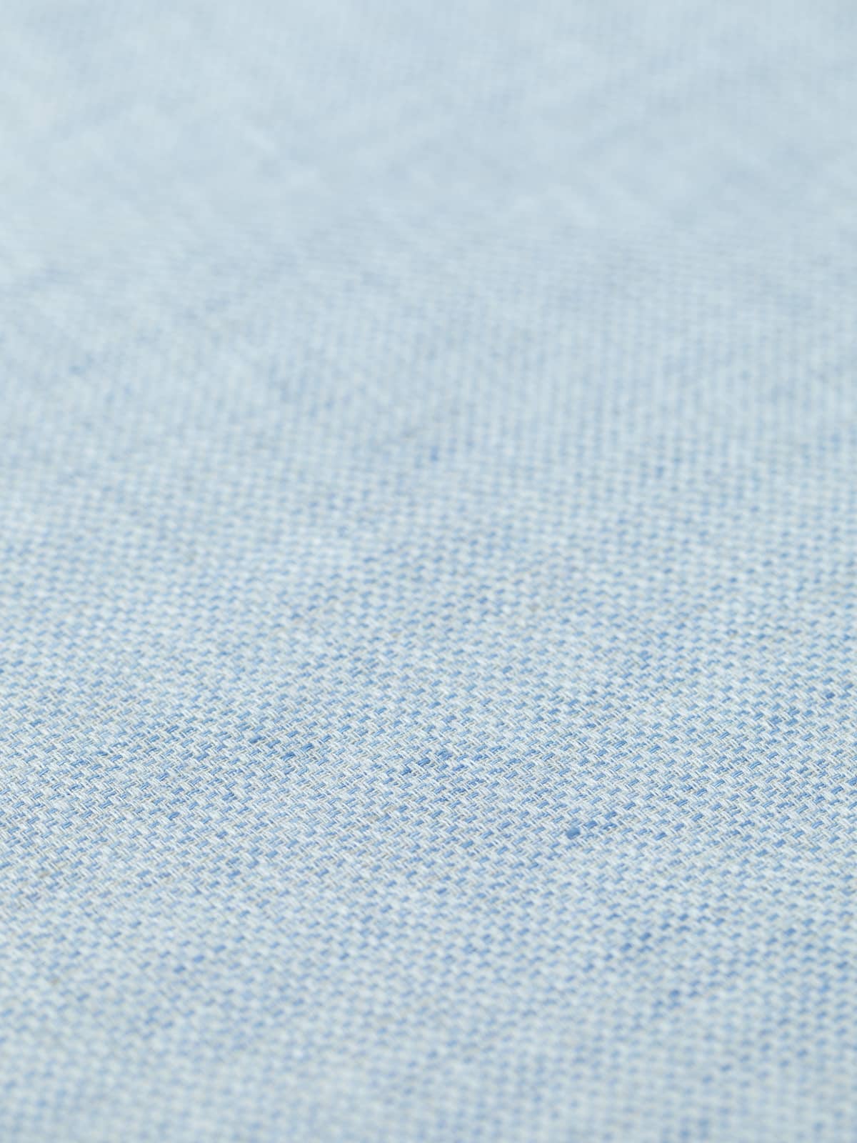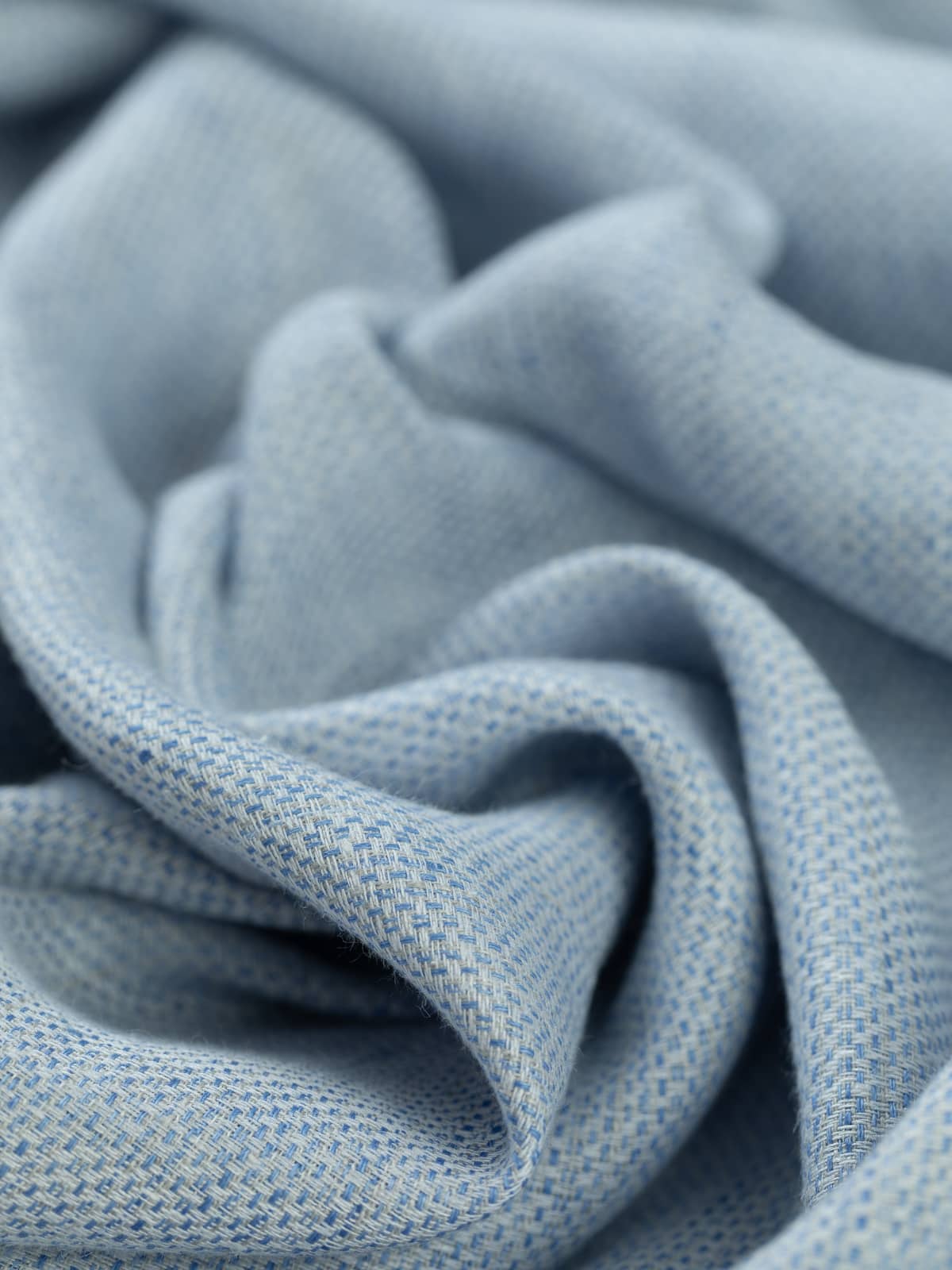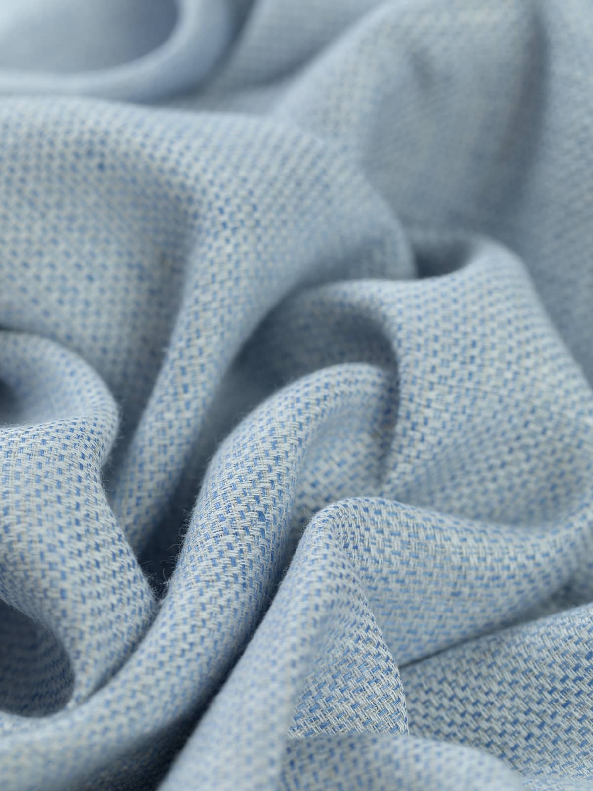 Shades: This superb quality linen and viscose fabric is woven with a fresh cloud‑white warp of finely stacked yarns that support alternating groups of silken blue and cloud white through the warp.