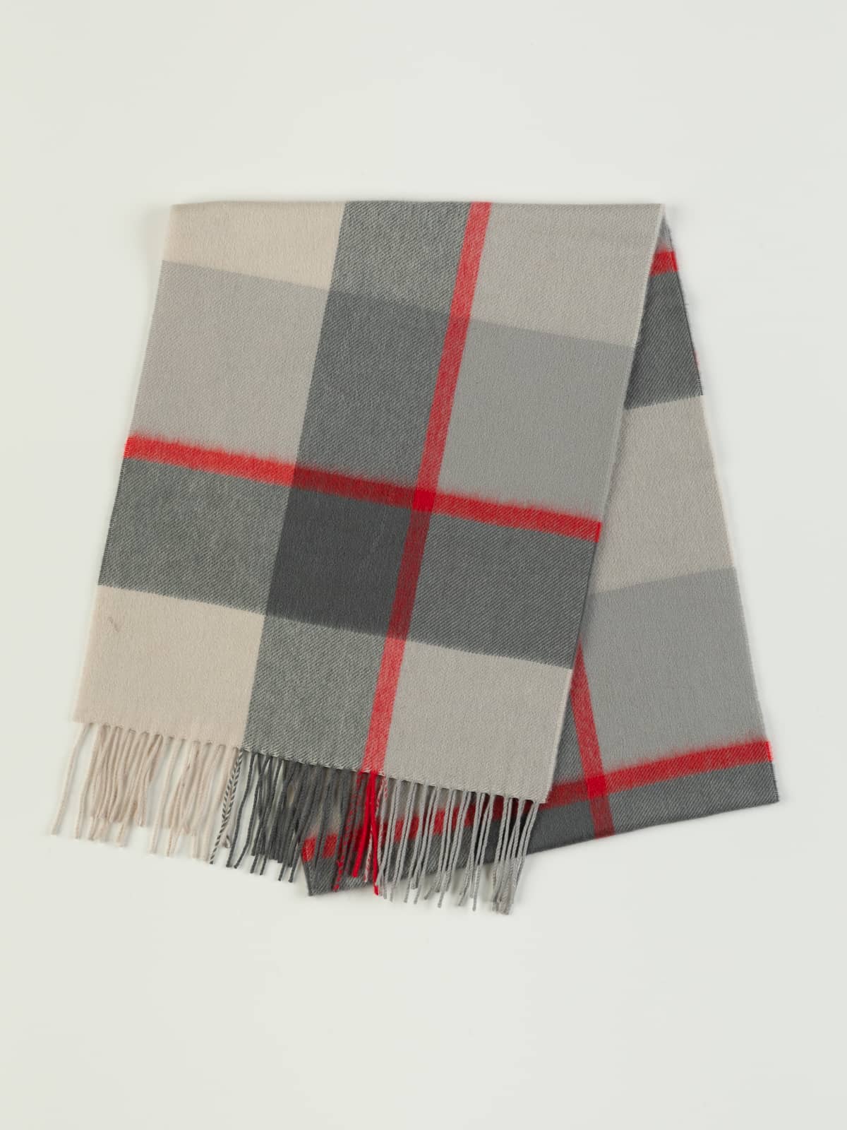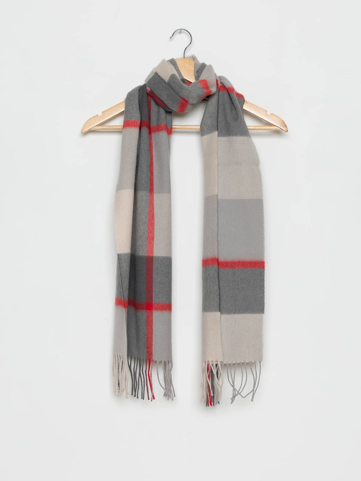 This serene plaid blends smoke grey, natural white and soft fog tones, echoing a morning walk through Yorkshire mist. Calm and quietly refined, its neutral palette pairs beautifully with winter layering. Pure cashmere gives it an effortlessly smooth drape and gentle warmth, understated luxury at its best.