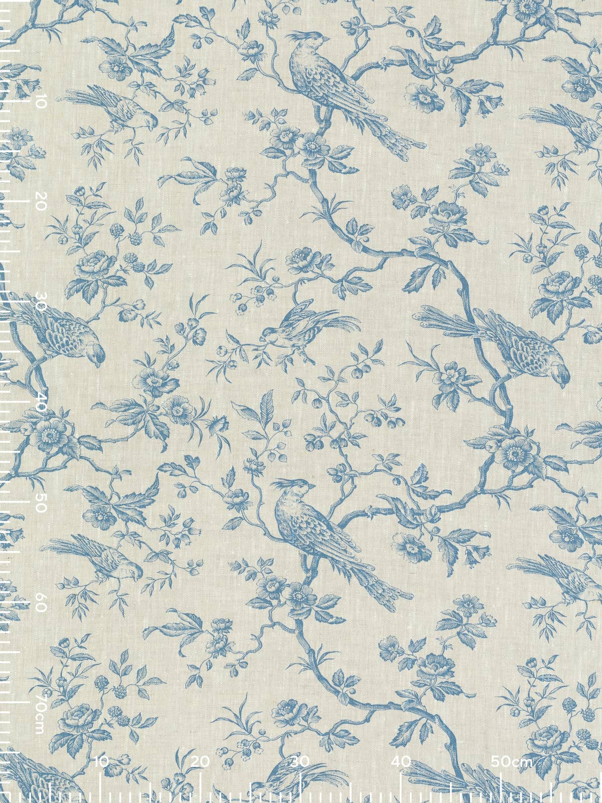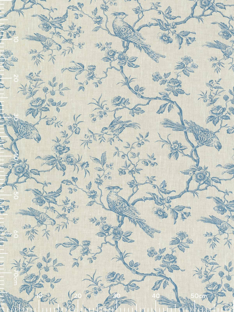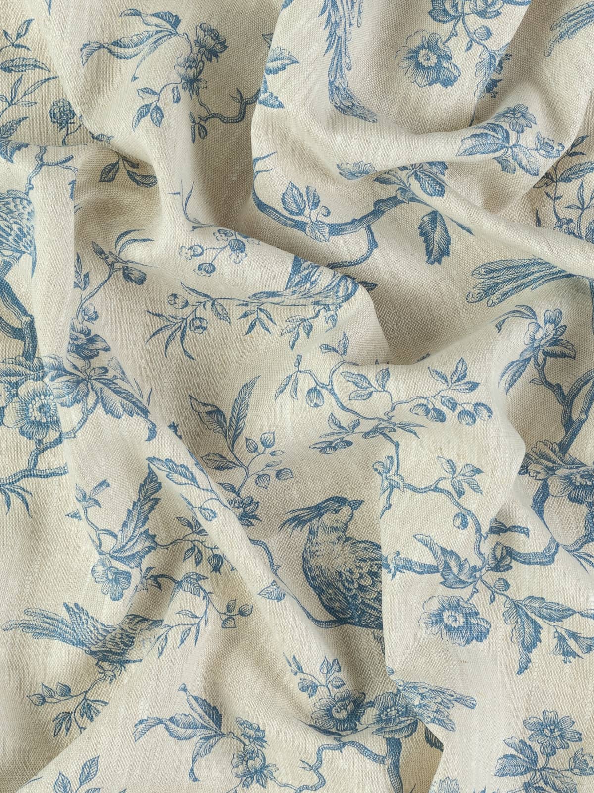 Printed 100% Linen Curtaining - Bleu Rococo Aviary