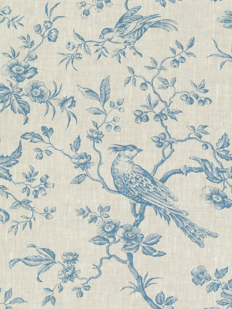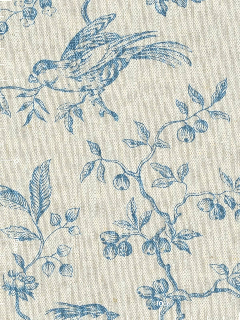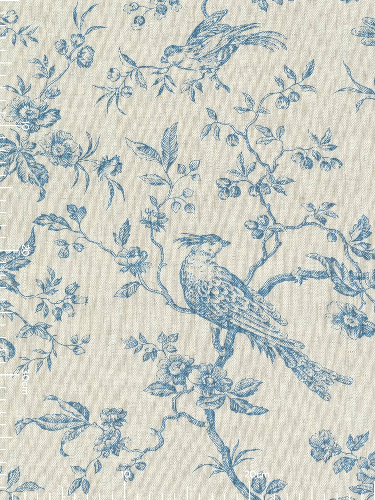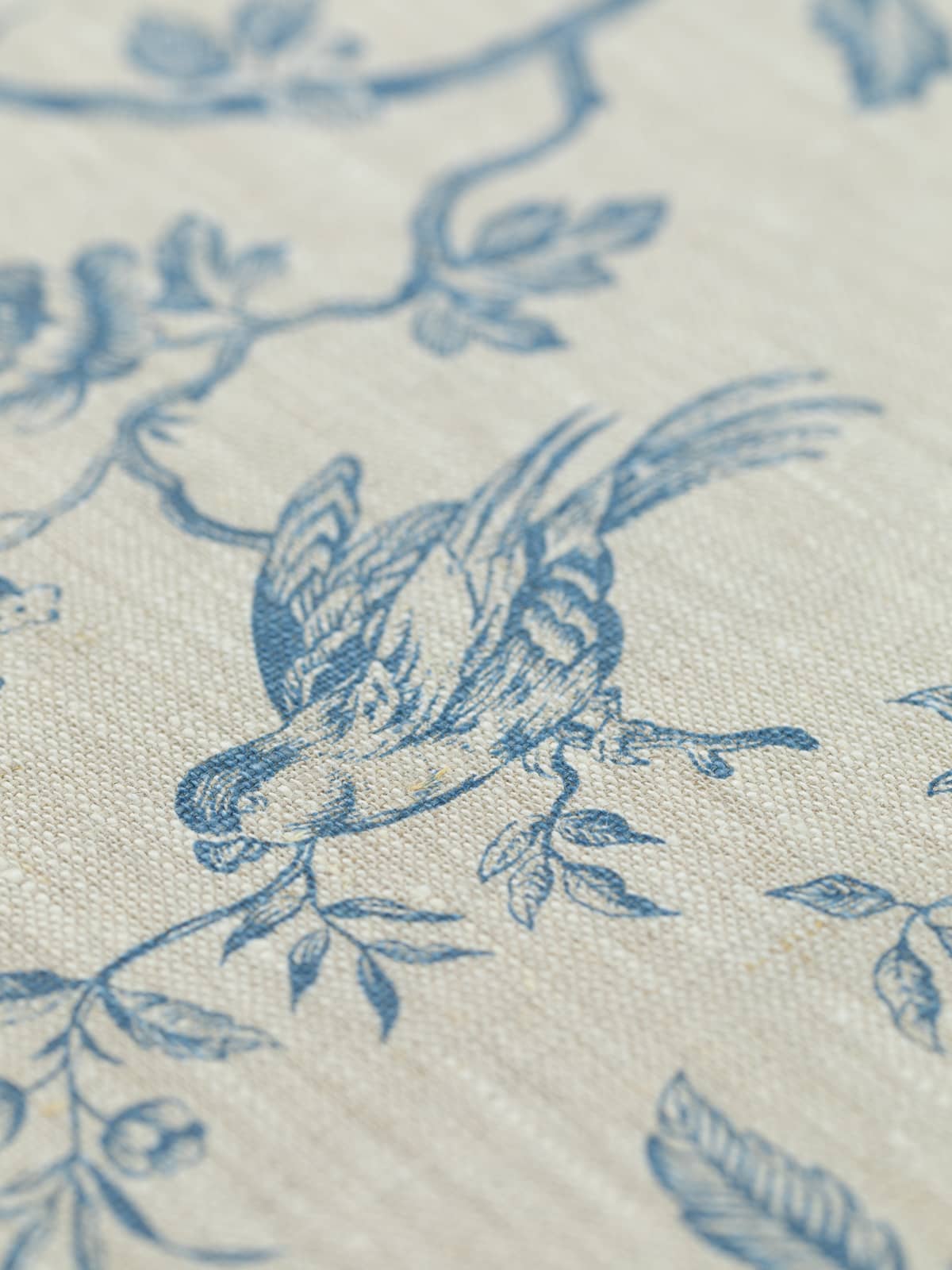 Printed 100% Linen Curtaining - Bleu Rococo Aviary