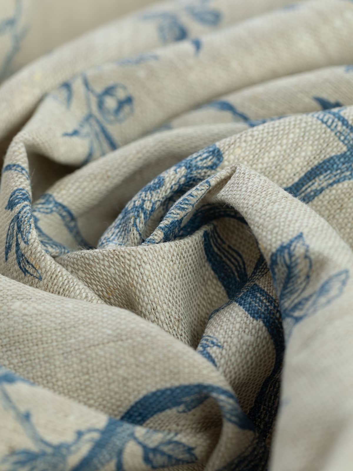 Bleu Rococo Aviary features a pleasing, lightly textured linen feel, interspersed with light, even slubs throughout, offering that classic country linen style. It has a soft, clean hand, and is stable, strong and hard-wearing. This fabric will drape beautifully at length and will soften with washing.
