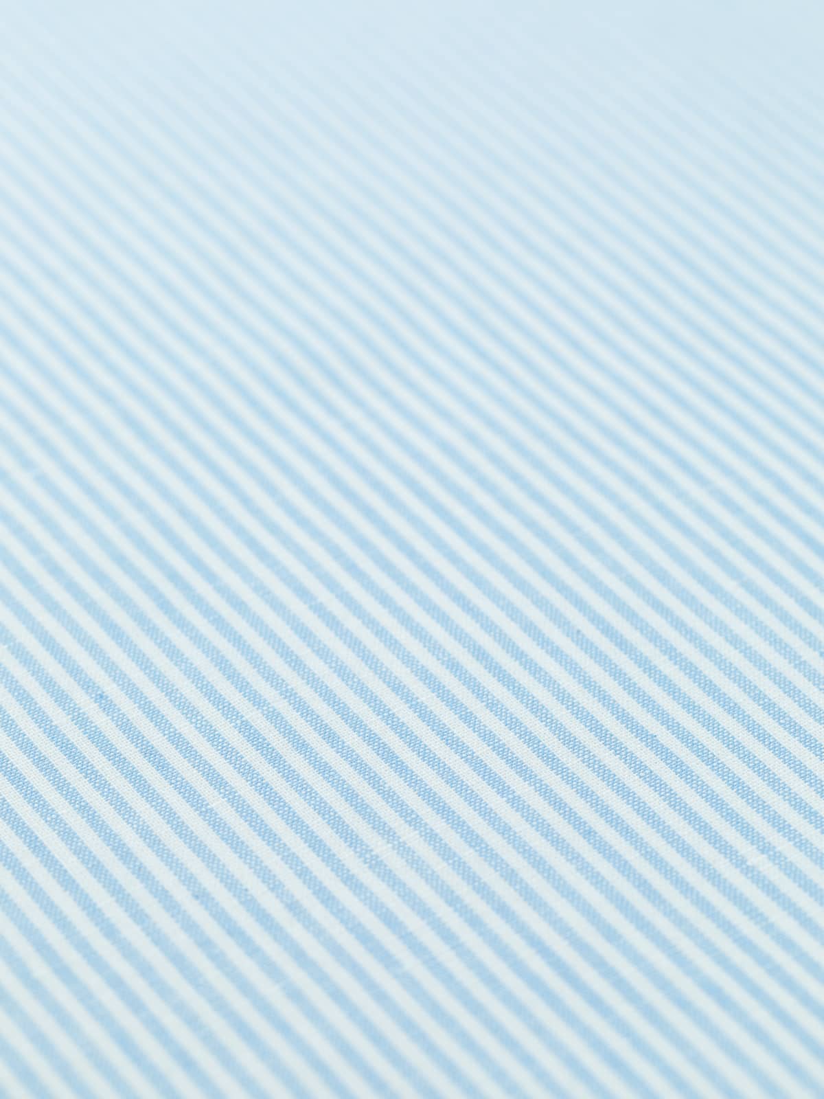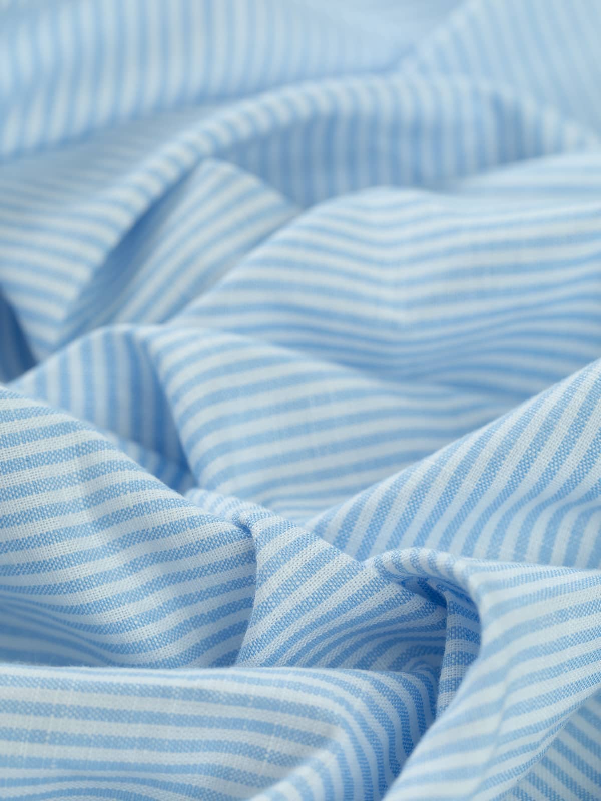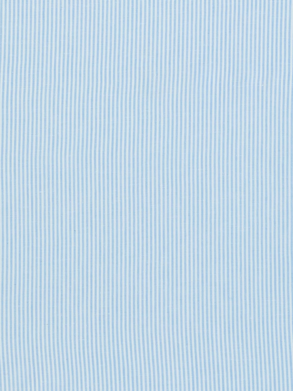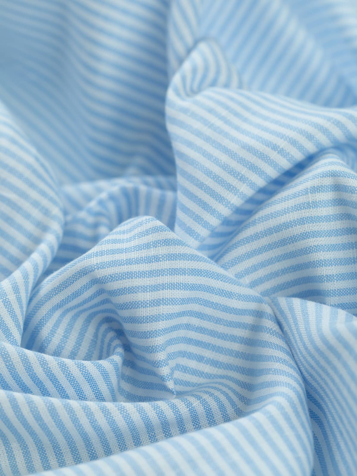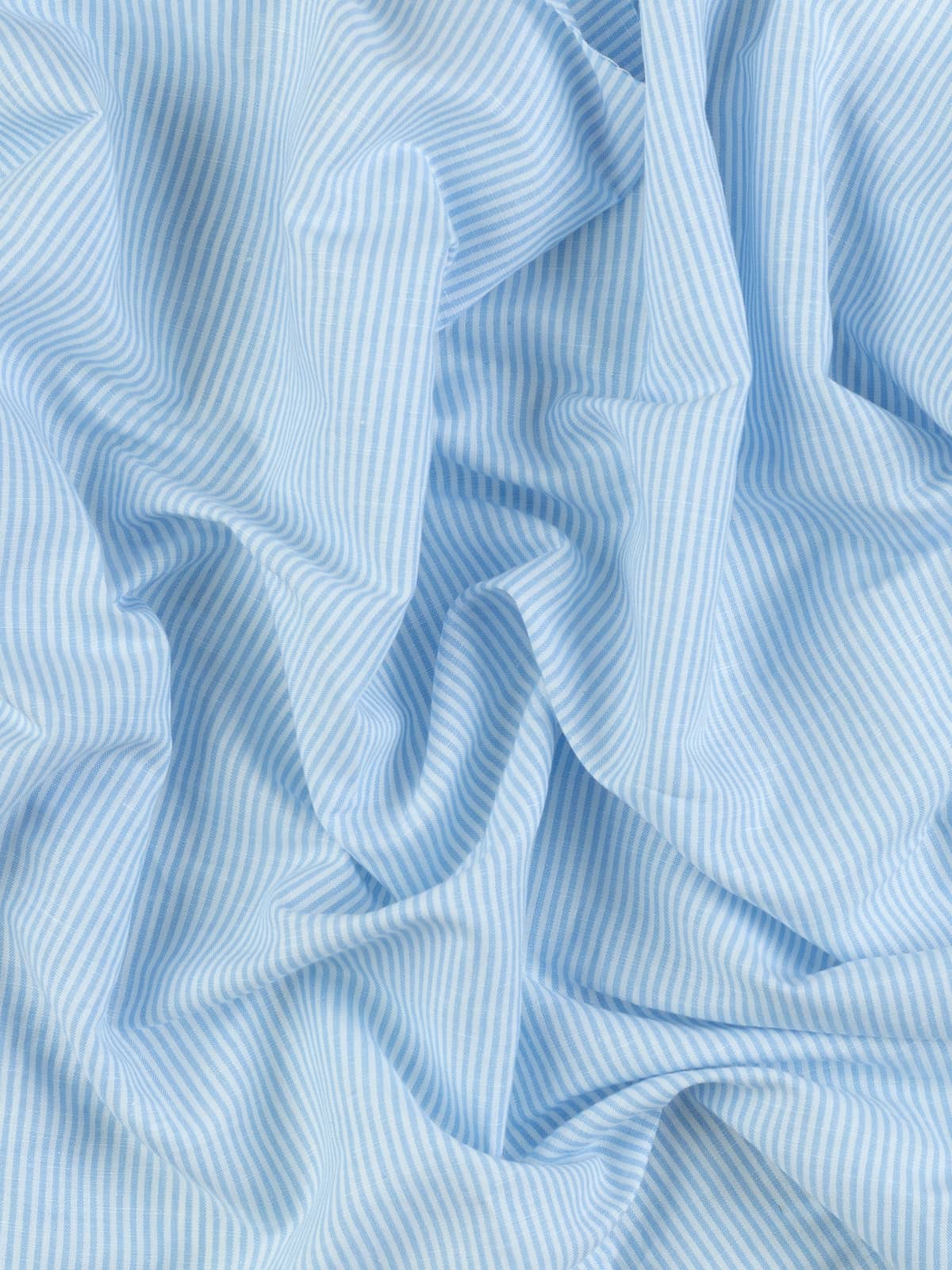 Design: Woven, not printed, with alternating weft yarns forming summery candy stripes in hues of sweet baby blue and fresh white. A classic fine white weft yarn unifies the weave and creates the classic hazy, finely slubbed look of linen.