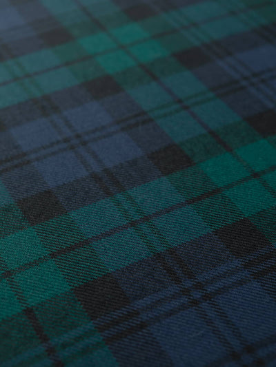 Woven in the UK from first-quality worsted wool yarns, these tartans have a smooth handle, clear pattern definition, and beautiful drape. The worsted spinning process aligns the fibres before spinning, producing a refined surface and enhanced durability, ideal for garments that combine structure with movement.