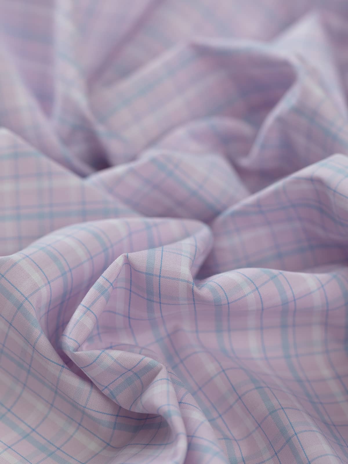 Shades: Summer Haze Check evokes the tranquil, ethereal calm of a warm summer morning. Its soft, pastel-inspired palette features a soft pink-lilac base that provides a gentle, romantic foundation, echoing morning light and subtle warmth. Overchecks in aeroplane‑trail white and clear‑sky blue interlace with the lilac to evoke the serene clarity of early daylight.