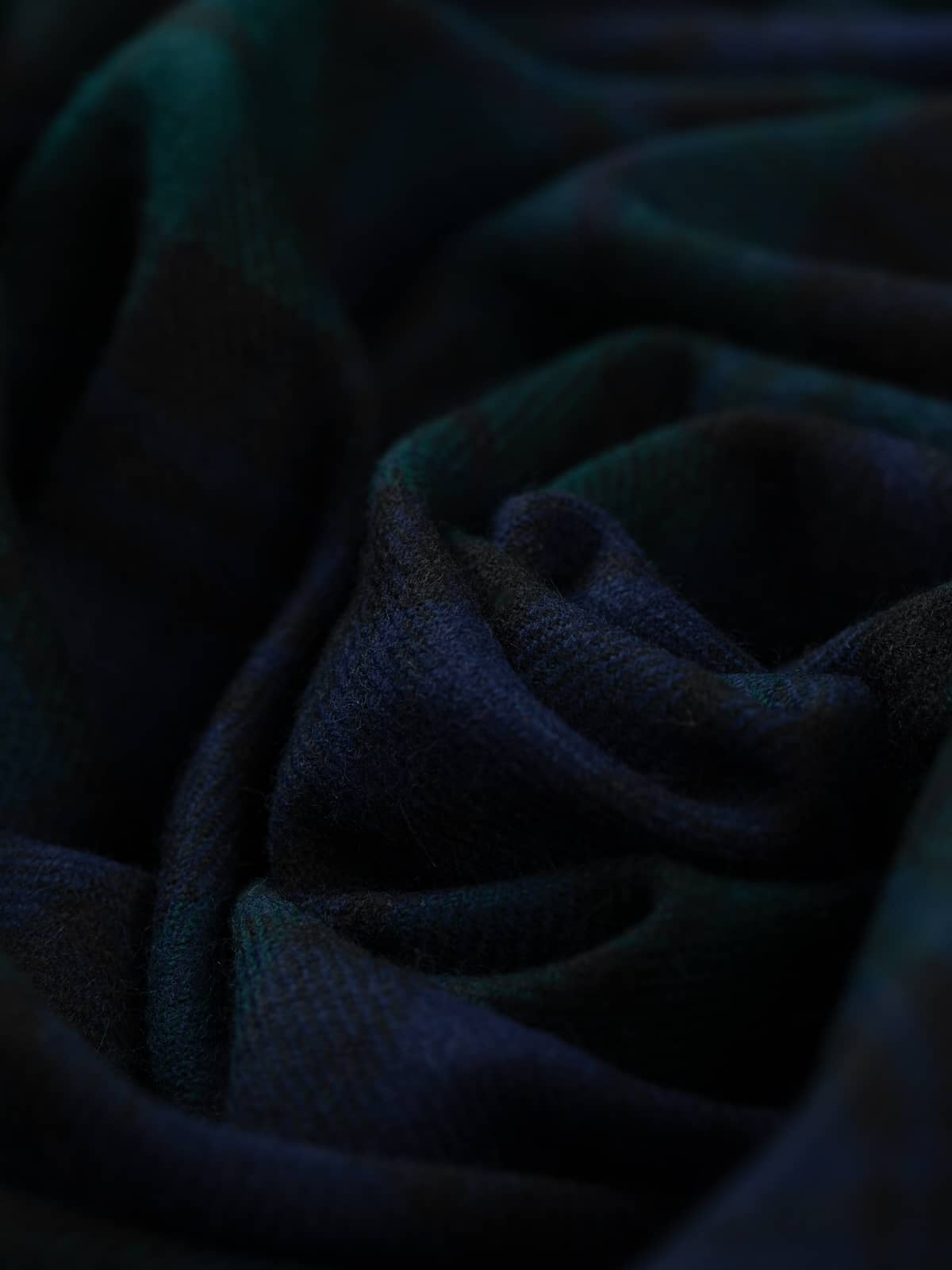 Shades: Black Watch Tartan is a deep, contemplative blend of midnight black, forest green and navy blue. The black lends quiet strength and grounding, while the greens evoke Highland woods and moss-covered hills under soft, filtered light. Navy blue threads provide cool depth, reminiscent of shadowed loch waters at dusk. The overall palette is subtle yet rich, a serene interplay of dark tones that conveys endurance, tradition and understated elegance.