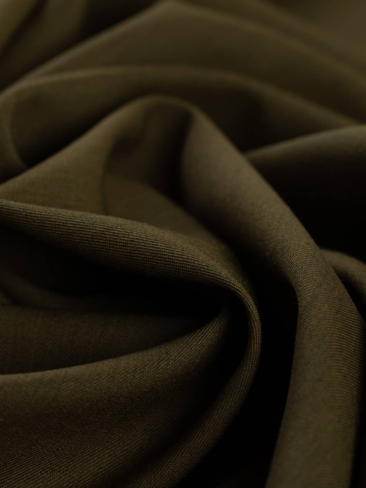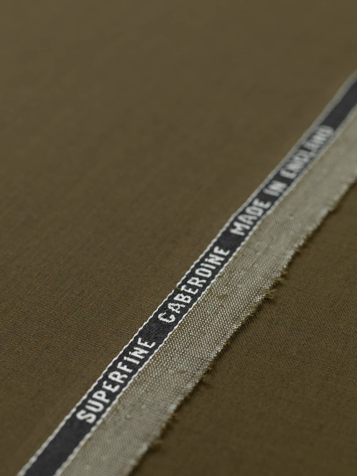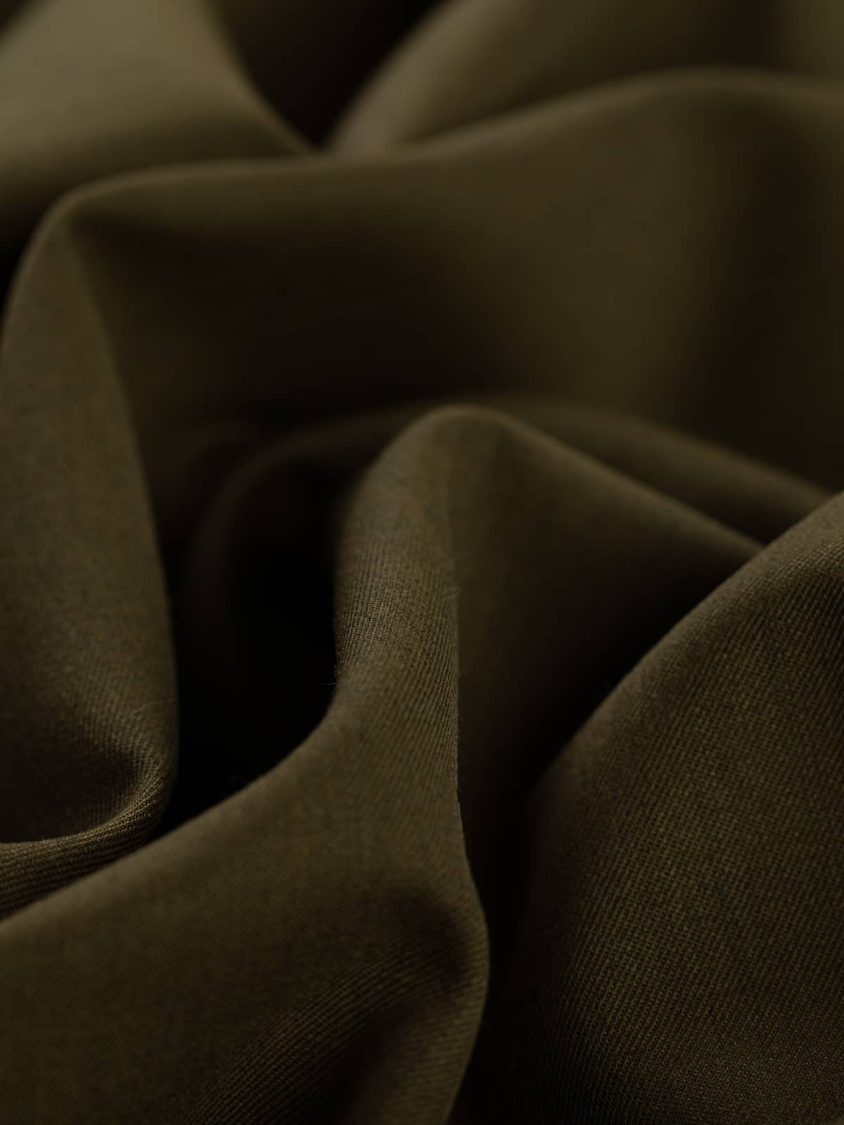 Shade: This woven selvedge, fine wool-blend gaberdine boasts a rich and deep earthy olive green hue. There's something very reassuring about this wonderful nature hue, and it can be interpreted in so many stylish ways.