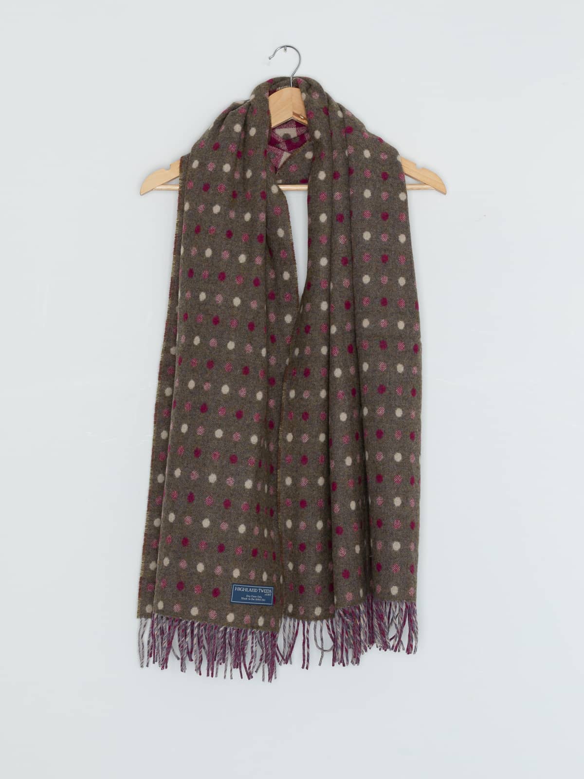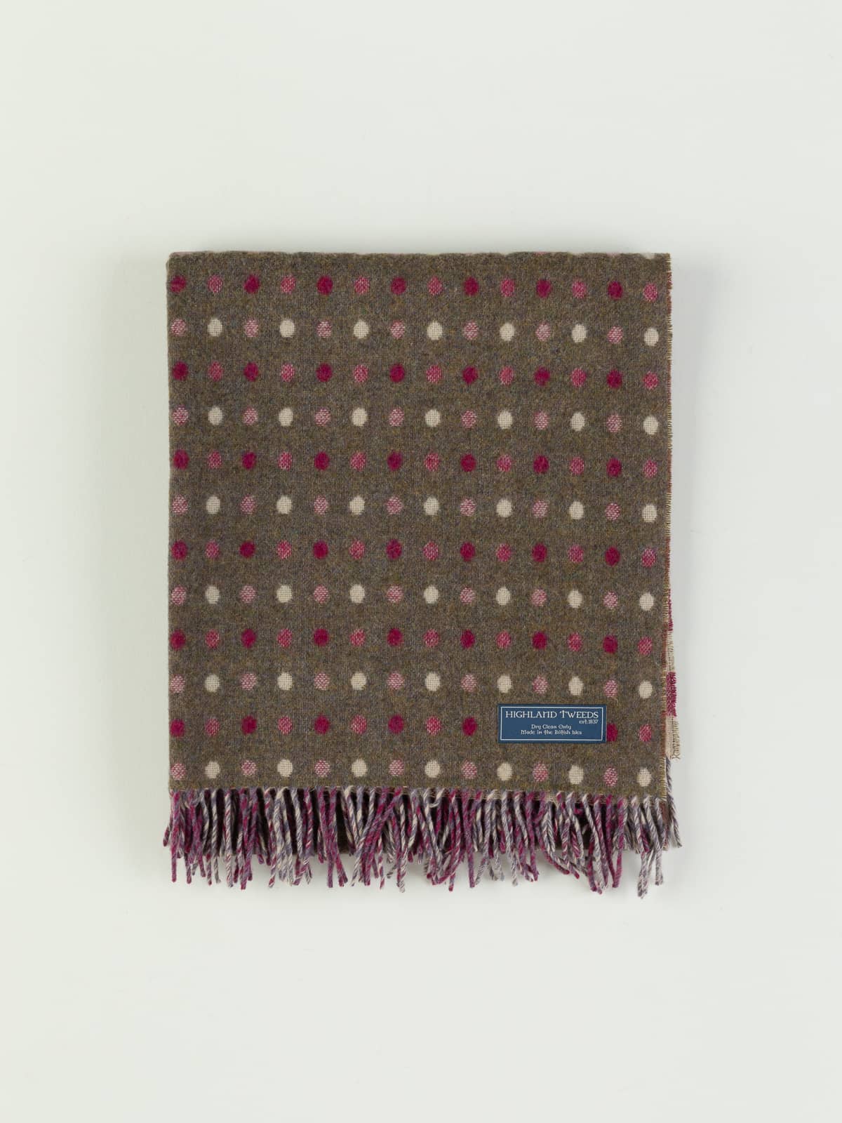 This reversible jacquard stole rests on a soft earth brown and taupe melange base, evoking the warmth of sun-dried orchard soil. Its scattered accent spots bring the palette to life with natural dewy tones, gentle cream and vibrant magenta berry touched with soft lilac for a hint of seasonal sweetness. With its smooth merino drape and beautifully balanced colouring, it offers a graceful way to welcome the softer side of autumn.