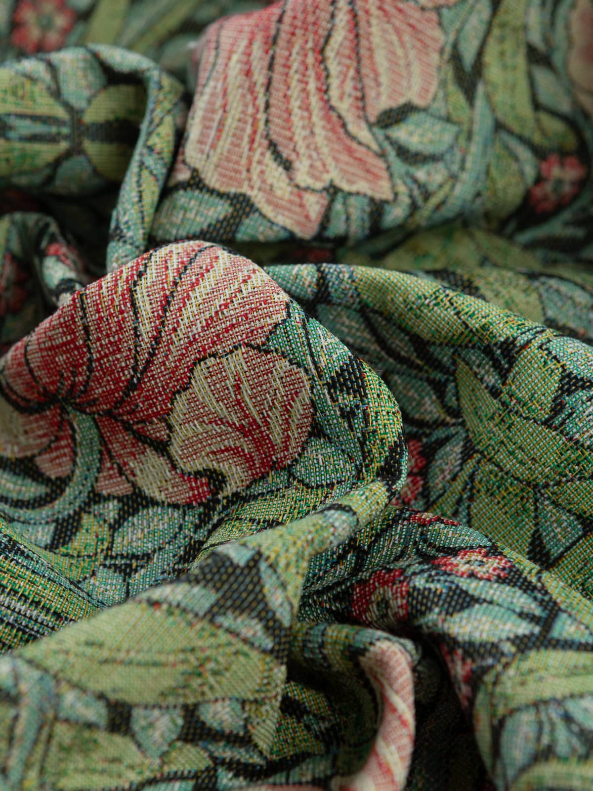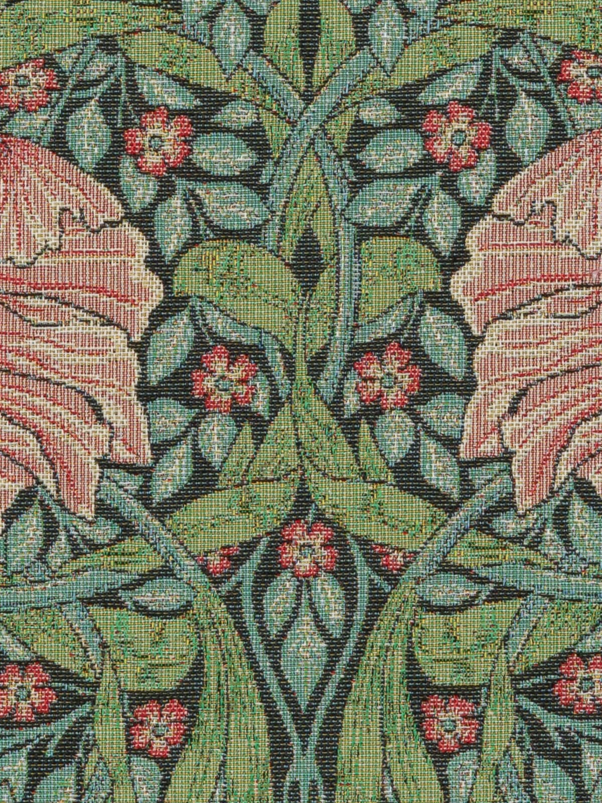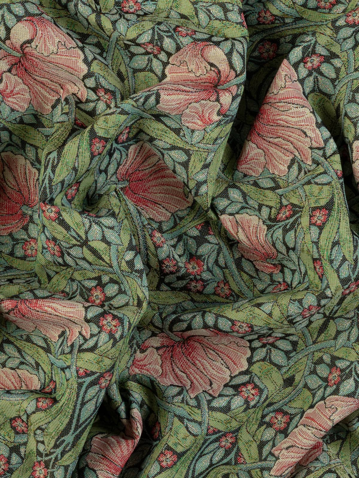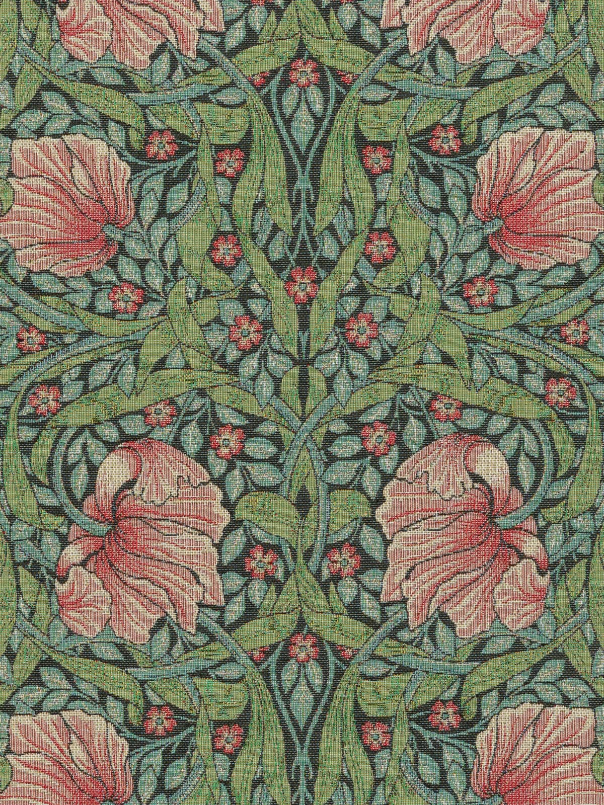 Design: This jacquard-woven, tapestry-style fabric features the classic Morris “Pimpernel” design, one of William Morris’s most celebrated repeating textile patterns, based on an original Morris design from 1876. The design is a simplified interpretation of the Morris classic, featuring romantic, full tulip flowers and graceful, intertwining foliage that form an unusual and mesmerising figure-of-eight pattern.