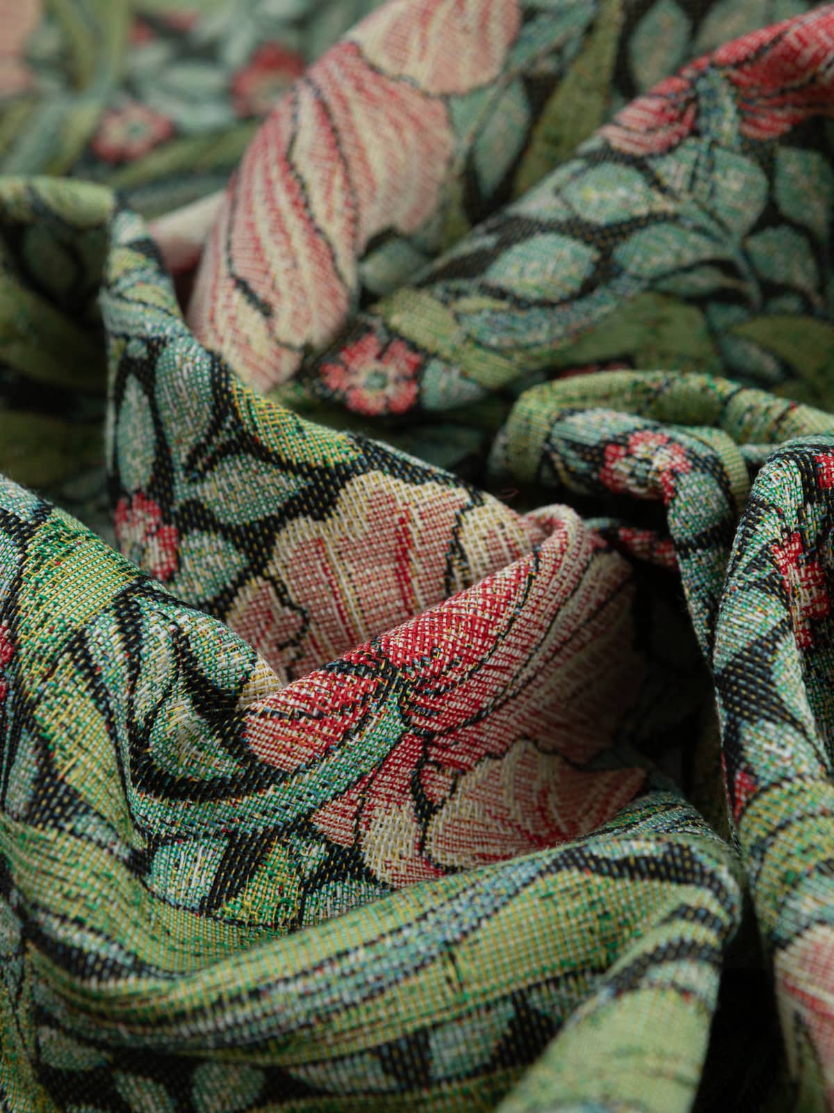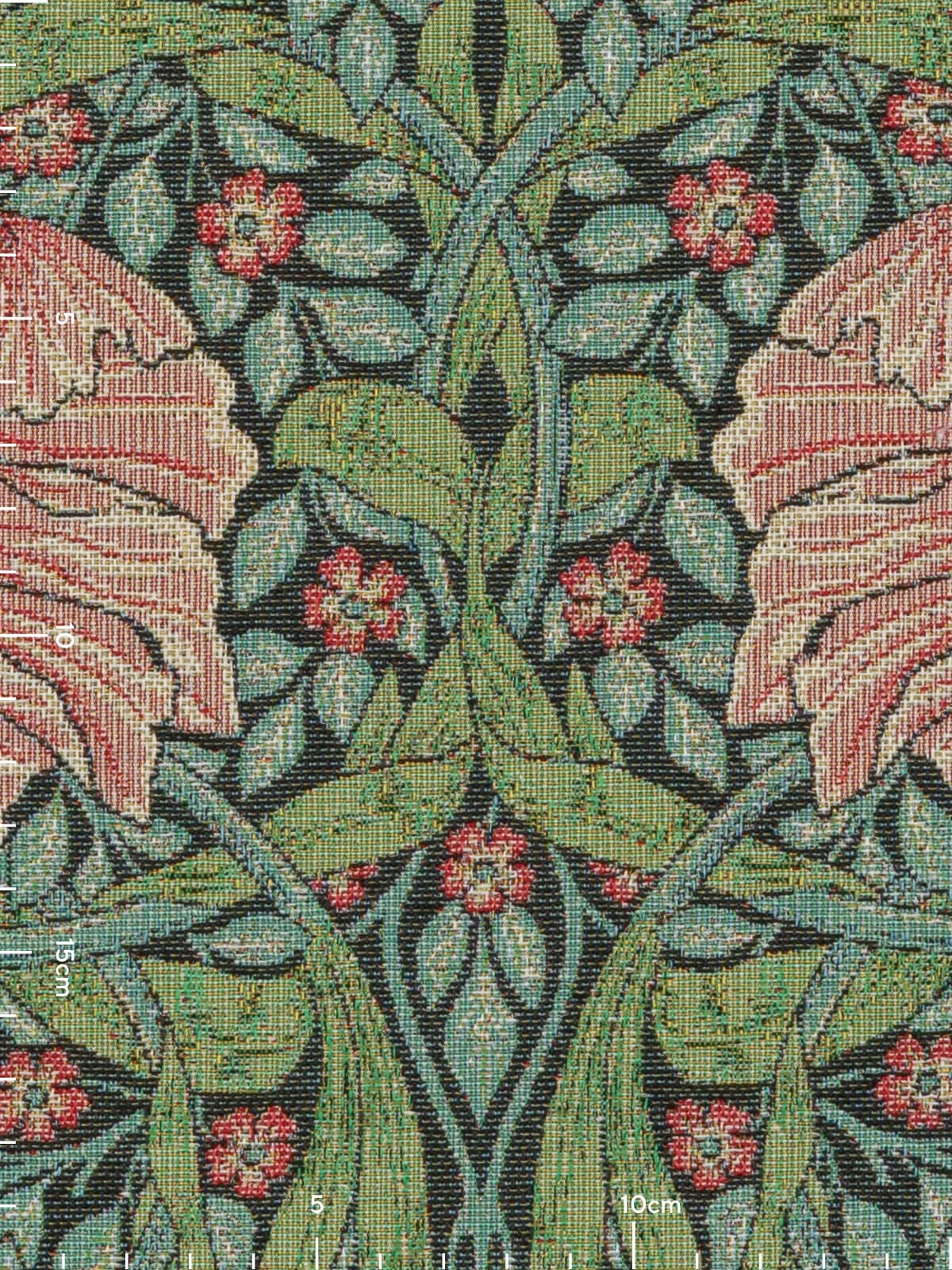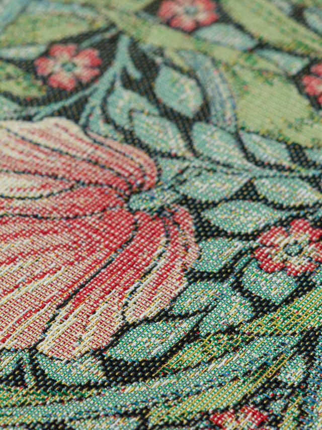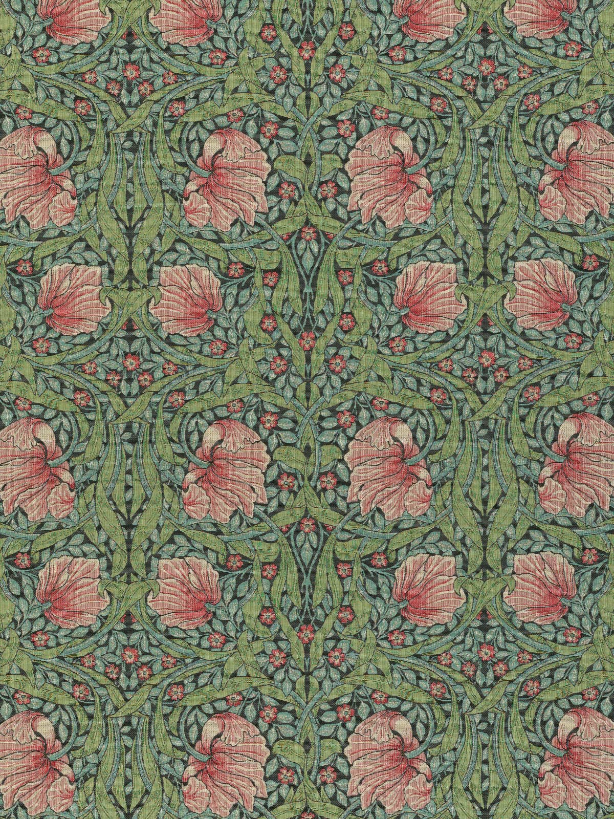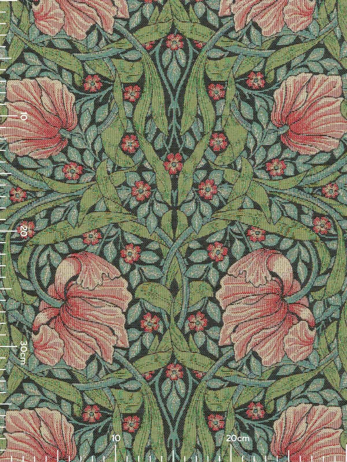 Design: This jacquard-woven, tapestry-style fabric features the classic Morris “Pimpernel” design, one of William Morris’s most celebrated repeating textile patterns, based on an original Morris design from 1876. The design is a simplified interpretation of the Morris classic, featuring romantic, full tulip flowers and graceful, intertwining foliage that form an unusual and mesmerising figure-of-eight pattern.
