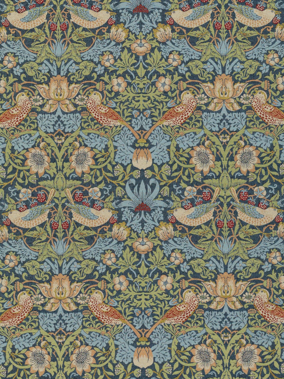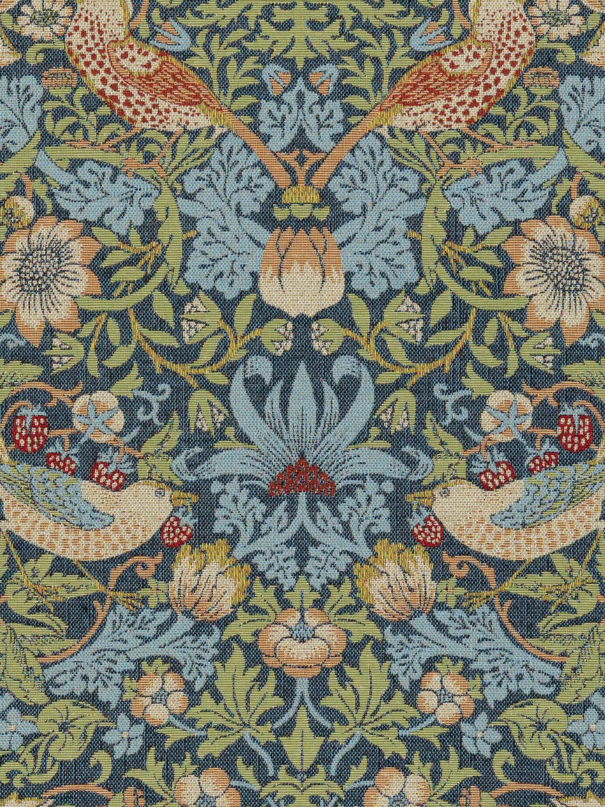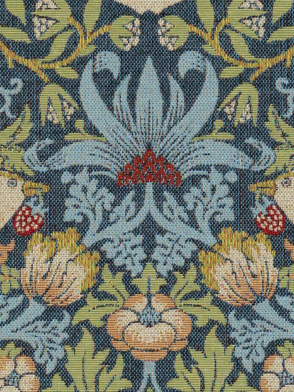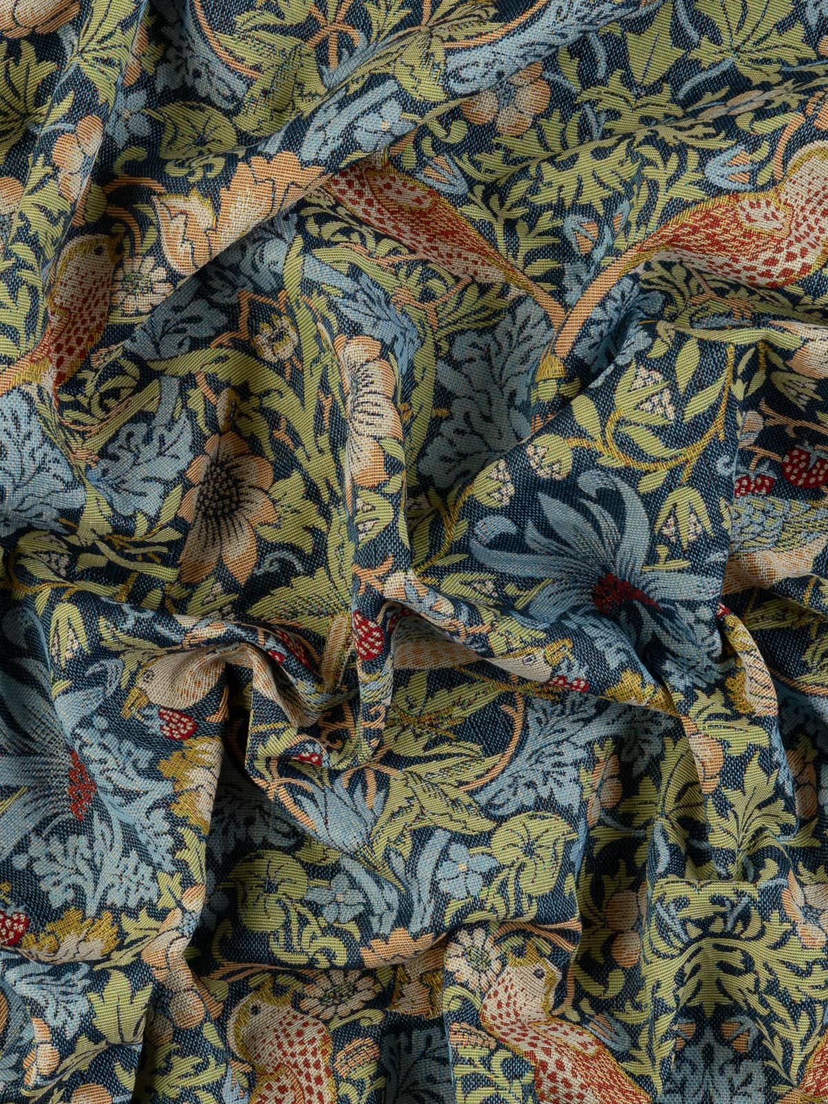 Design: This jacquard-woven, tapestry-style fabric features the classic Morris “Strawberry Thief” design, one of William Morris’s most celebrated repeating textile patterns. The motif takes its inspiration from the thrushes Morris observed stealing fruit from the kitchen garden of his countryside home, Kelmscott Manor, weaving nature and narrative into the fabric itself.