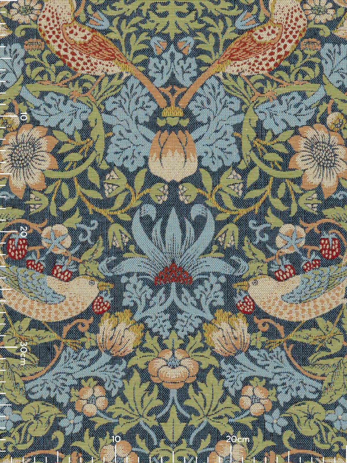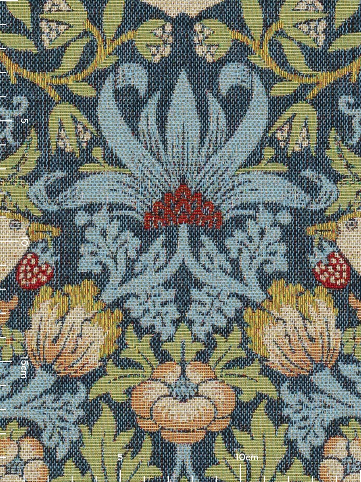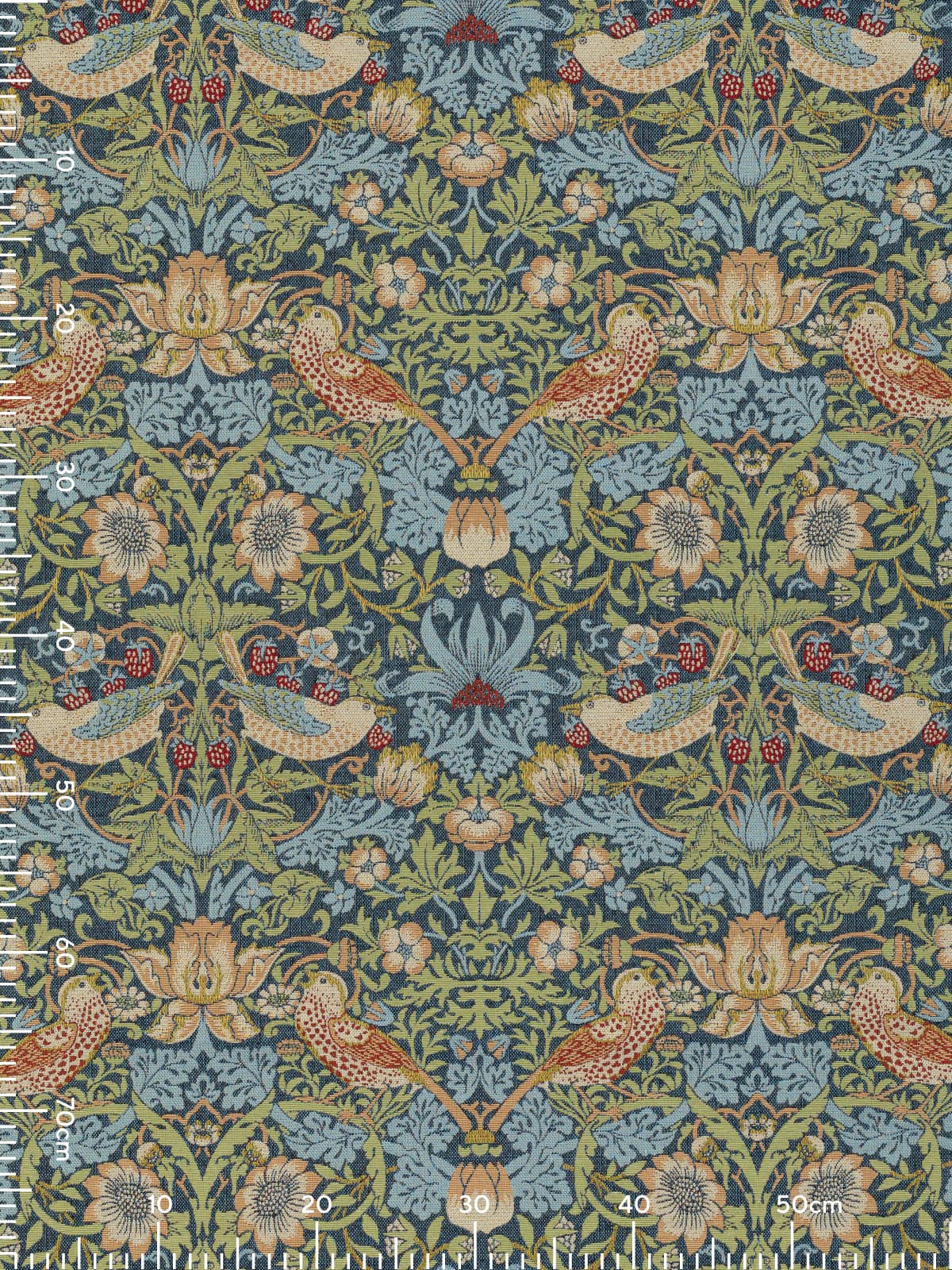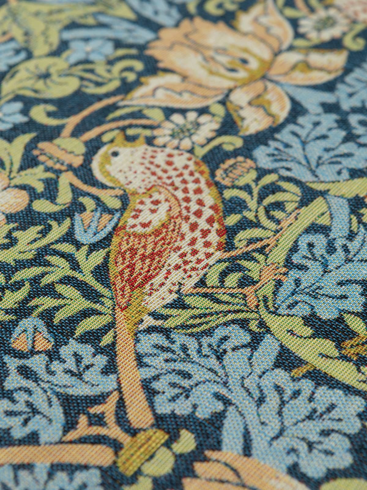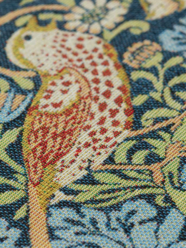 Design: This jacquard-woven, tapestry-style fabric features the classic Morris “Strawberry Thief” design, one of William Morris’s most celebrated repeating textile patterns. The motif takes its inspiration from the thrushes Morris observed stealing fruit from the kitchen garden of his countryside home, Kelmscott Manor, weaving nature and narrative into the fabric itself.