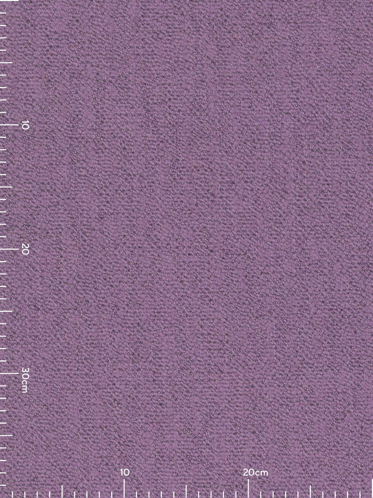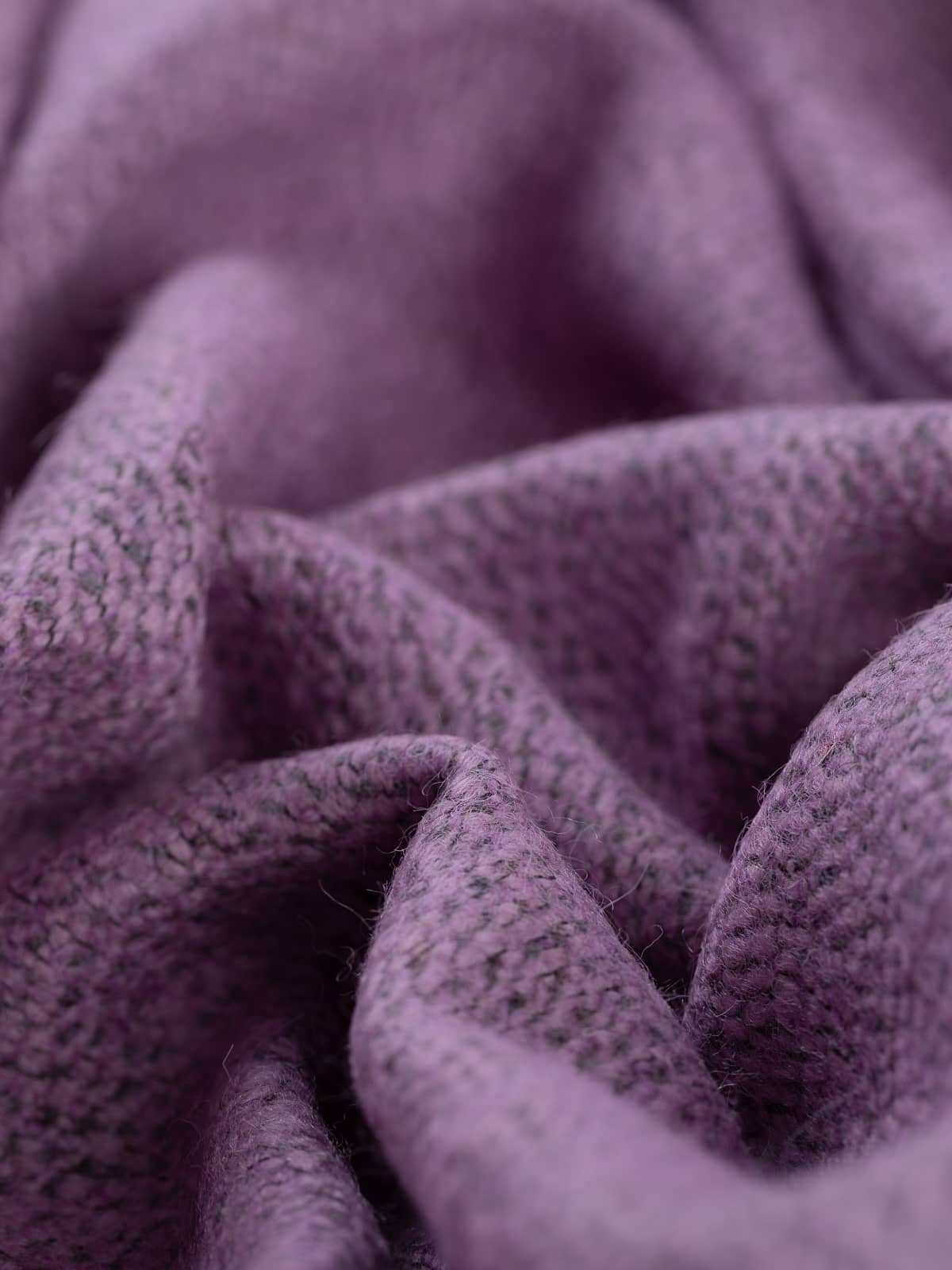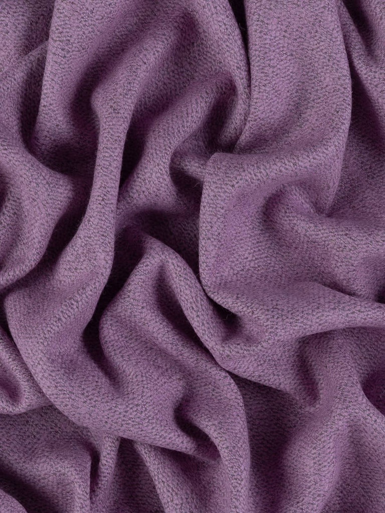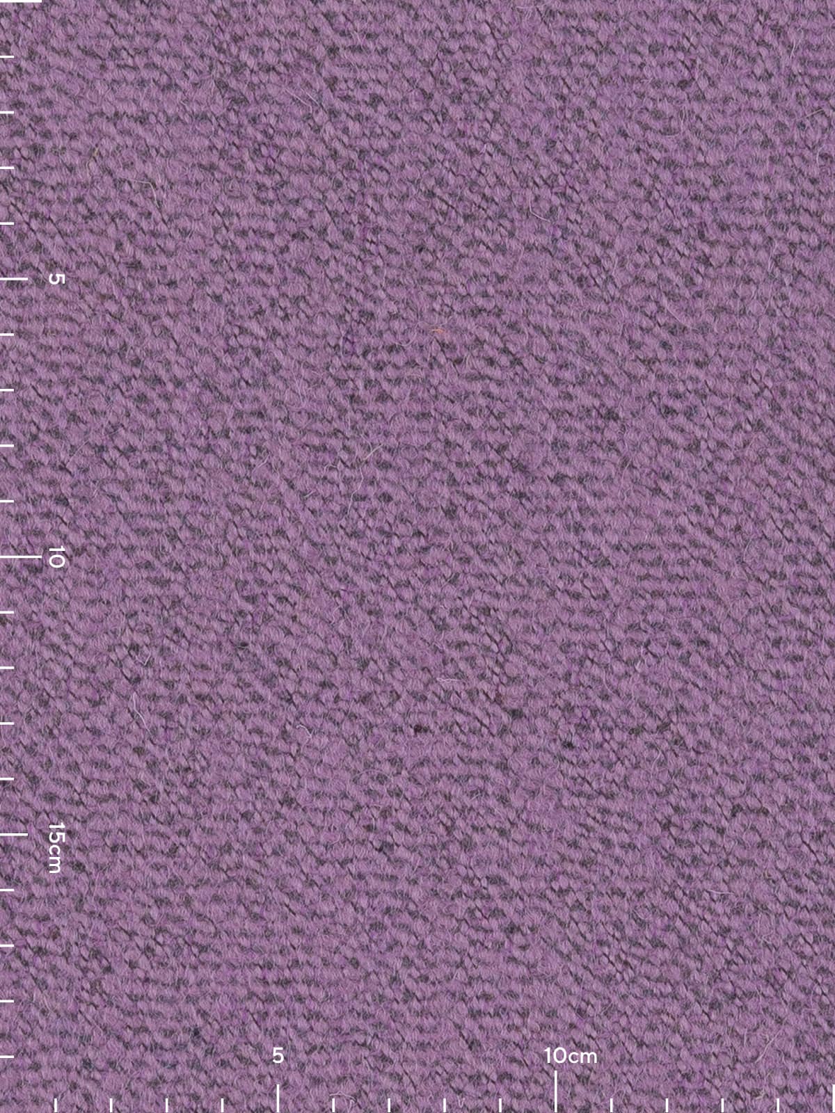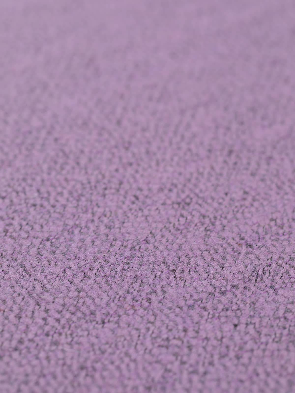 Design: The classic, rhythmic chevron pattern of a heritage herringbone weave, featuring a marled grey base. Its slightly obscured herringbone pattern softens the classic chevron into a subtle texture. Woven with a soft, brushed, heavier gauge boucle yarn featuring a predominantly lilac-amethyst hue with the addition of a superfine charcoal twist within the yarn. The weft yarns alternate between the two yarns and produce an allover marled-speckled effect to the overall surface.