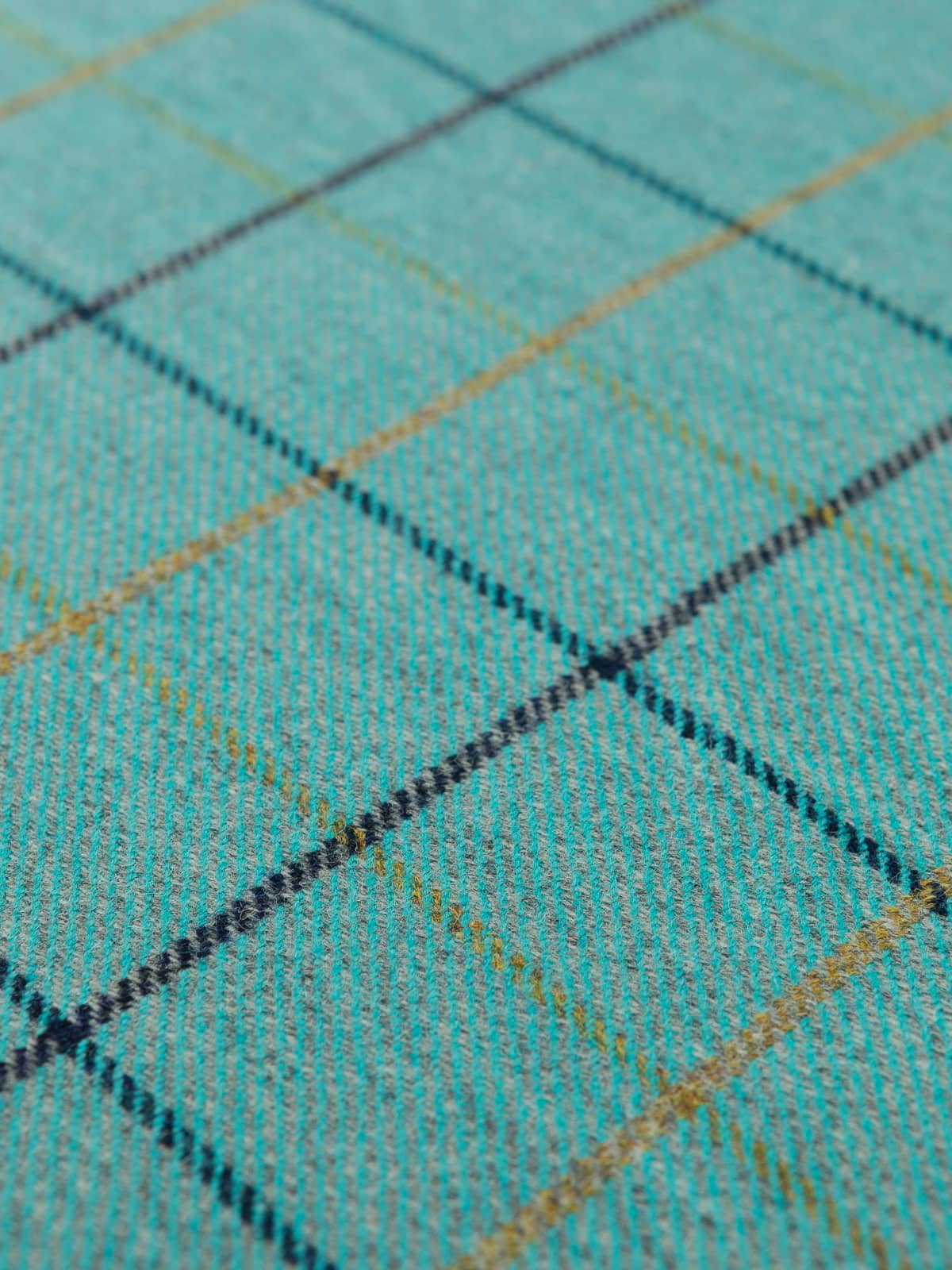 Shades: Highland Tide features a palette where warp yarns of mist grey melange hue meet weft yarns of kingfisher turquoise, evoking rising mist over glinting waters. The navy overchecks represent deep coastal shadows or stormy skies, and the sunshine gold overchecks capture fleeting rays of sunlight breaking through the clouds. The interplay of the accent overchecks with the grey warp and coloured weft creates subtle colour changes, making the gold appear to take on a slight green tone.