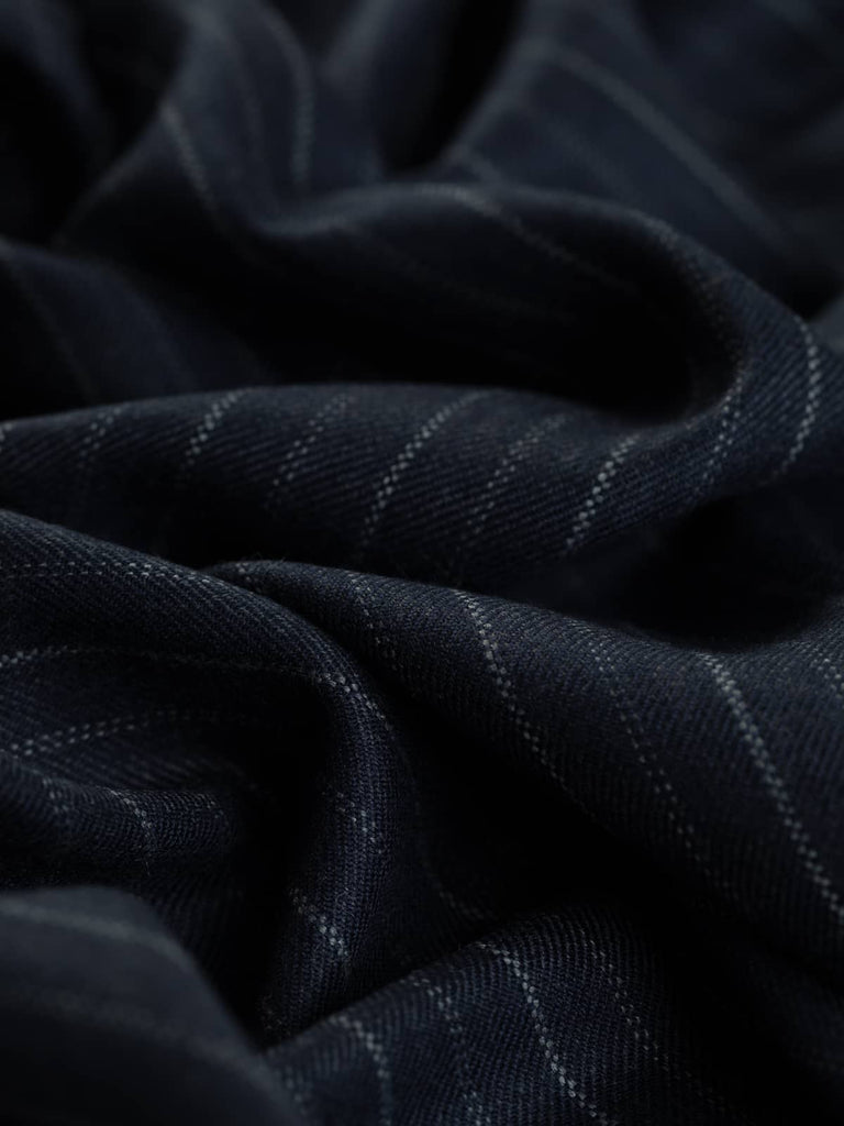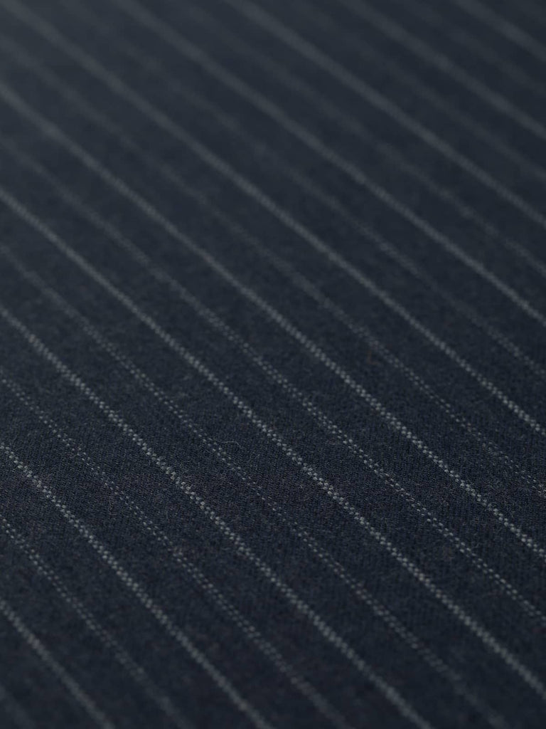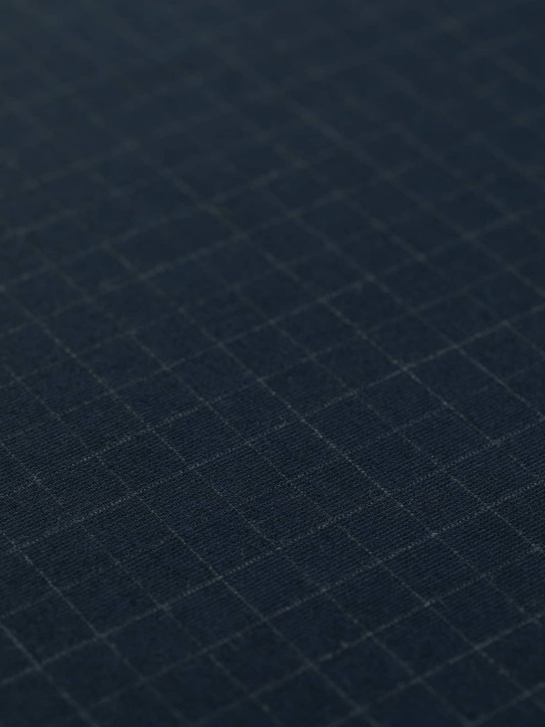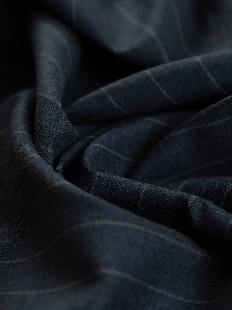Close-up of Coastal Breeze Lightweight Viscose Micro Check fabric, highlighting its delicate French navy and seaweed green hues interspersed with pearly white stripes. The fabric’s silken finish and subtle micro-check pattern evoke a breezy coastal feel, perfect for creating sophisticated shirts, flowing blouses, and elegant occasion-wear with a soft, drapey quality.
