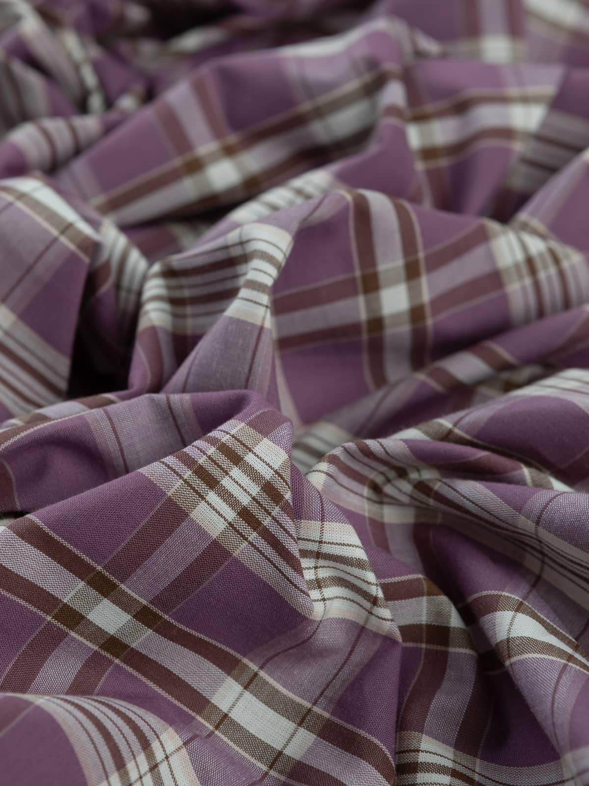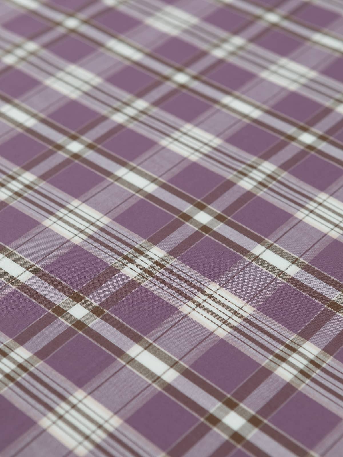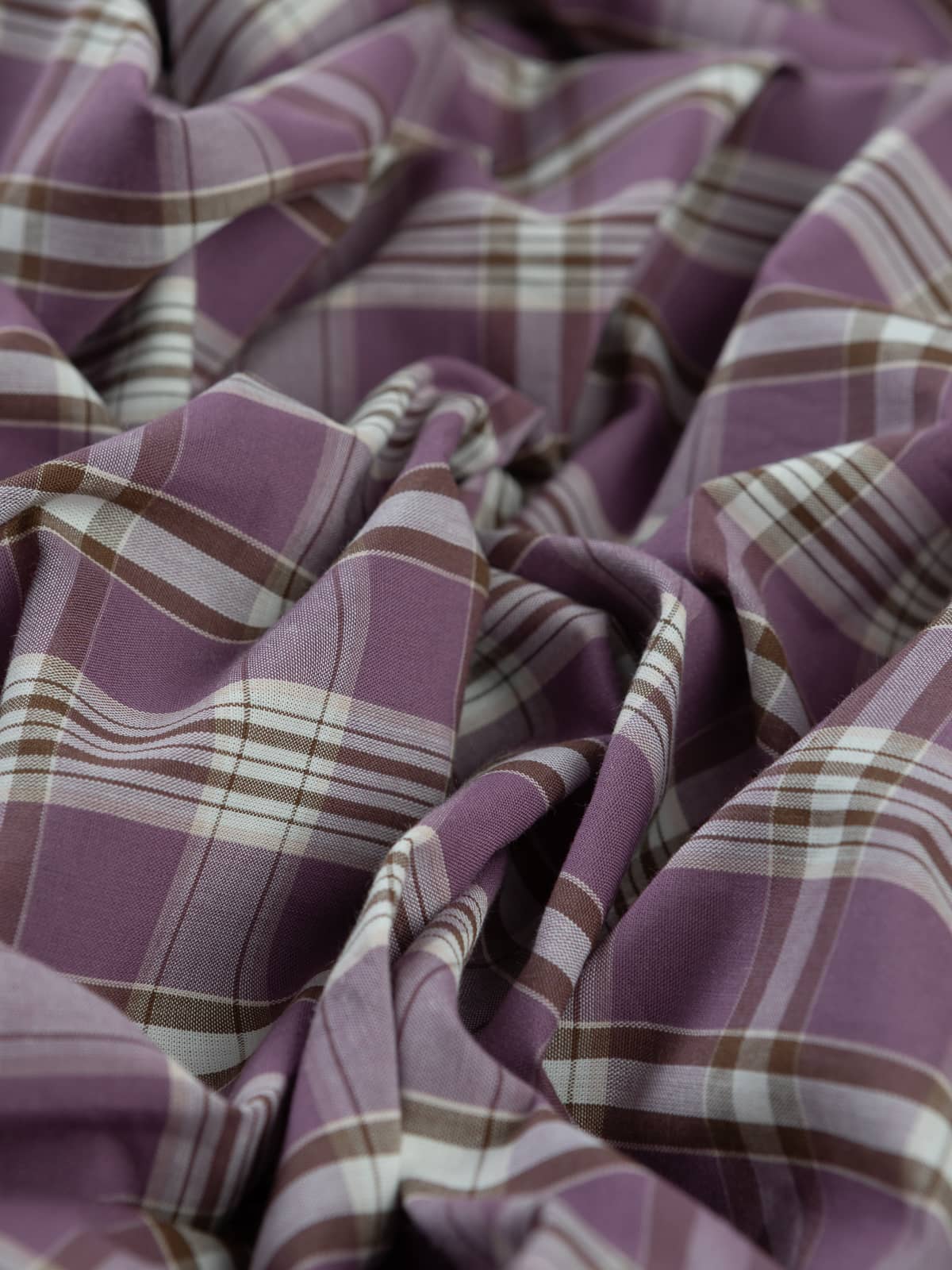Shades: This madras-style, checked, shirt-weight, cotton fabric is woven with a complementary palette of chocolate brown and rich, purple, black-cherry mauve hues set amidst fresh white, the cream to the cake!