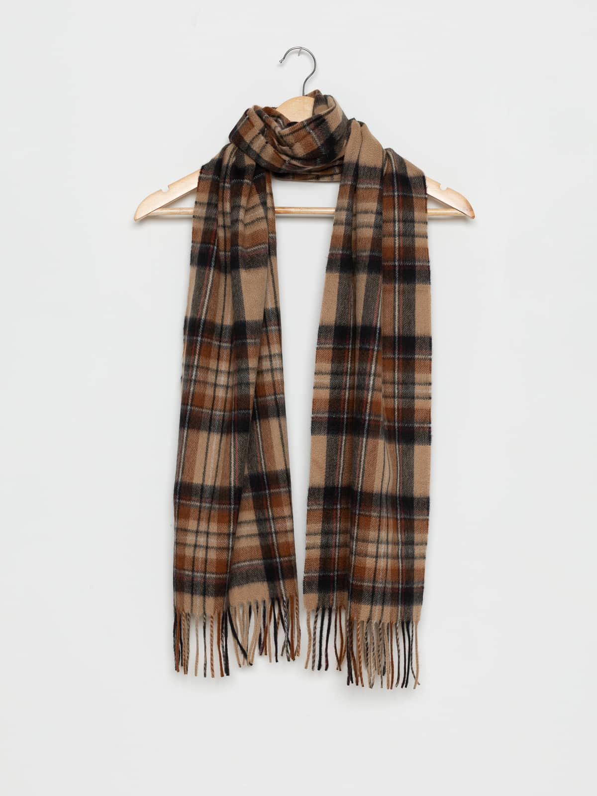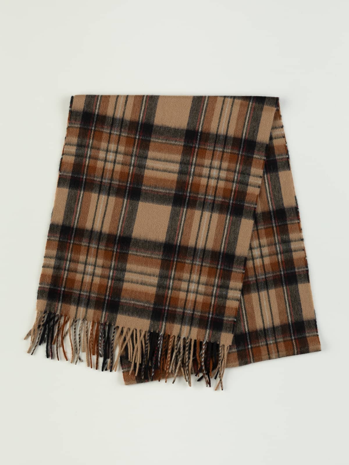 Warm mushroom, walnut and black mingle with softened amber tones, reminiscent of fresh-cut logs stacked beside a cabin hearth. This comforting check suggests weekends spent rambling through autumn woodland, returning to the glow of the fire and red-berry preserve on toast. Utterly cosy in pure cashmere, it feels like home, wherever you wander.