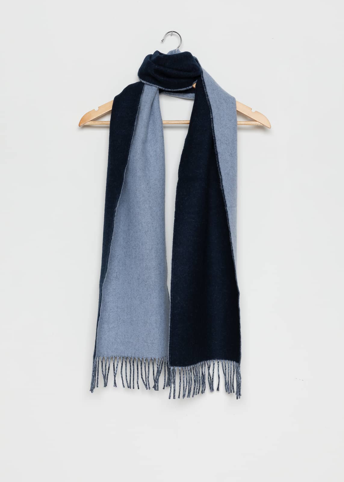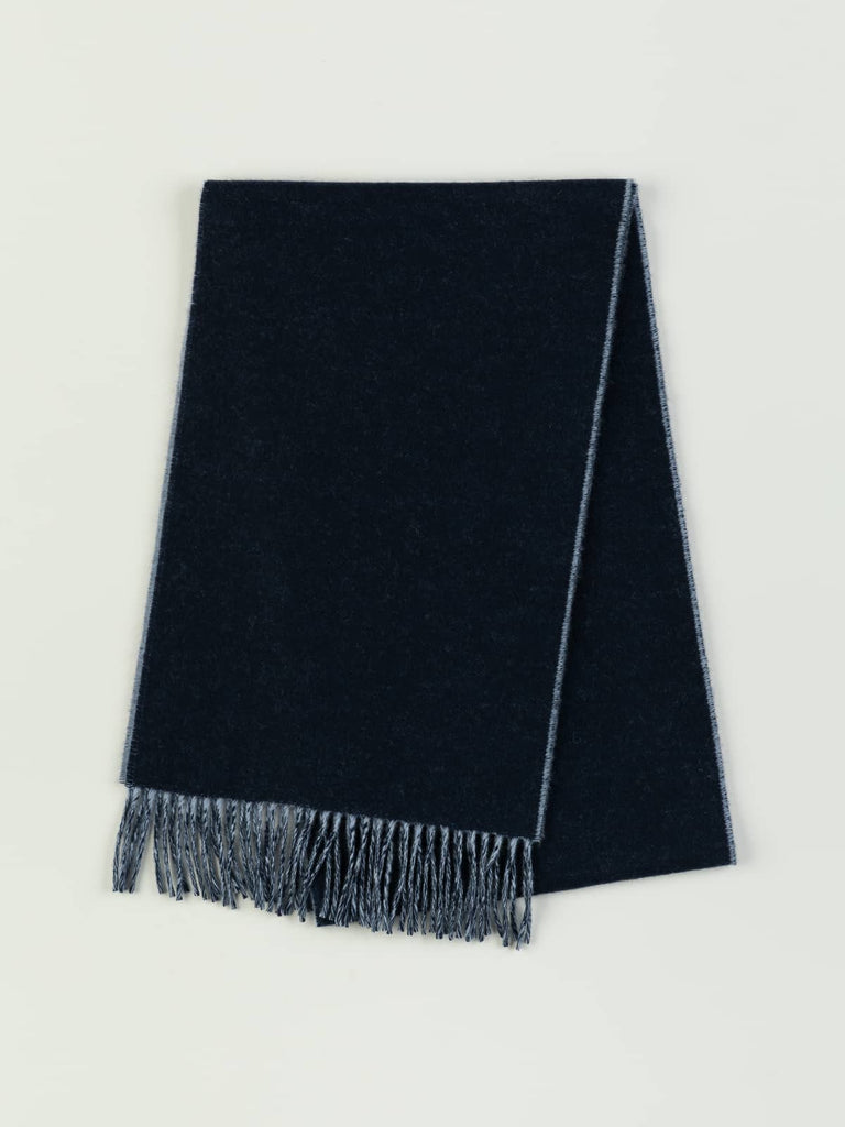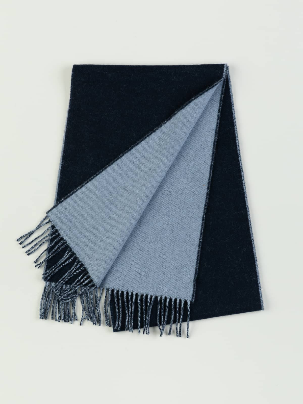 Elegant contrast defines this piece, midnight navy on one side and morning sky blue on the other. The shift between dark and light feels tranquil and striking, capturing cashmere’s blend of softness, depth and clarity.