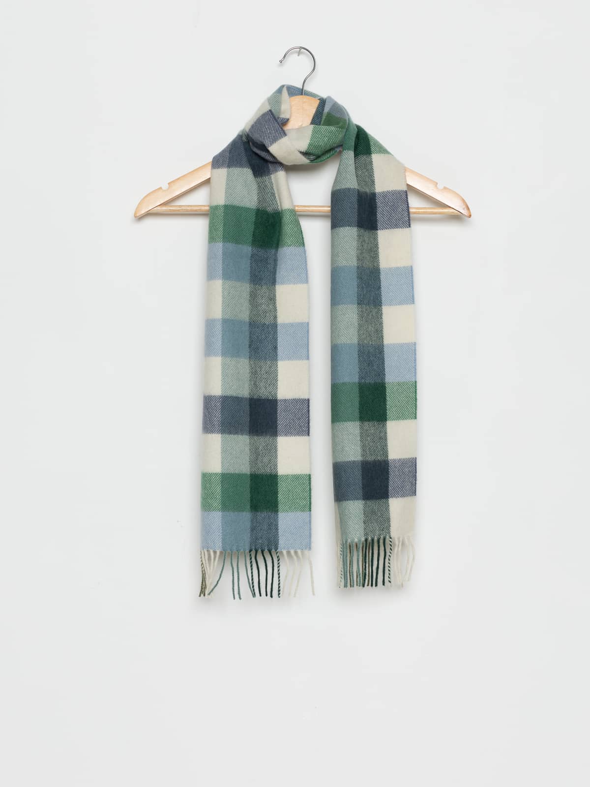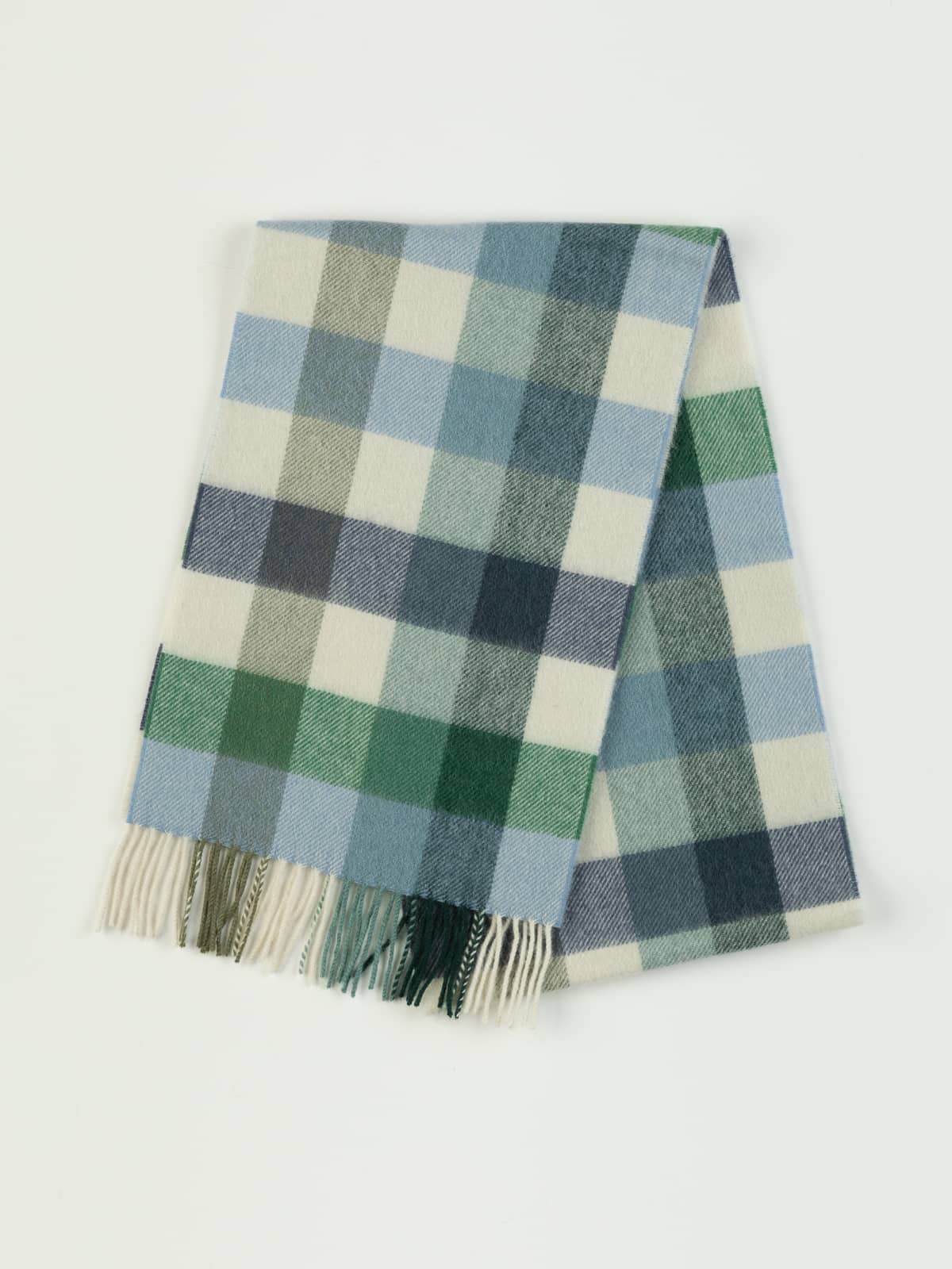 Blending sea-mist blue, pine green, and cream, this bold check pattern feels both crisp and serene, like standing where the Yorkshire moors meet the North Sea cliffs. The soft interplay of land and sky tones gives it an easy, timeless charm, perfect for both countryside walks and city days. Crafted from pure cashmere, it wraps you in the gentle warmth and natural calm of the northern landscape.